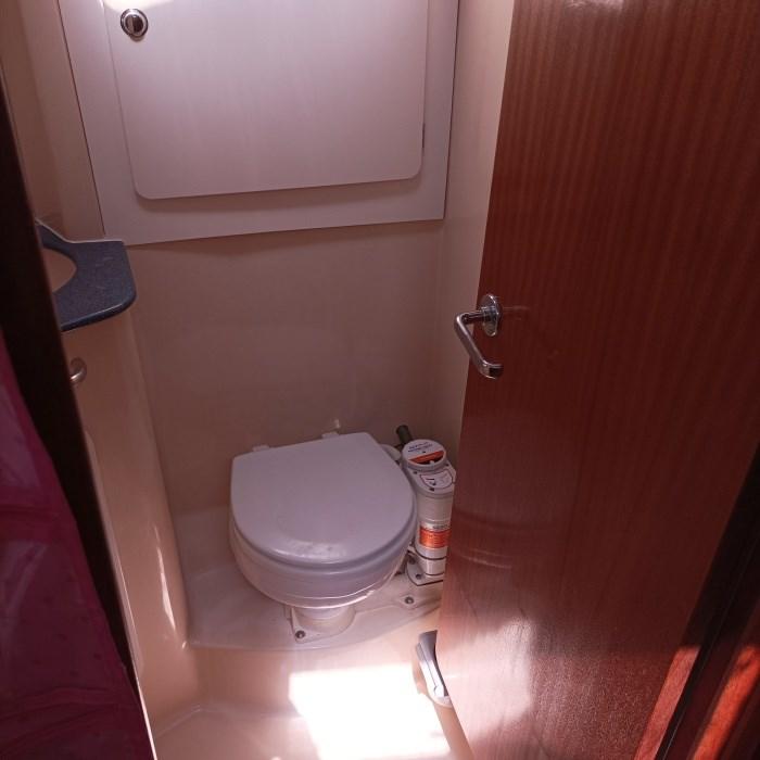 Cabine principale avec lit double et salle de bain privée avec lavabo, toilettes électriques et douche