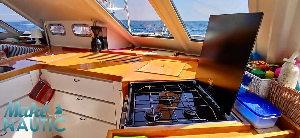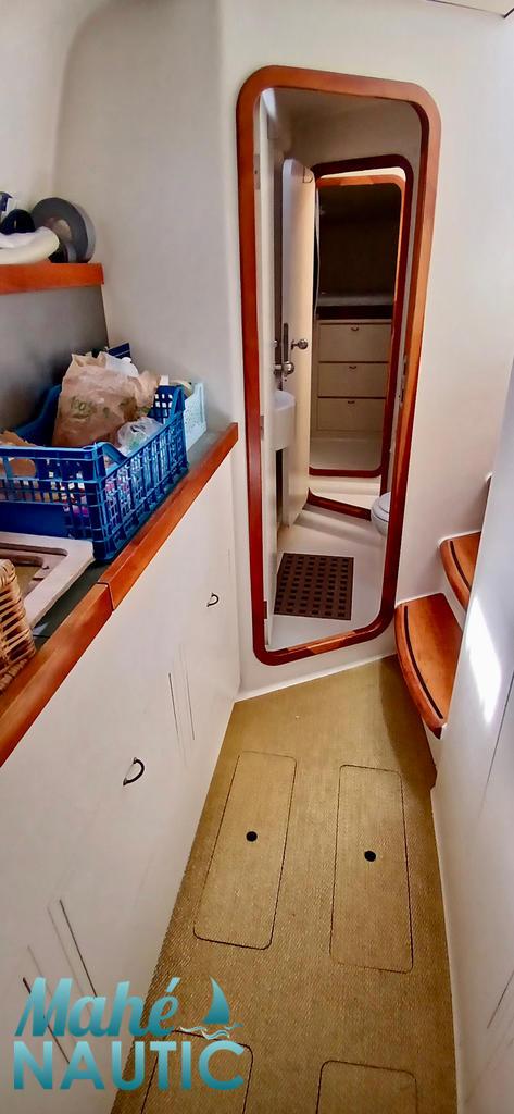 Multicoque rassurant, facile à utiliser et éprouvé en haute mer. 4 cabines doubles, grand carré et grand cockpit. Equipement grande croisière avec de belles moyennes.