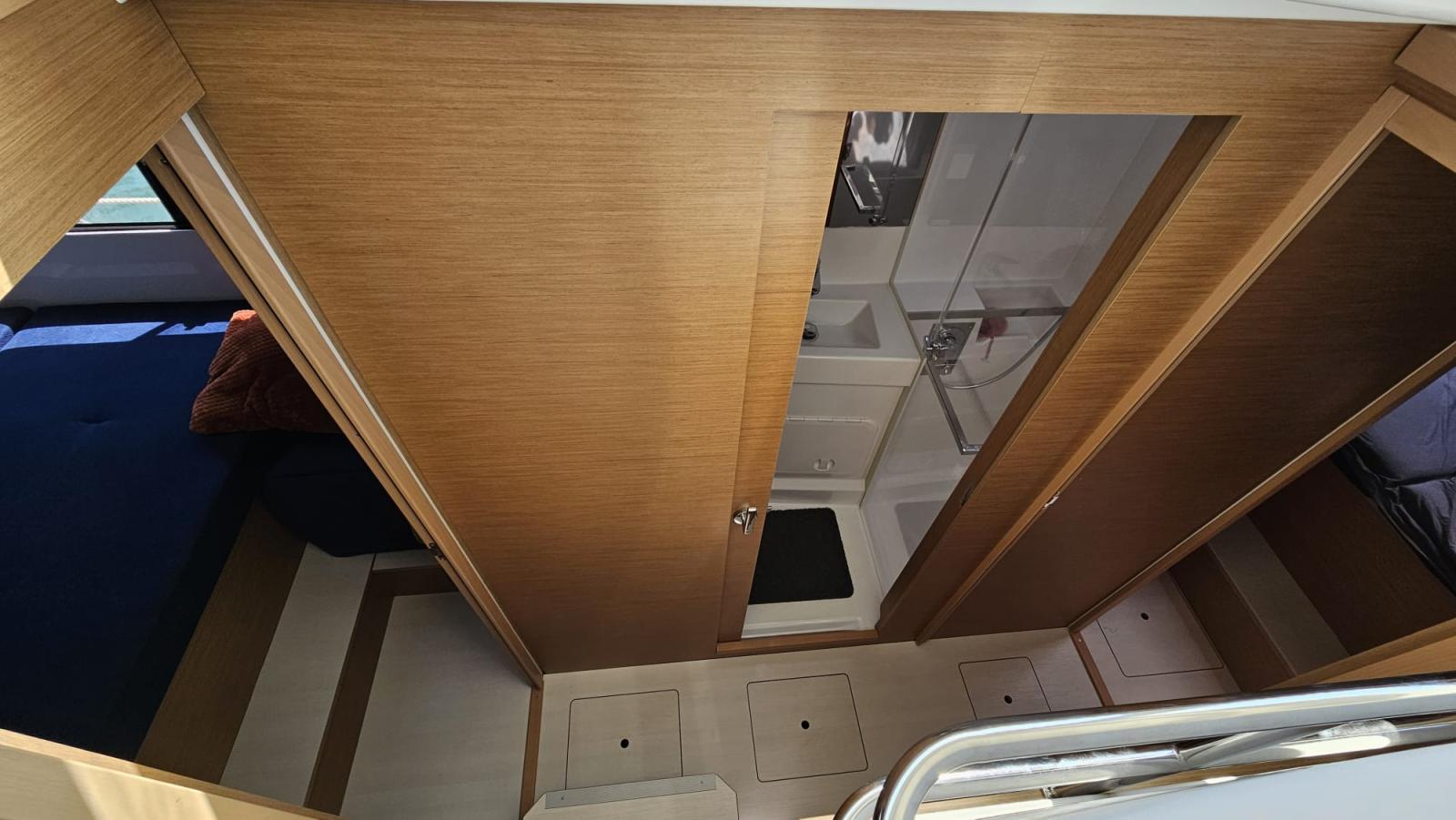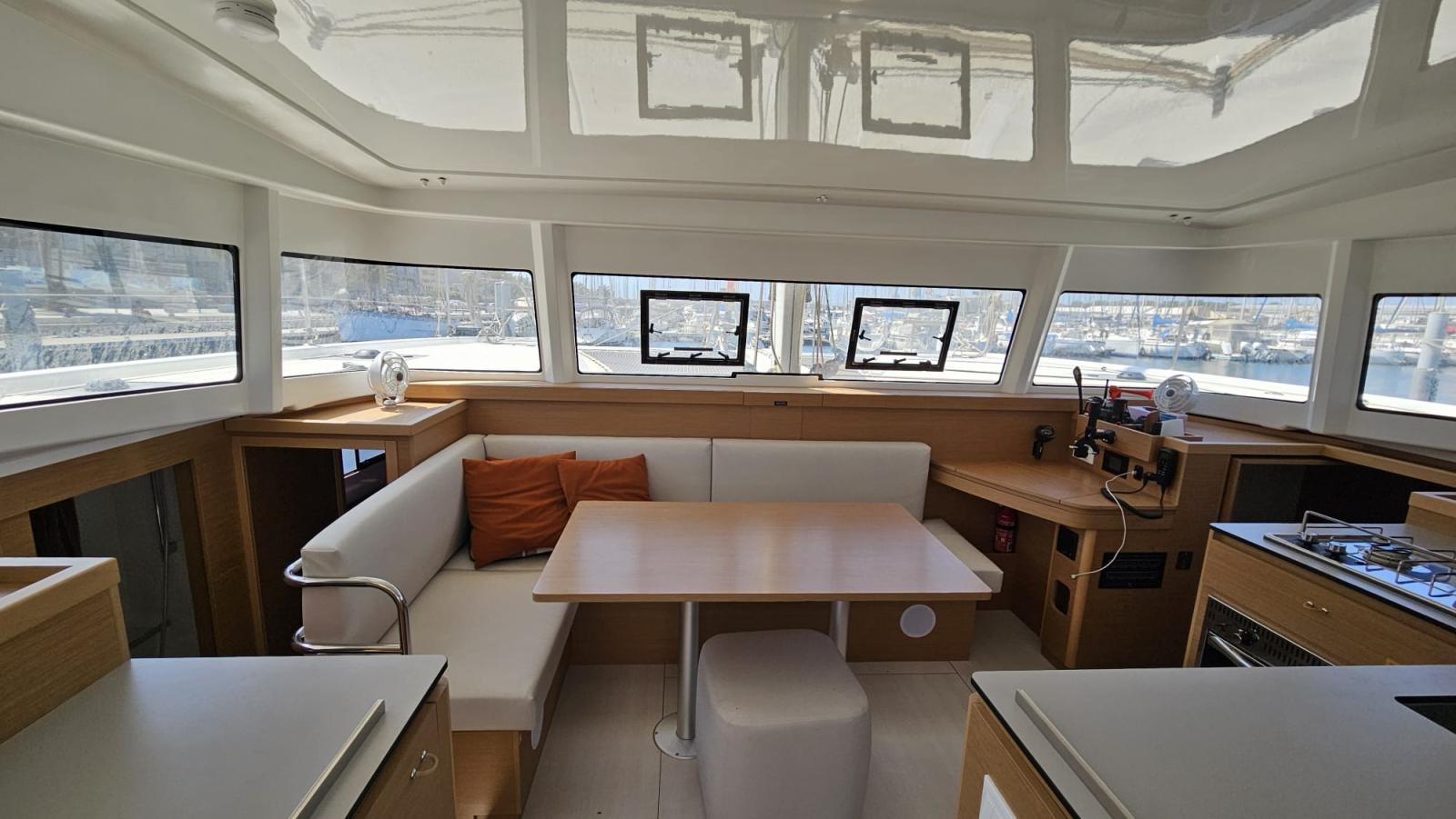 Equipmement: Pack Fleet Up (dont balcons avant et filières, aménagement pointe avant babord, couchette double dans le carré, ventilateurs dans carré et cabines, réserve eau douce supplémentaire 300L, matelas bleus dans les cabines), Sellerie du carré PVC Weiss, Pulse Line, Winch électrique de manoeuvre tribord, Lazy-bag, 2ème siège barreur babord, Escalier d'accès au roof, Bossoirs inox et panneaux solaires 3*300W, Convertisseur 12-220 V (2KVA), Ecran Multifonction GARMIN 7 Pouces sur console de barre tribord, Pilote auto Garmin et télécommande de pilote , AIS 800 Garmin et VHF Garmin 315, Pompe de lavage de pont eau de mer - eau douce, Meuble haut de cuisine tribord, Meuble de rangement additionne babord, Coussins de cockpit gris et Bain de soleil de cokcpit arrière , Pack audio Fusion carré et cockpit, Pouf additionnel, Code 0 Stormlite + Bande UV sur emmagasineur, Fermeture arrière de cockpit, Taquets d'amarrage additionnels étraves.