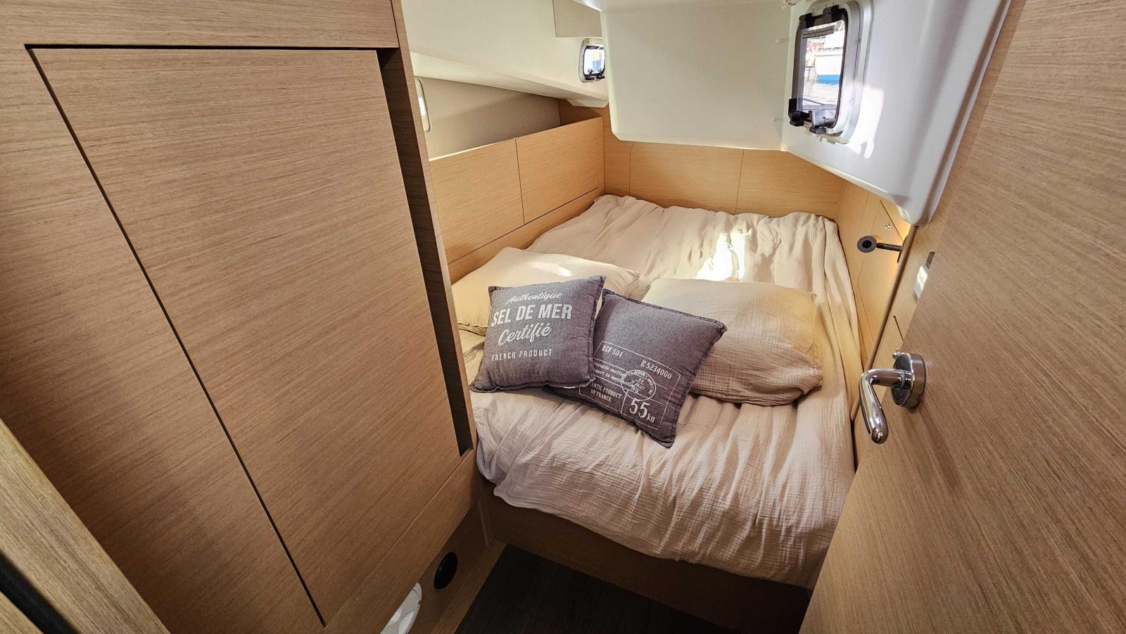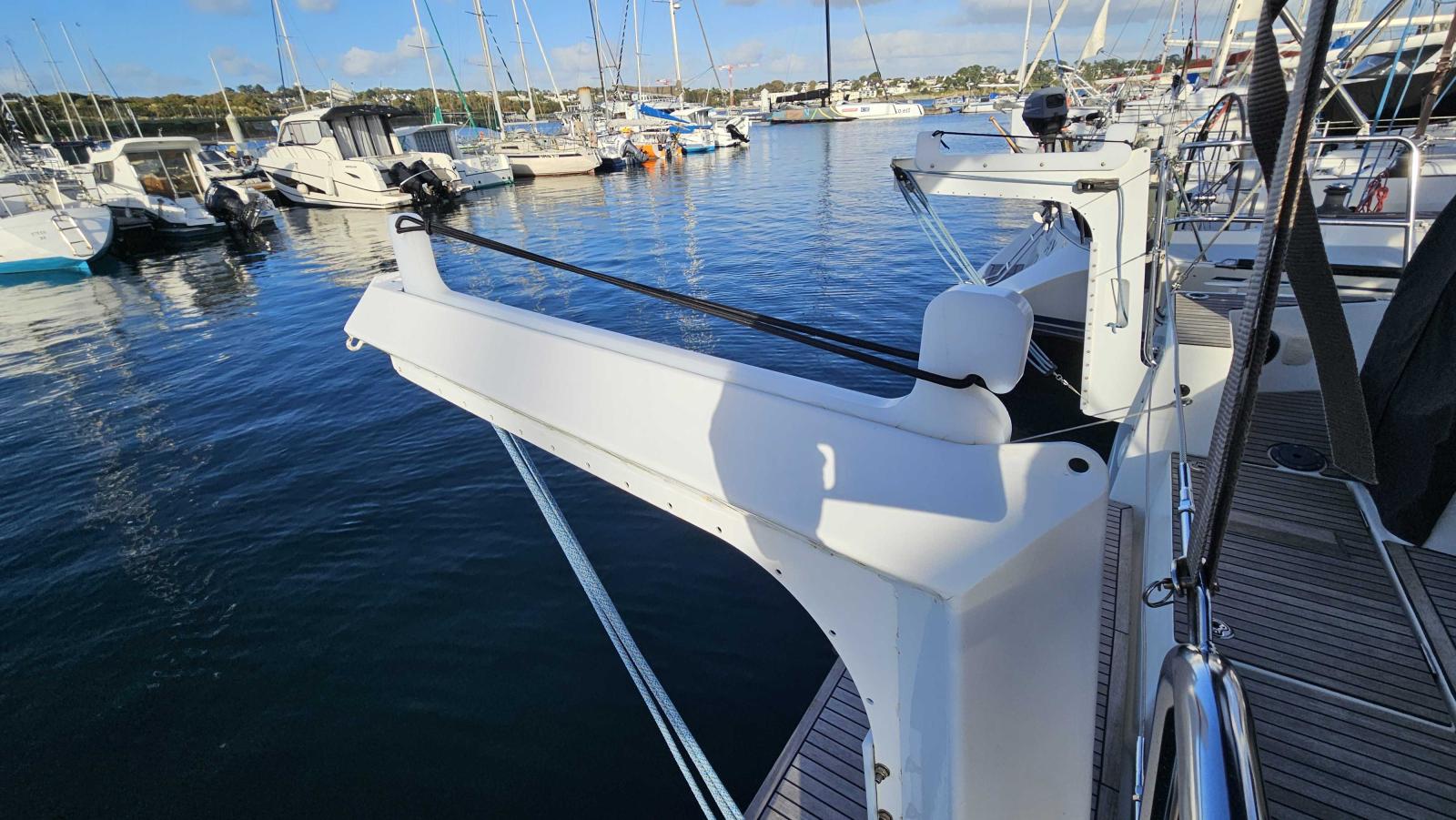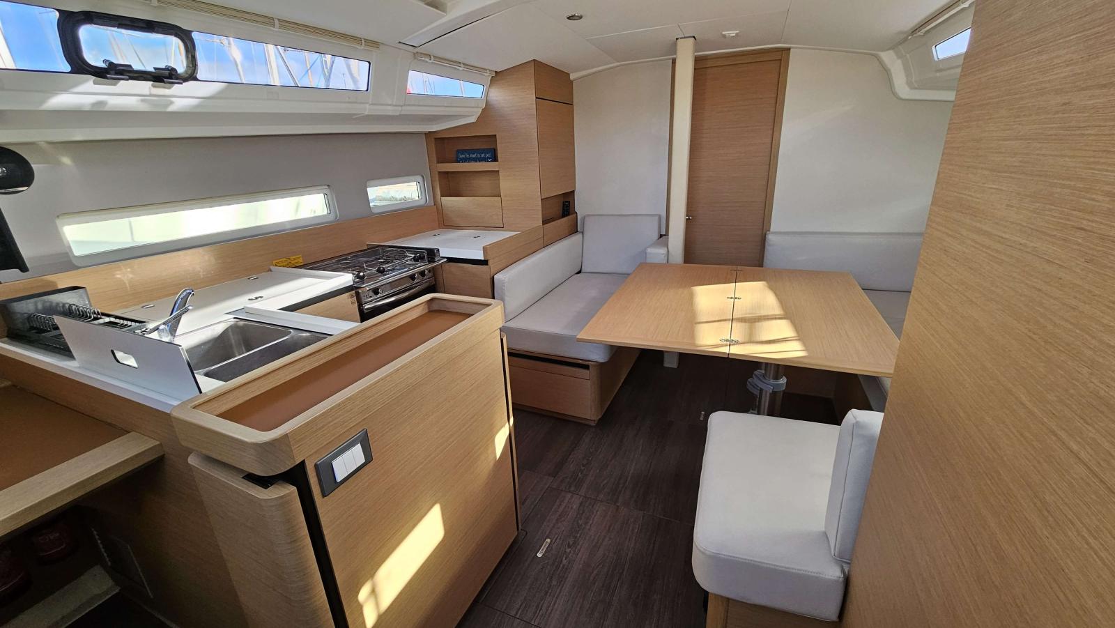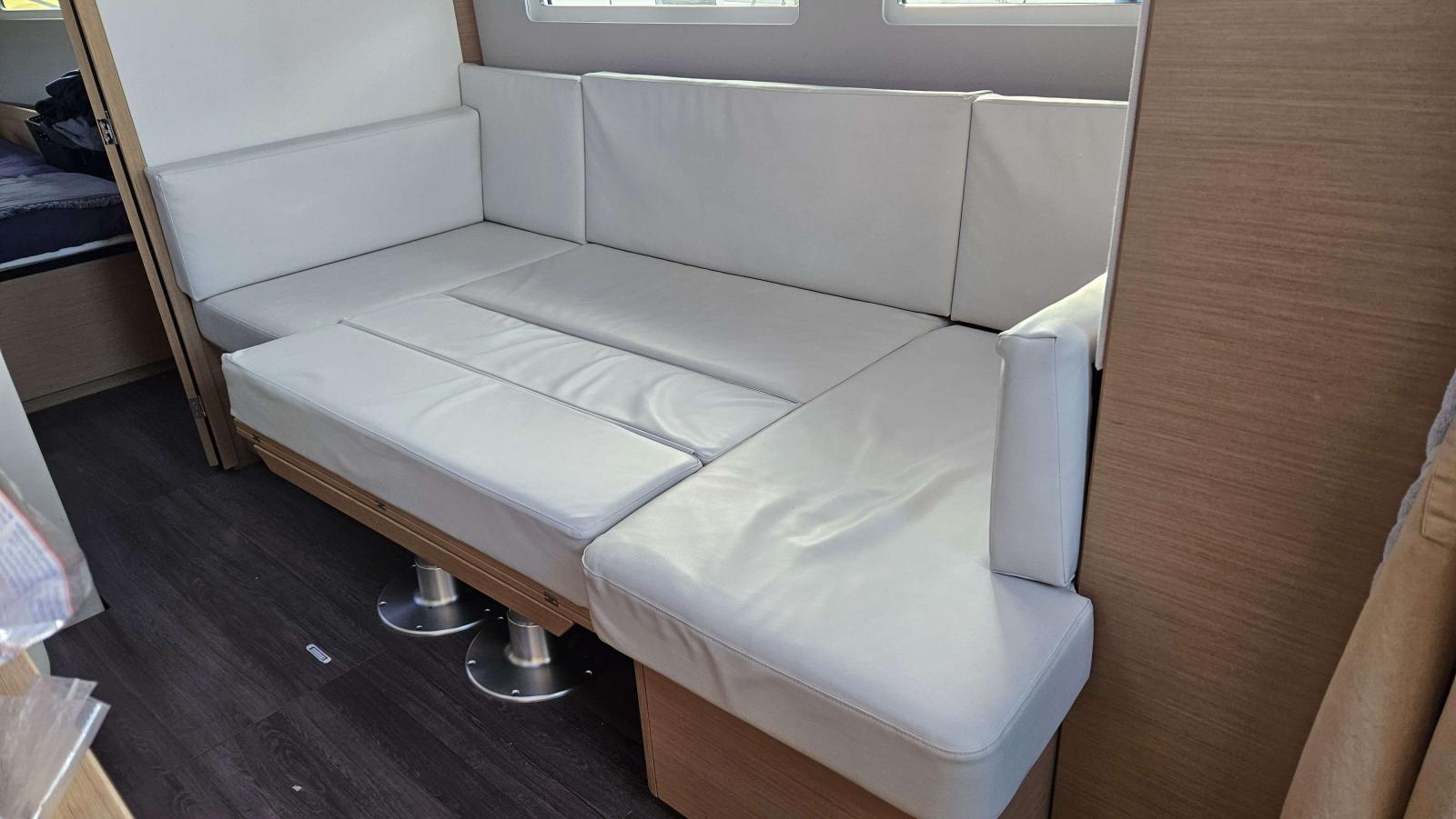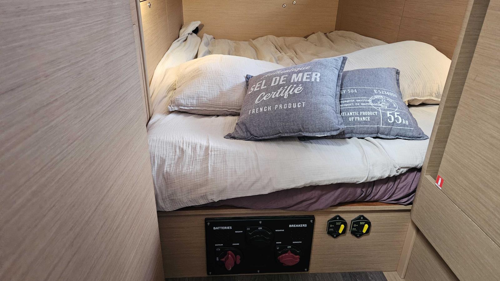 Delphinière polyester avec davier inox, double commande de guindeau 1000W + compteur, table cockpit luxe avec abattants polyester, portes dans filières, réservoir eau sup (200L), alimentation 230V, double prises USB dans cabines, écran supervision navicolor, capteur monitoring batteries, four luxe avec grille, 2 batteries sup 115A (soit 4 x 115A), Chargeur de batterie 60ah, 2 sacs drisses dans le cockpit, Eclairage intérieur indirect led, Appliques d’ambiance avec abat-jour, Eclairage led fond de cockpit, Porte verticale de frigo (porte secondaire), Vaigrages de cloisons capitonnées dans le carré, Horloge et baromètre à la table à carte, Stores pour panneaux et vitrages, Sellerie ambiance Weiss