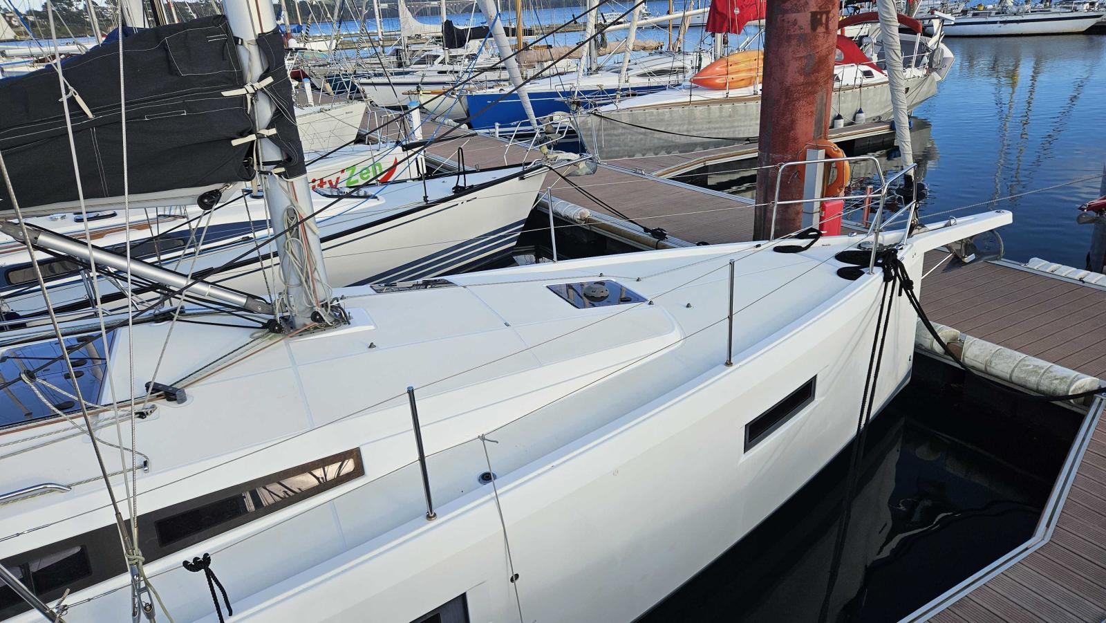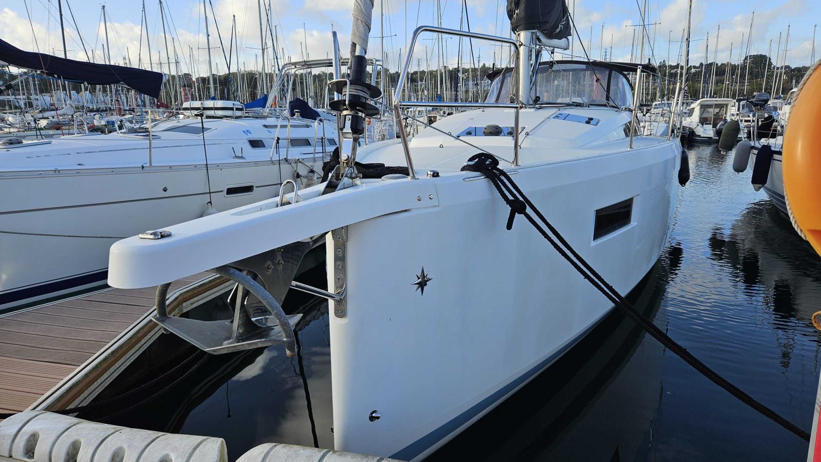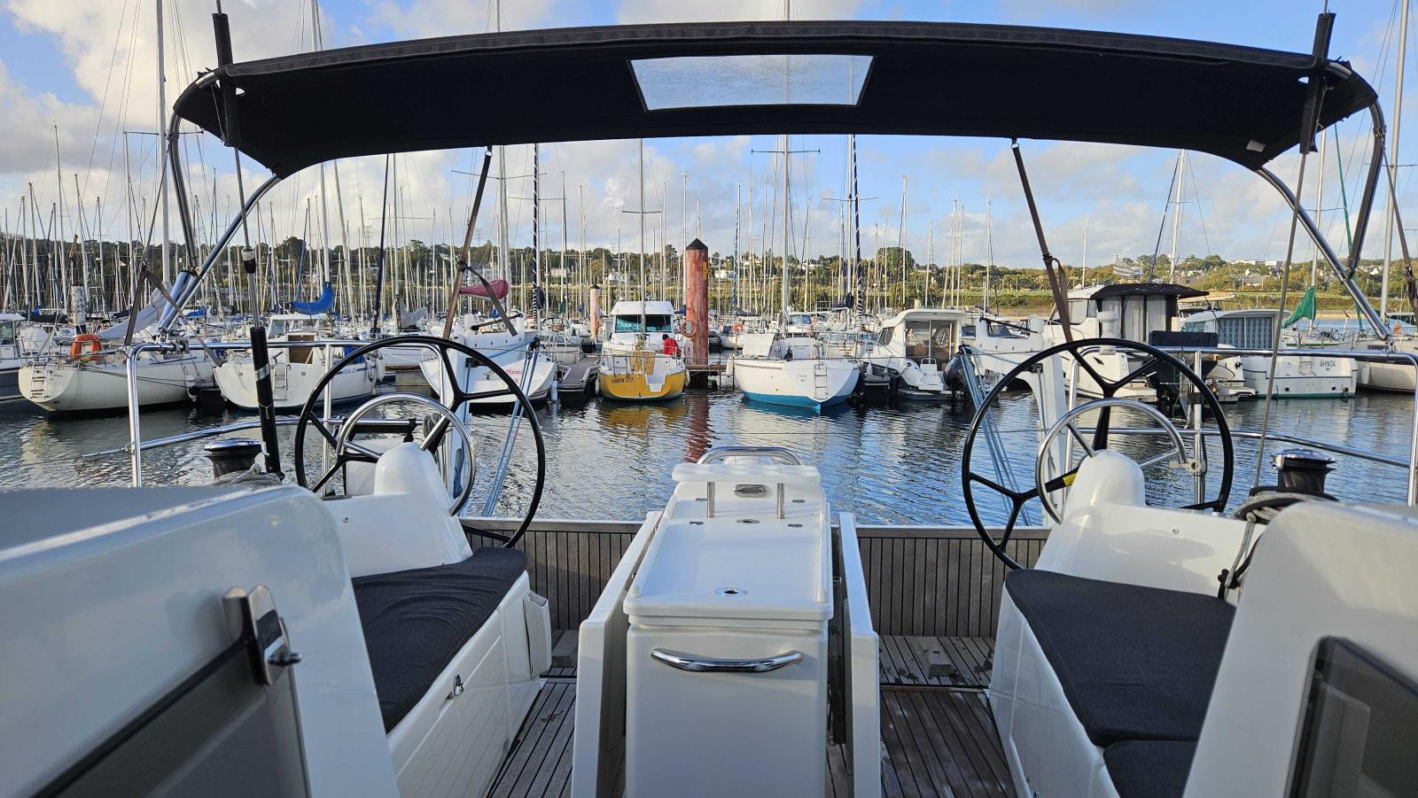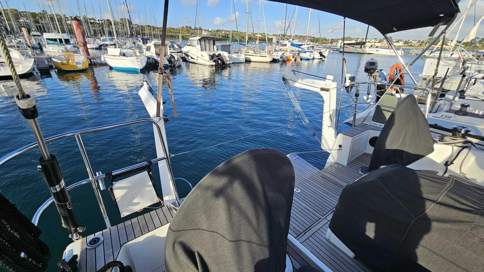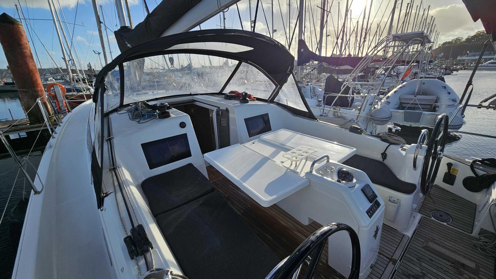 Capote de roof haute transparence avec lampe a led (gris anthracite), Chauffage air pulsé (fuel), Fond de cockpit teck + assises, Hélice 3 pales repliable, Housses barres à roue (gris anthracite), Housse table cockpit (gris anthracite), Pack Cruising