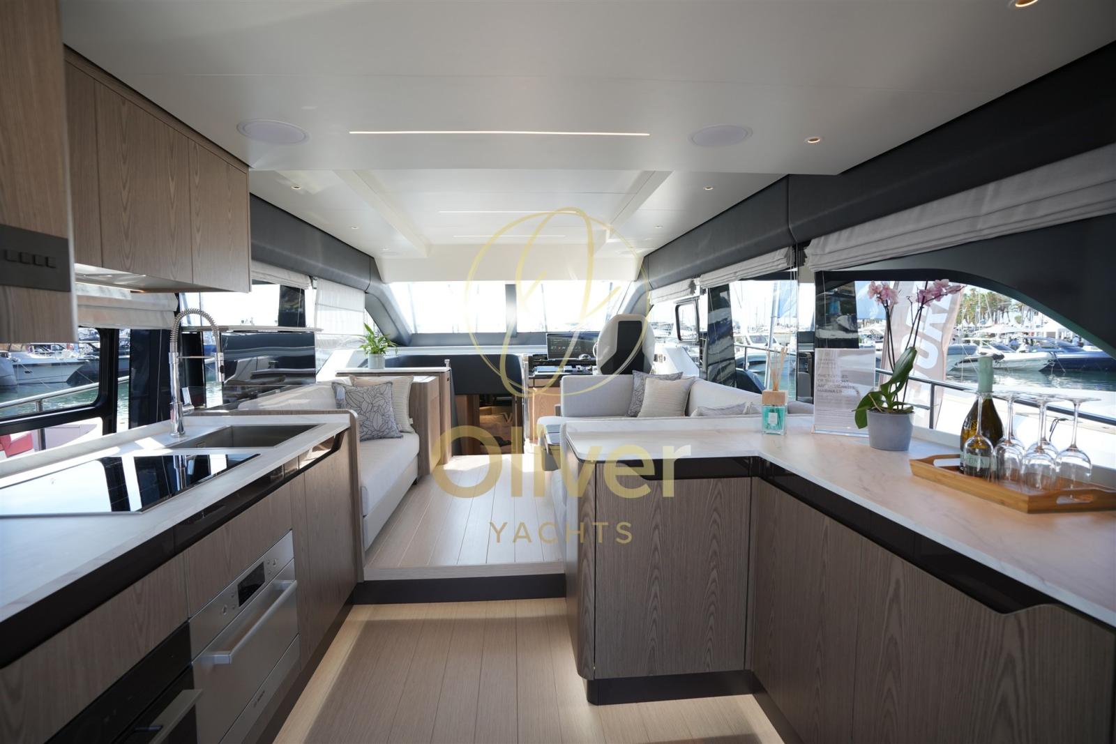 Les intérieurs de la Sessa Marine F60 représentent la synthèse parfaite de l’élégance contemporaine, de la fonctionnalité et du confort. L’aménagement du pont principal se distingue par l’aménagement convivial du salon, où la cuisine ouverte s’intègre à l’espace de vie, éclairé par de grandes fenêtres panoramiques qui garantissent une vue continue sur la mer. L’atmosphère est sophistiquée mais accueillante, rehaussée par des matériaux haut de gamme, des essences naturelles et des détails soignés selon la meilleure tradition artisanale italienne.
