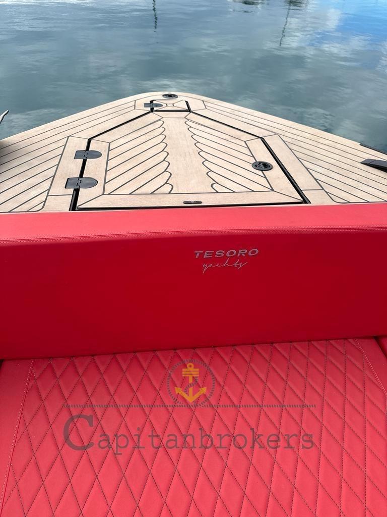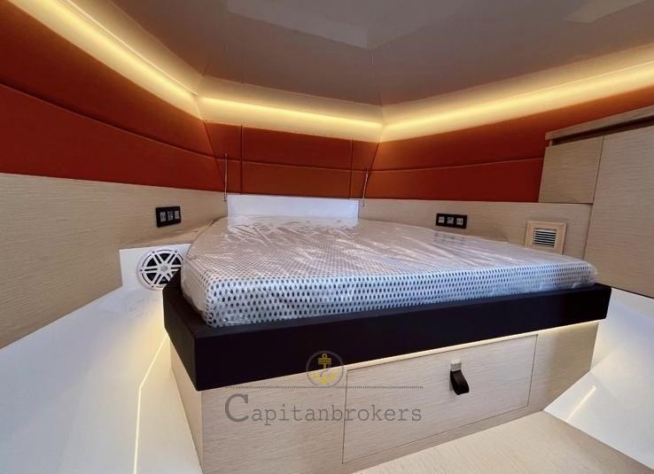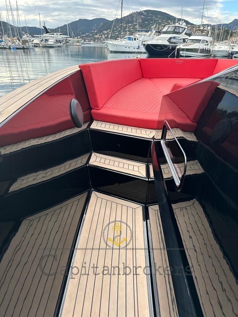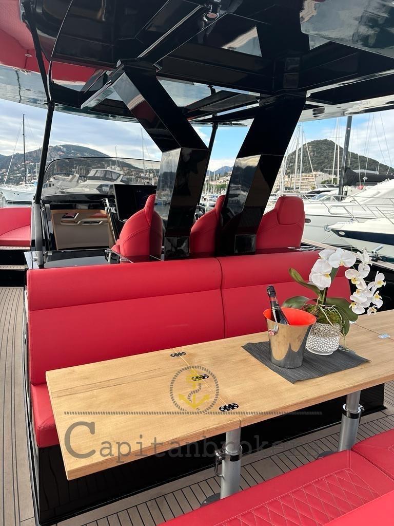 Feux LED Hardtop, connexion 12V et USB, sellerie intérieure, extérieure et du siège du pilote de couleur rouge, housses, coque et rouf avec peinture noire, manettes des gaz électroniques au mercure.