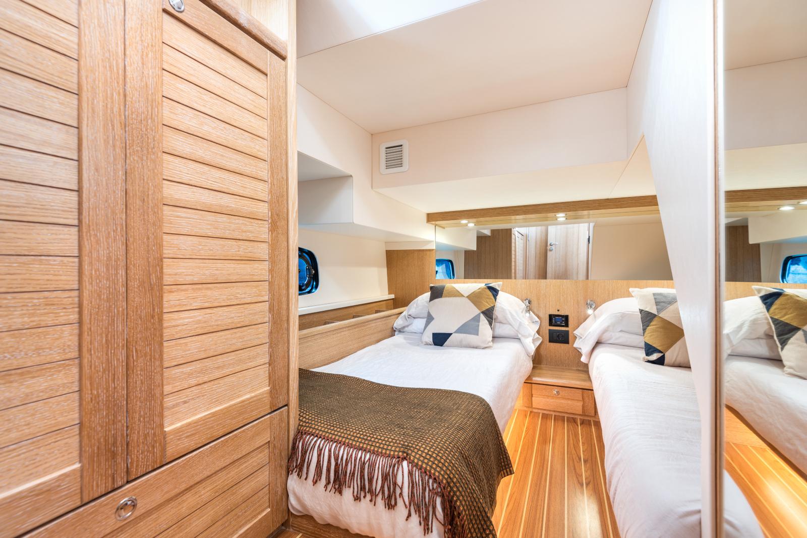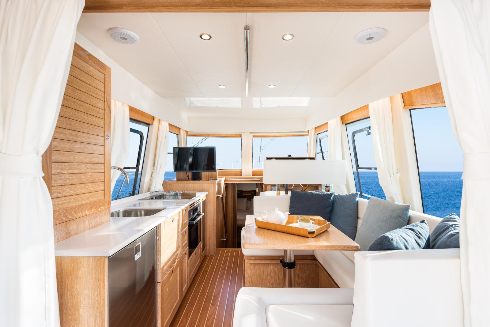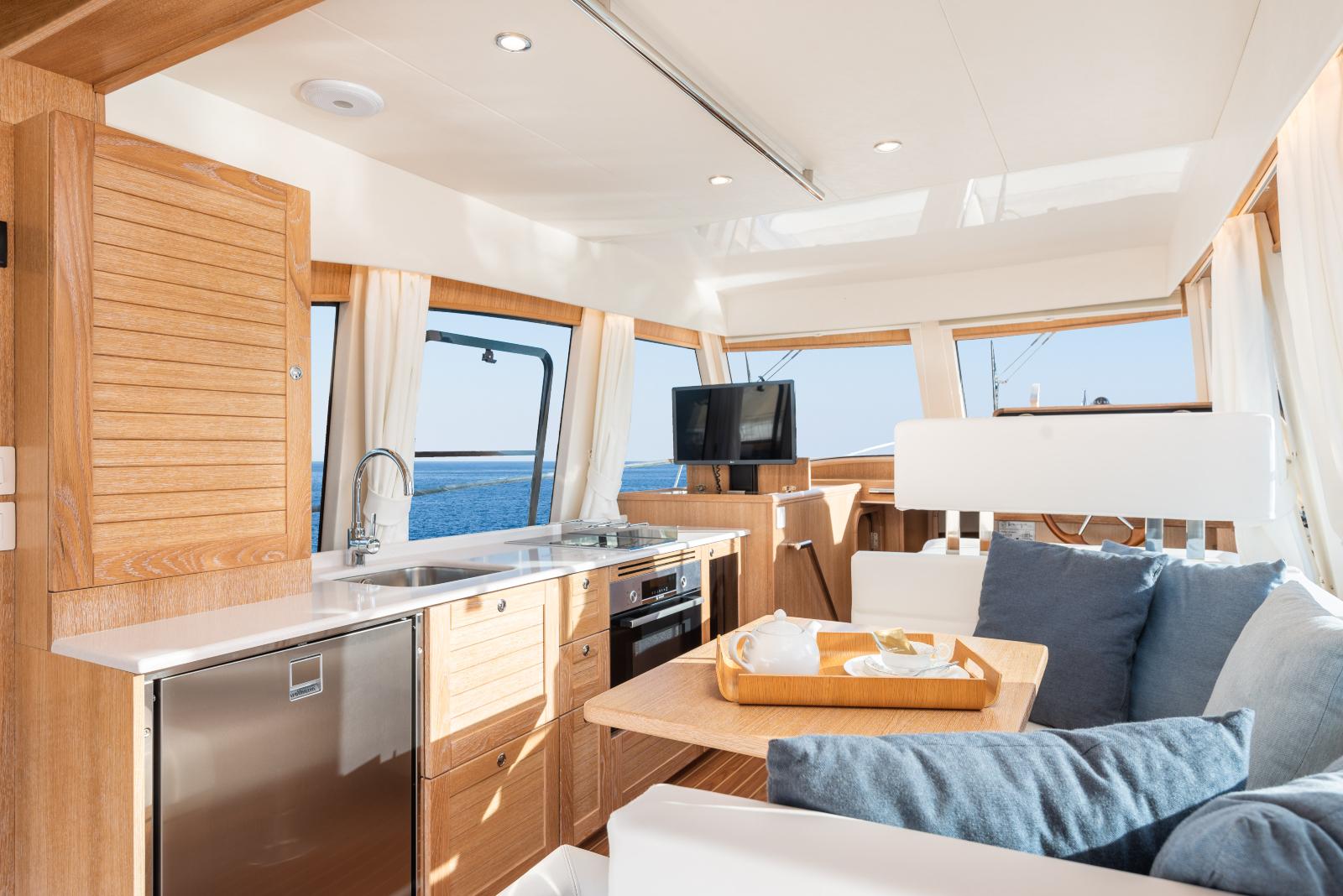 L’intérieur du Menorquin 42 est un véritable havre de paix. Avec un agencement réfléchi, il peut accueillir jusqu’à six personnes. Le salon, lumineux et accueillant, est équipé d’une cuisine fonctionnelle et d’un coin repas. Les cabines, confortables et bien aménagées, garantissent une nuit paisible en mer.
