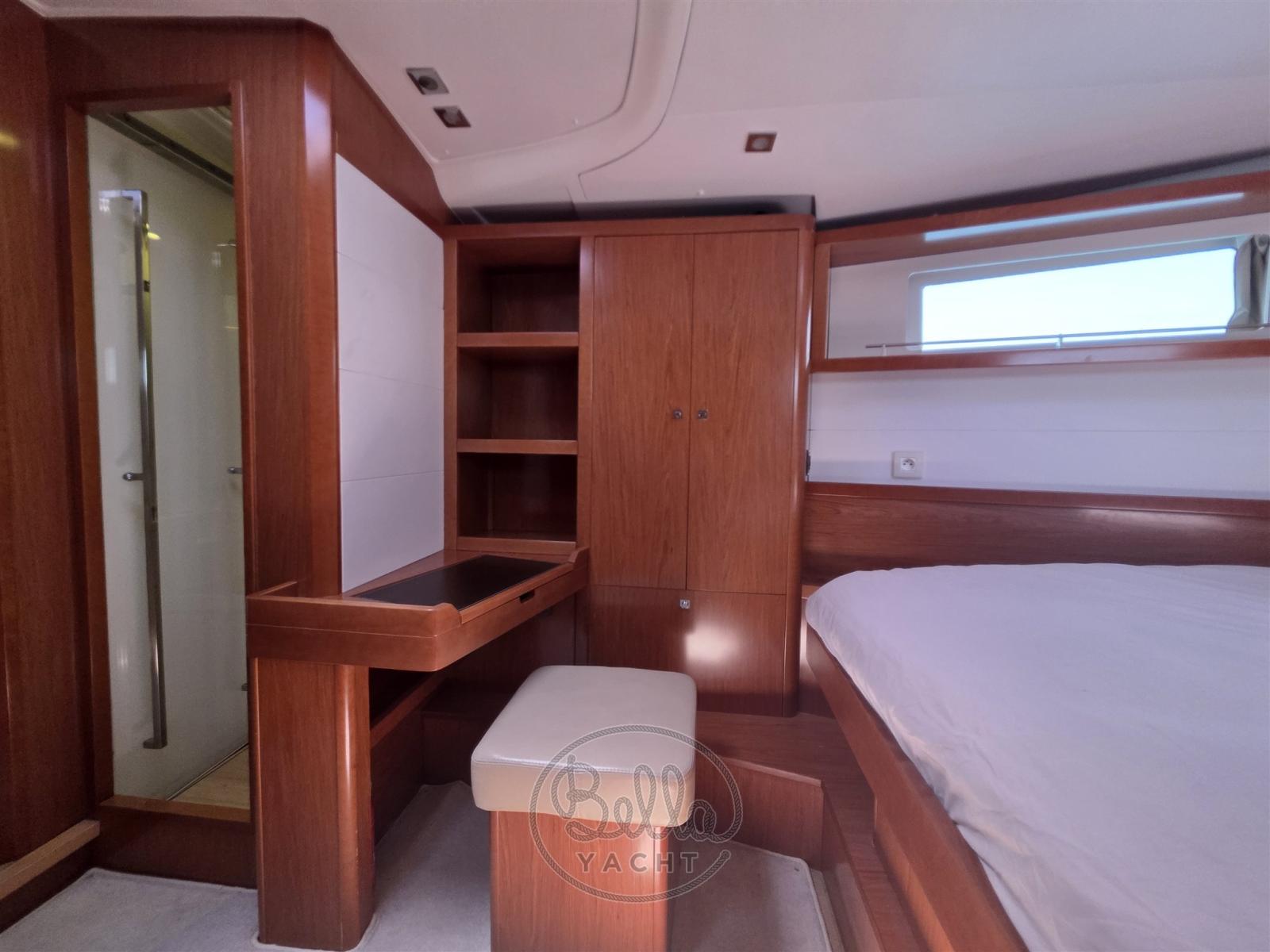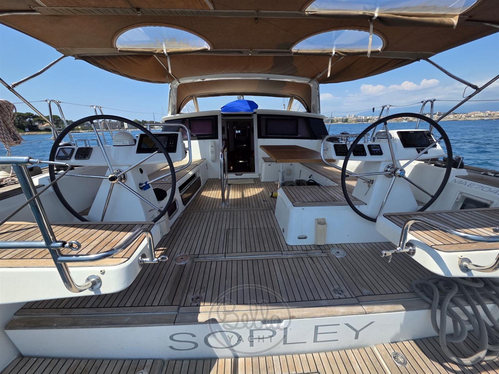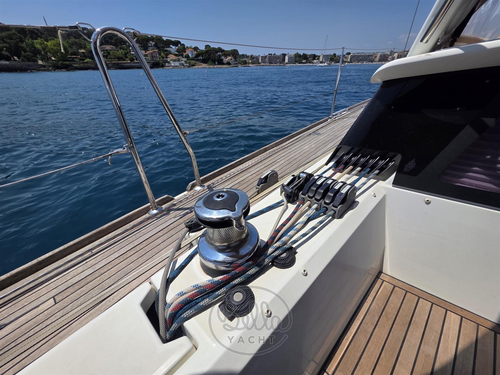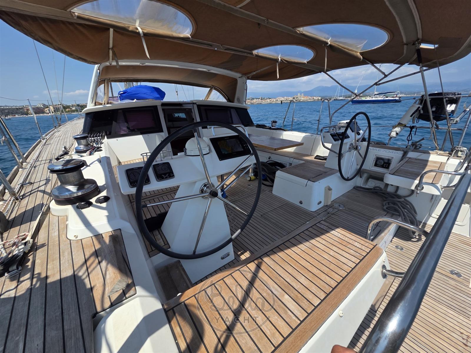 Alarme moteur, Eau sous pression, Passavant en teck, Douche de cockpit (calda e fredda), Double barre à roue, Moteur d'annexe, Cockpit en teck, Prise de quai, Rollbar, Guindeau électrique, Gréement monotoron, Echelle de bain, table de cockpit, Annexe, Filières avec sortie latèrale, Pont en teck, 4 Winch électrique.