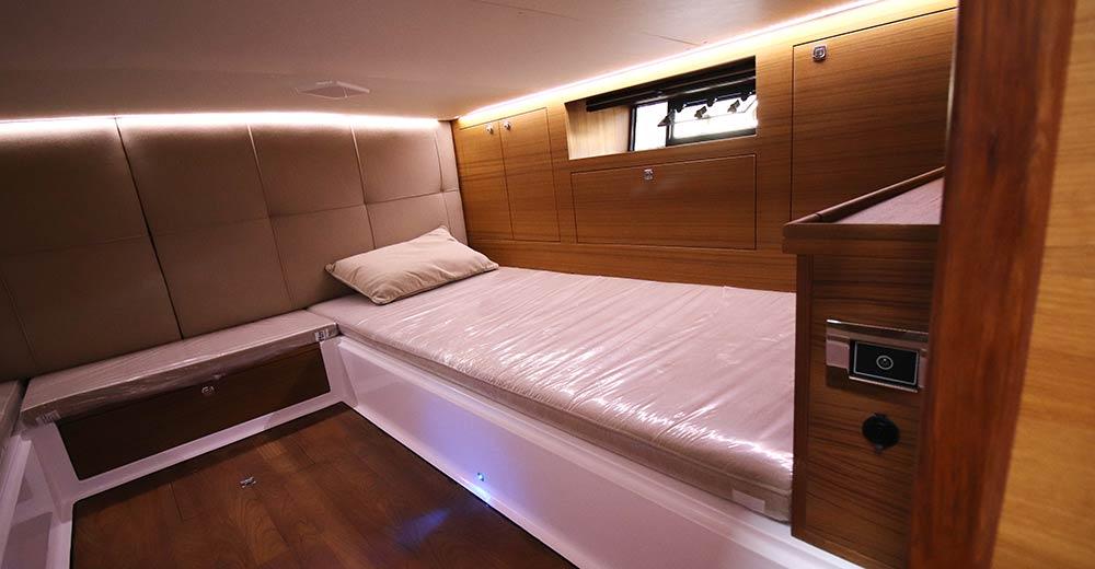 Pont et cockpit en Teck, plats-bords et plat-bord en Teck brut, siège pilote, porte d'entrée en Teck, bouches d'aération de la salle des machines en inox, rails de proue et de poupe en inox et Teck, pare-brise en plexiglas, davier en acier, crochet d'accostage, porte-drapeau, coussins bain de soleil, système de distribution d'eau avec autoclave, douche à l'arrière et à l'avant, treuil électrique, système anti-incendie, armoire de cuisine avec évier et réfrigérateur, canapé équipé d'une table réglable en teck, grande terrasse arrière avec casier en dessous, plate-forme arrière à l'intérieur VTR, nom du navire en acier inoxydable.