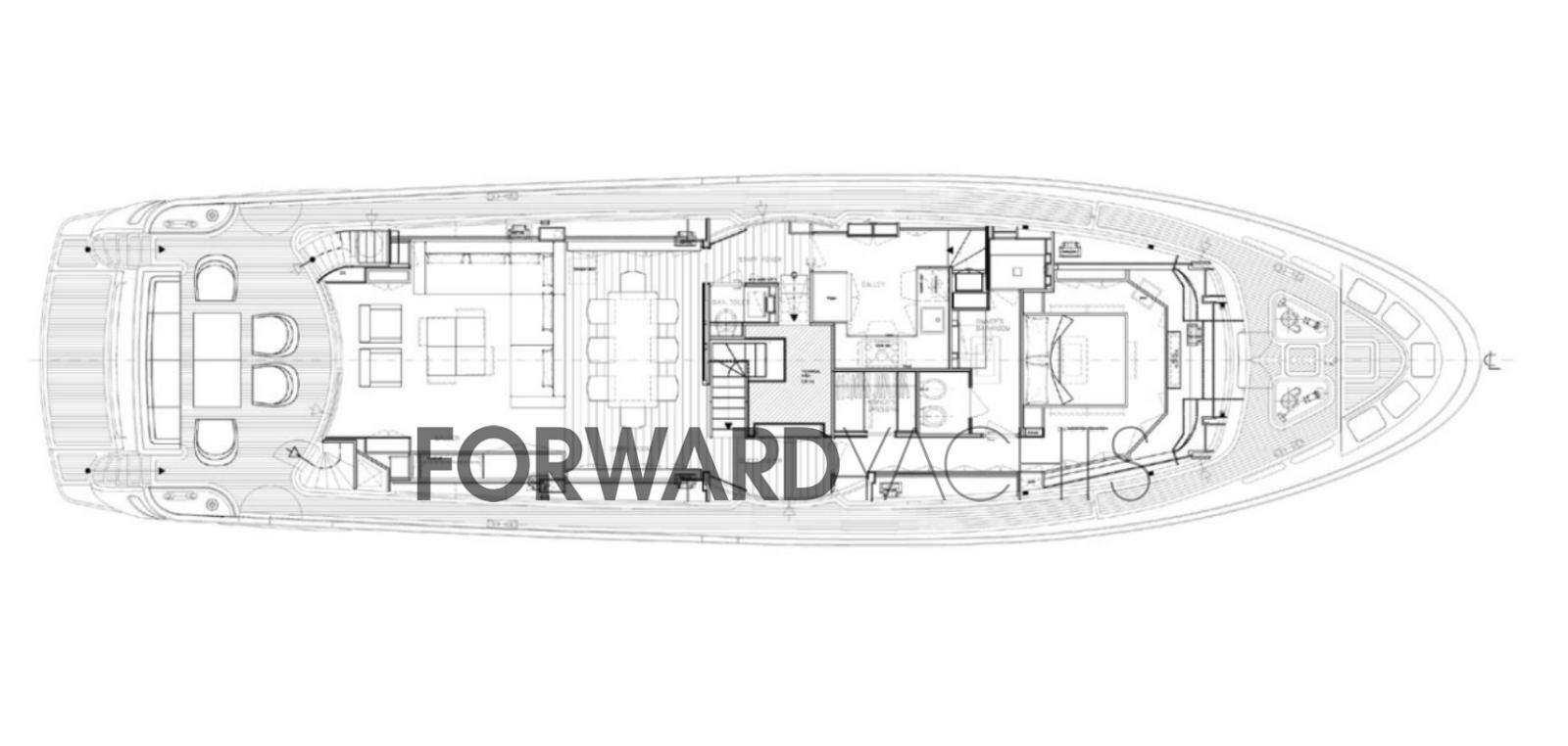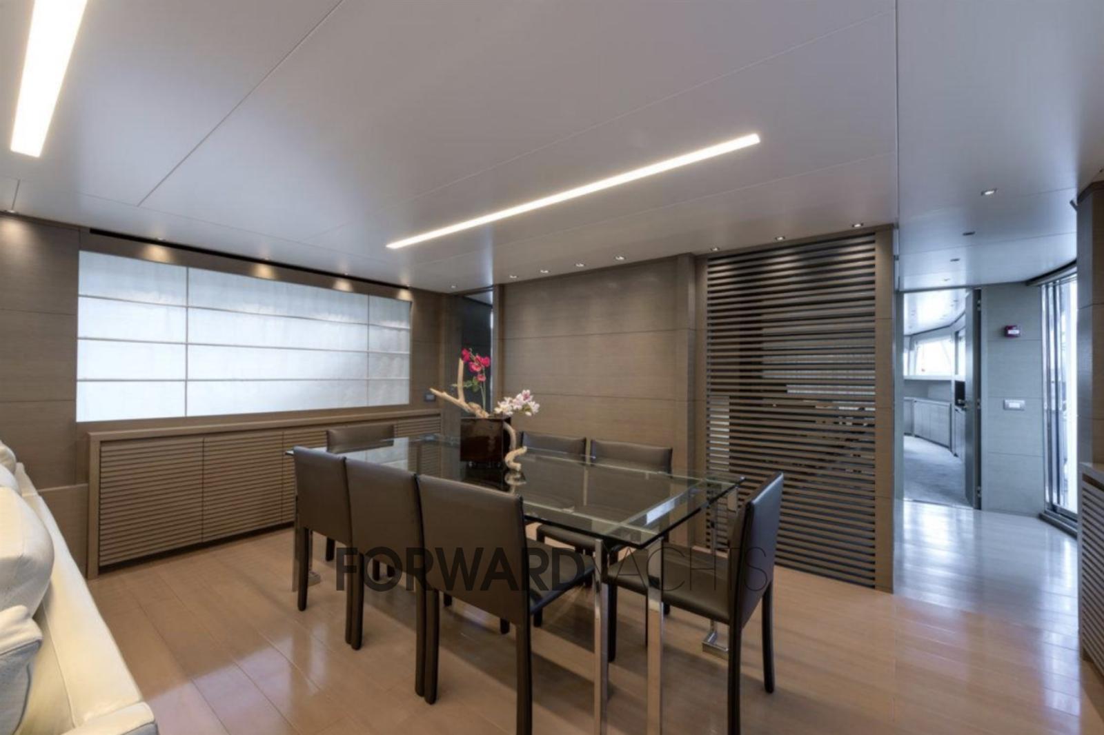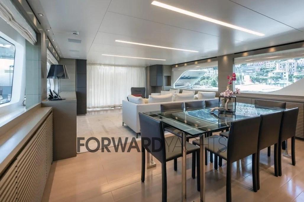 Les grandes fenêtres sur le pont principal garantissent la luminosité et un contact constant avec la mer, le salon principal, grand et lumineux, abrite un salon avec des canapés et une salle à manger séparée.