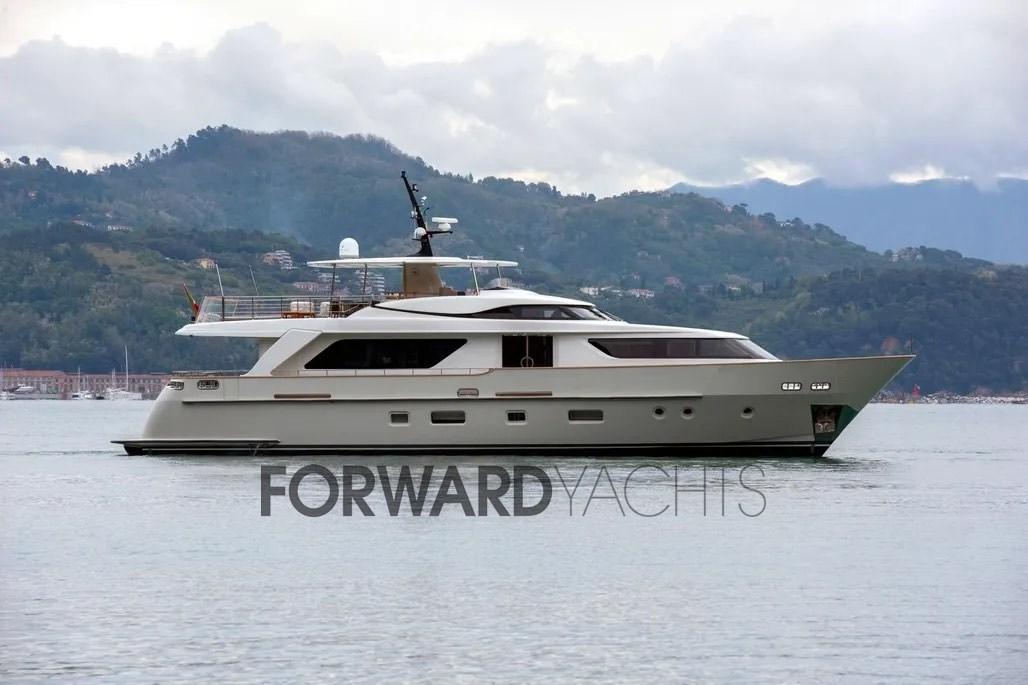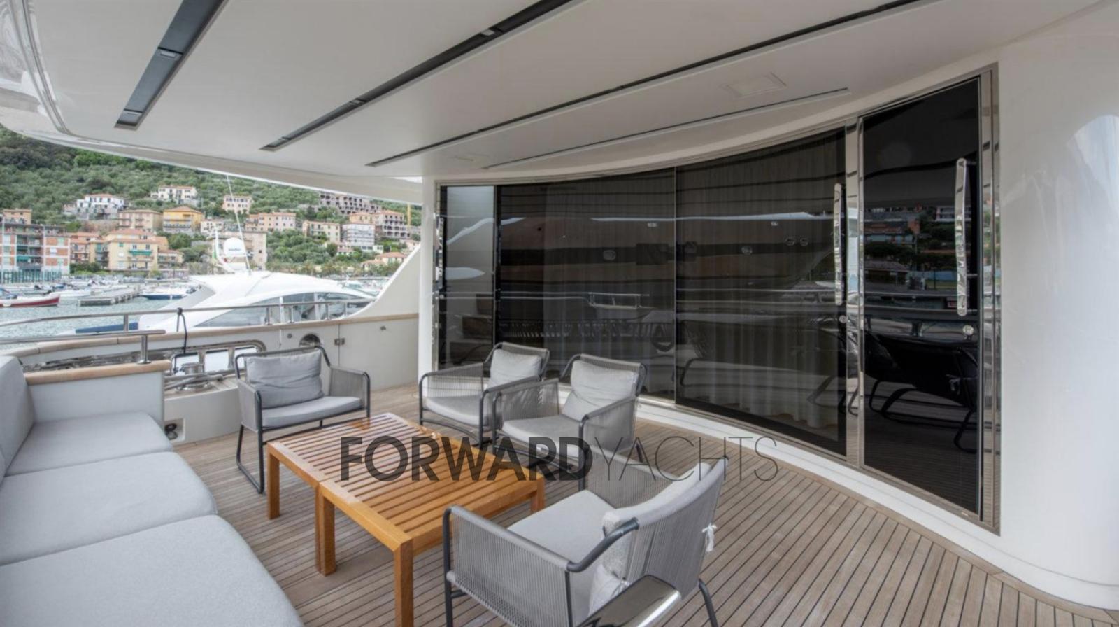 2 Ancre, Passavant en teck, 2 Chargeur de batterie, Propulseur de poupe (idraulica), Propulseur d'étrave (elettrica), Flaps hydrauliques, Garage à annexe, Hard top, Spots sous-marins, Passerelle (idraulica), Pont en teck, Cockpit en teck, Connexion eau sous pression à quai, Guindeau électrique, Stabilisateurs (a pinne), table de cockpit.