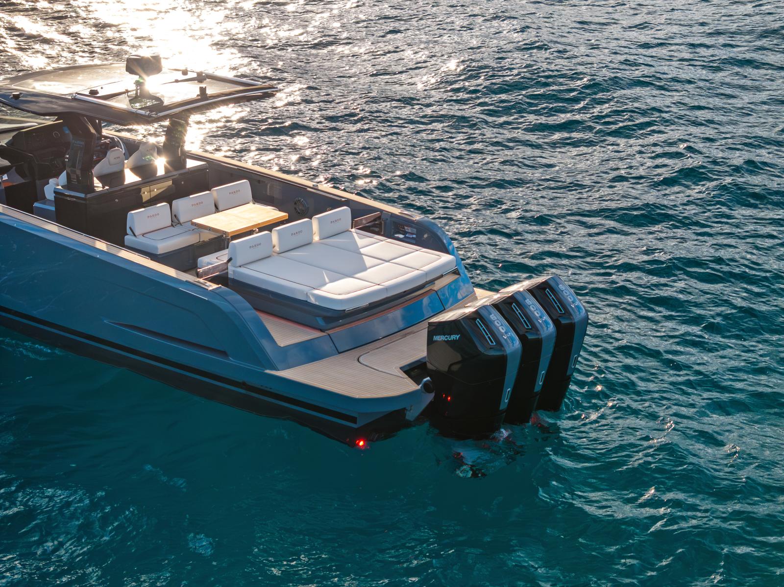 Le Pardo 43 R est le day cruiser idéal pour ceux qui recherchent performance et élégance à Saint-Tropez. Version hors-bord du modèle iconique, il associe design italien raffiné, confort haut de gamme et puissance exceptionnelle grâce à ses trois moteurs Mercury 600 ch, atteignant plus de 50 nœuds. Son design walkaround assure une circulation fluide et sécurisée sur un pont unique, avec de vastes espaces pour bronzer, déjeuner ou se détendre.