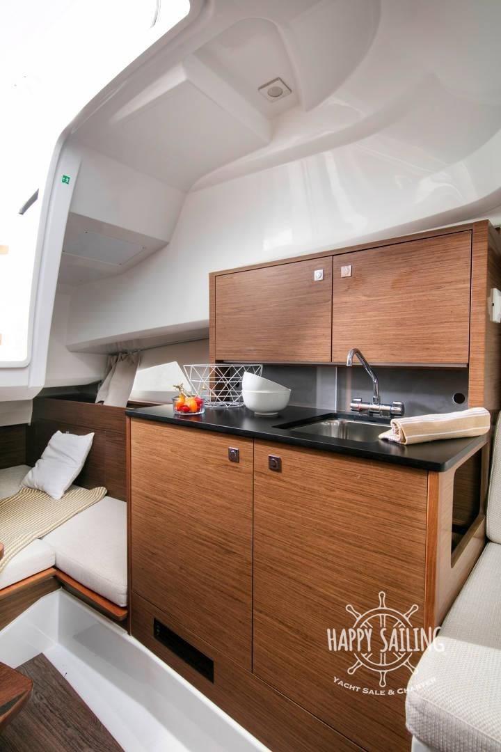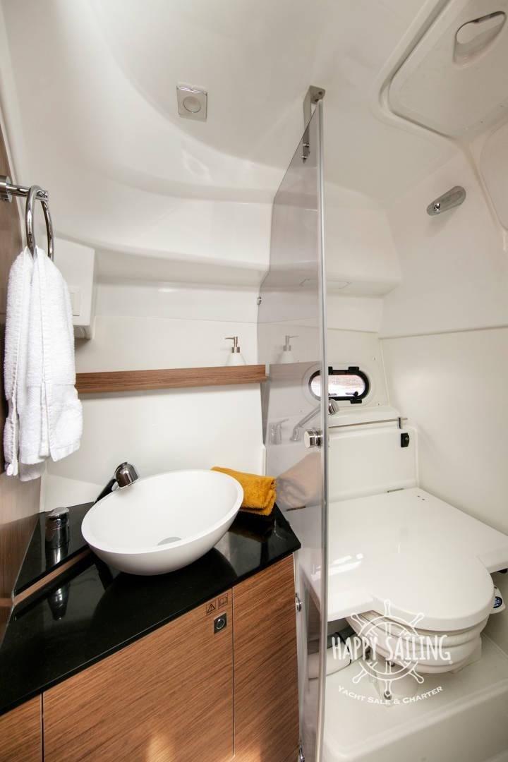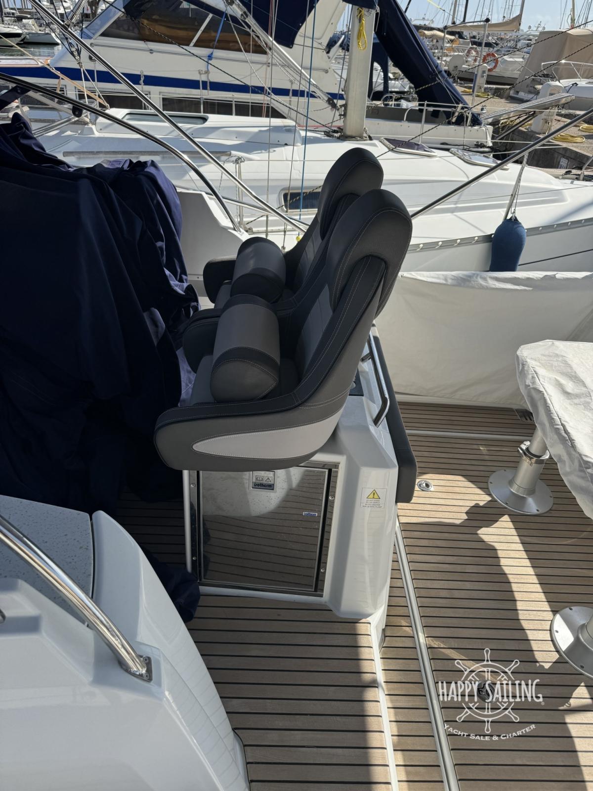 Eau sous pression, Douche de cockpit, Flaps électriques, Lavabo dans le cockpit, Éclairage de courtoisie, Défenses, Plateforme arrière, Cockpit en teck, Prise de quai, Guindeau électrique, Echelle de bain, table de cockpit.