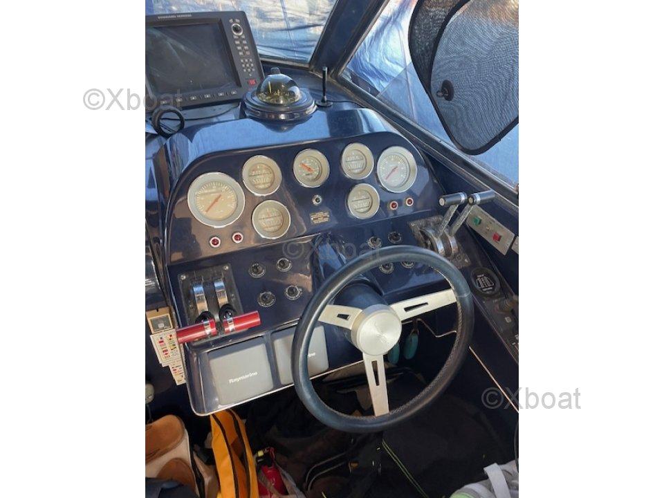 Un flybridge avec poste de pilotage et sellerie bain de soleil en bon état, plus bimini en inox repliable, installé, sans taud.
