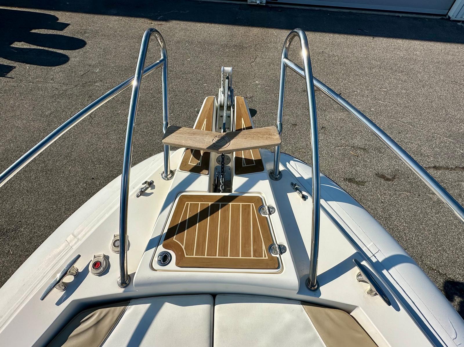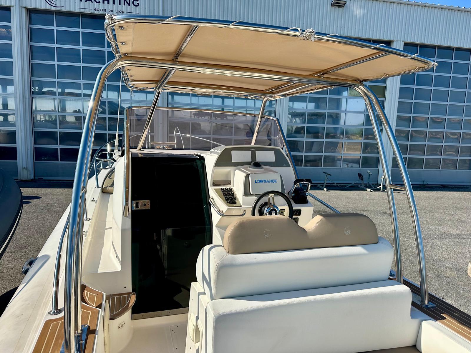Equipé avec une prise de quai, un mât de ski, un GPS/Sondeur Lowrance, une radio FUSION...