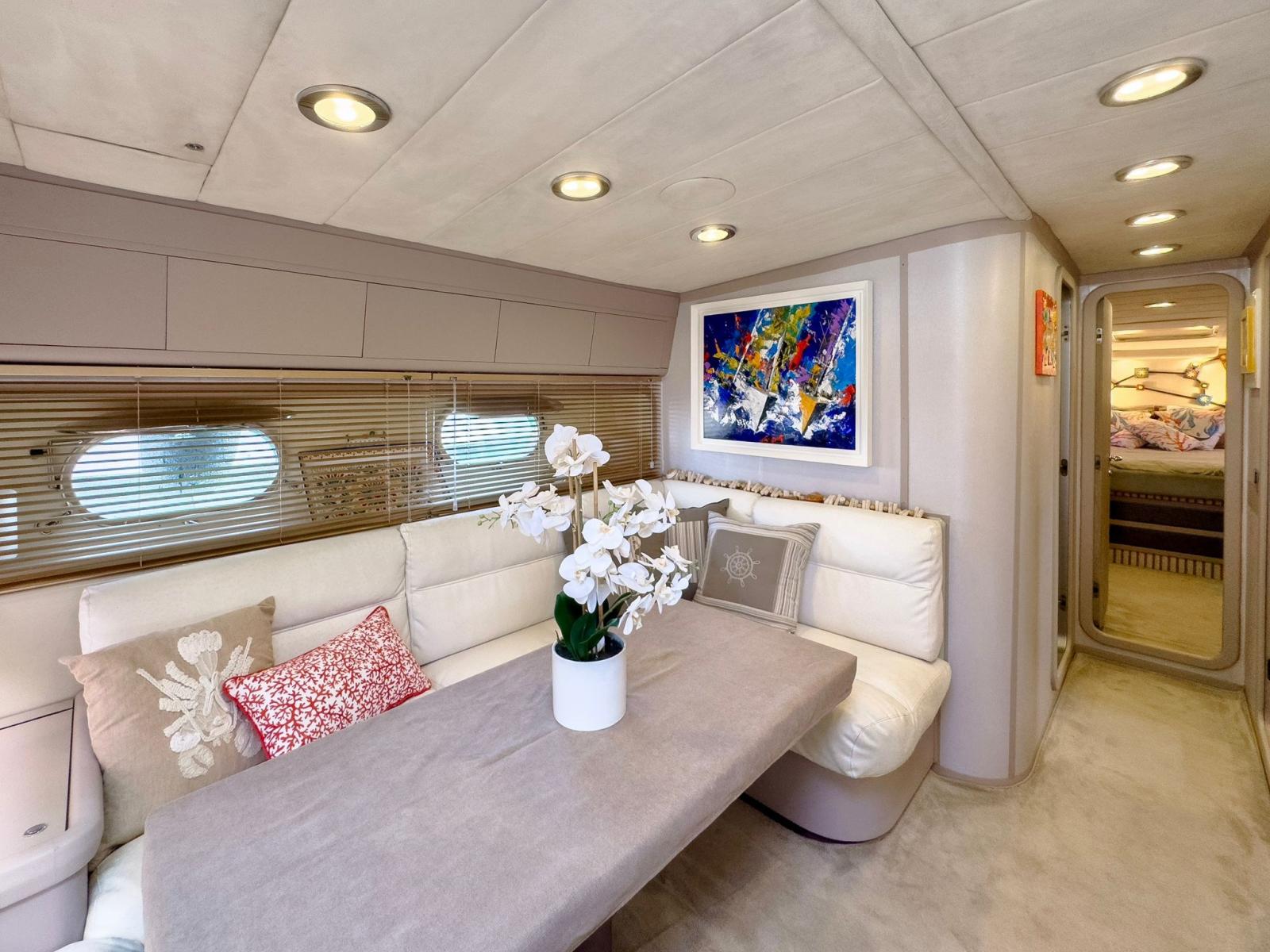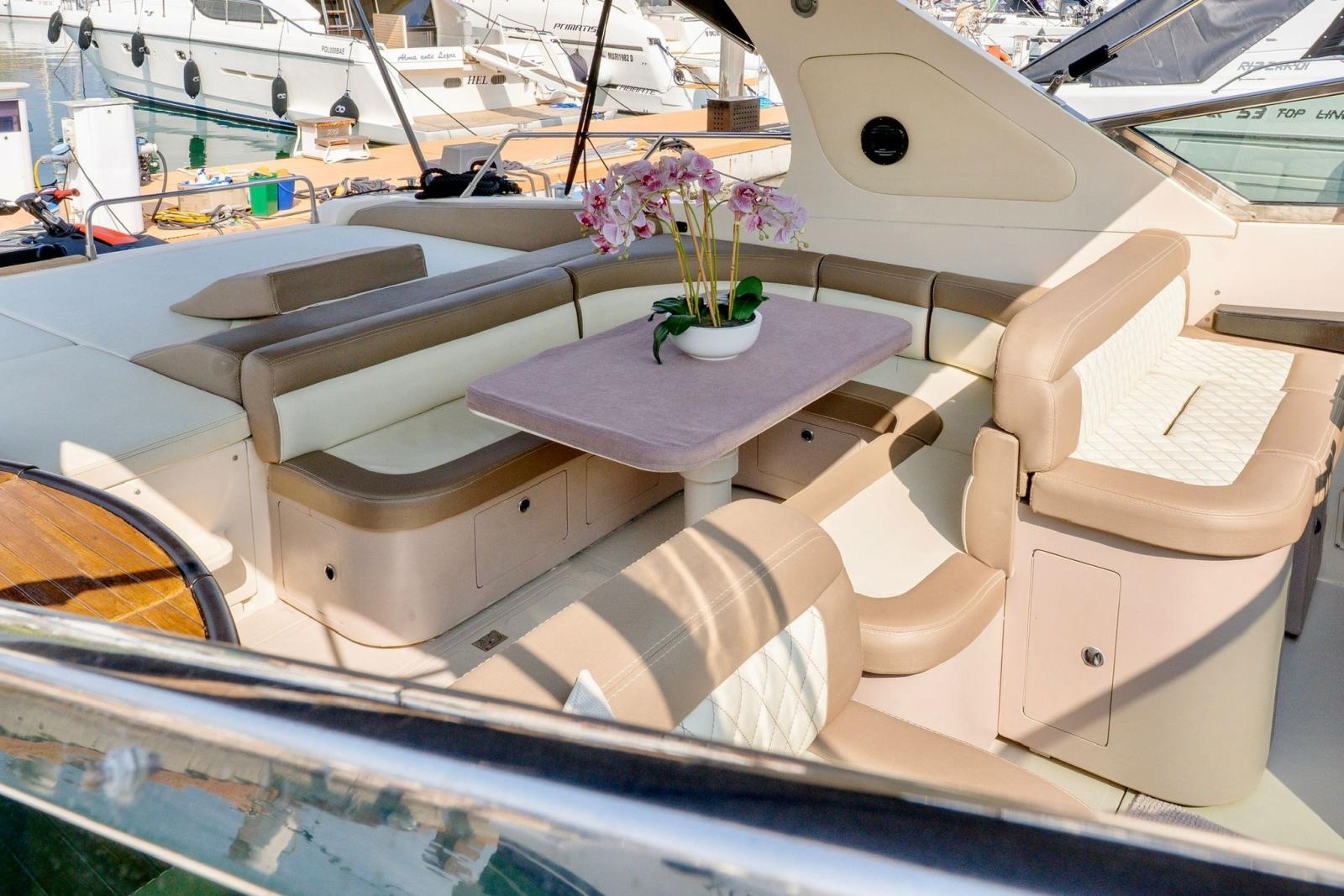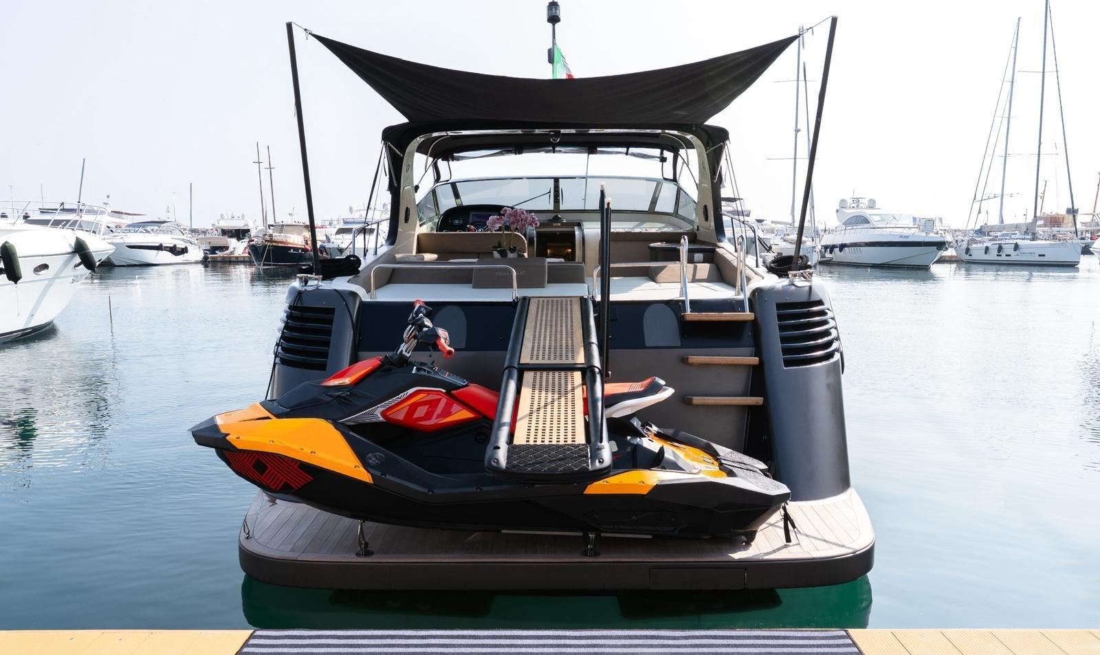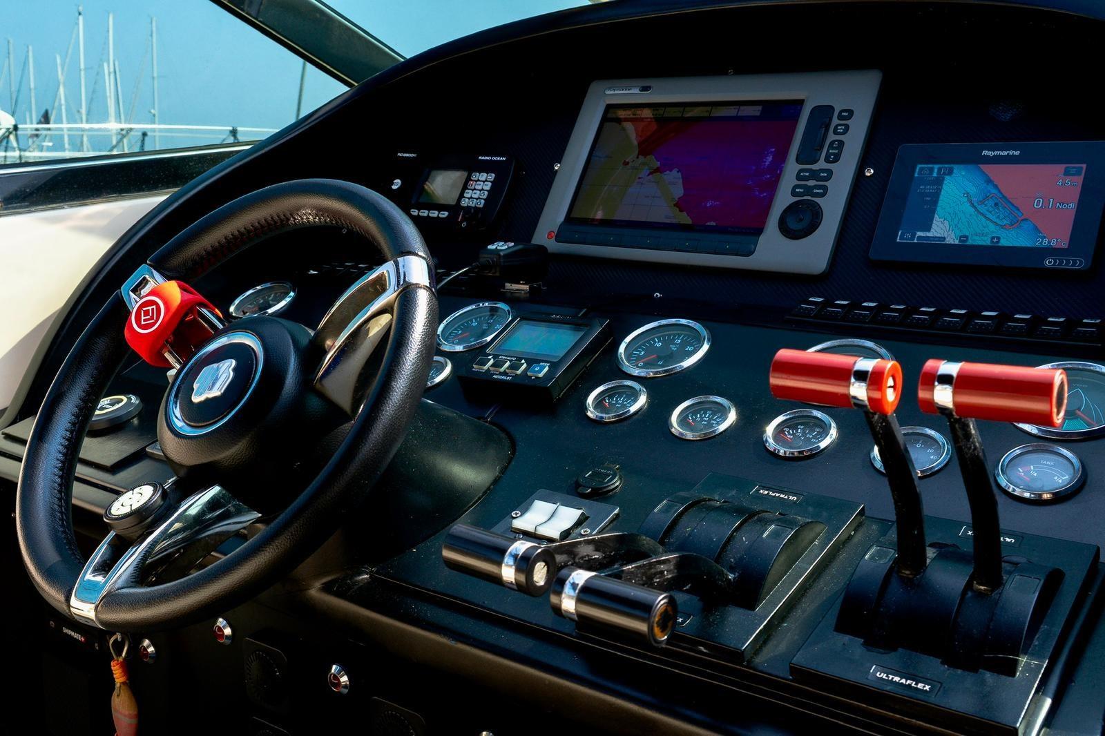 Alarme moteur, Alarme de pompe de cale, Eau sous pression, Système de vidange, Passavant en teck, Câble d’alimentation à quai, Couleur spéciale, Douche de cockpit, Phares fixes arrière, Flaps hydrauliques, Extincteur(s) fixe(s), Indicateurs de flaps, Lavabo dans le cockpit, Éclairage de courtoisie, Spots sous-marins, Défenses, Passerelle (idraulica), Plateforme arrière, Pompe de cale automatique, Pompe de cale manuelle, Cockpit en teck, Prise de quai, Connexion eau sous pression à quai, Rollbar, Guindeau électrique, Echelle de bain, table de cockpit, Corne, Winch électrique arrière, Winch électrique avant.
