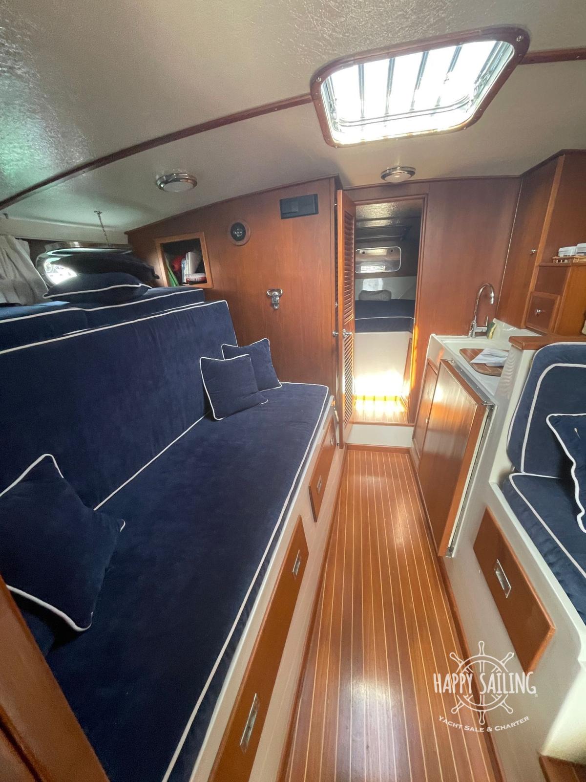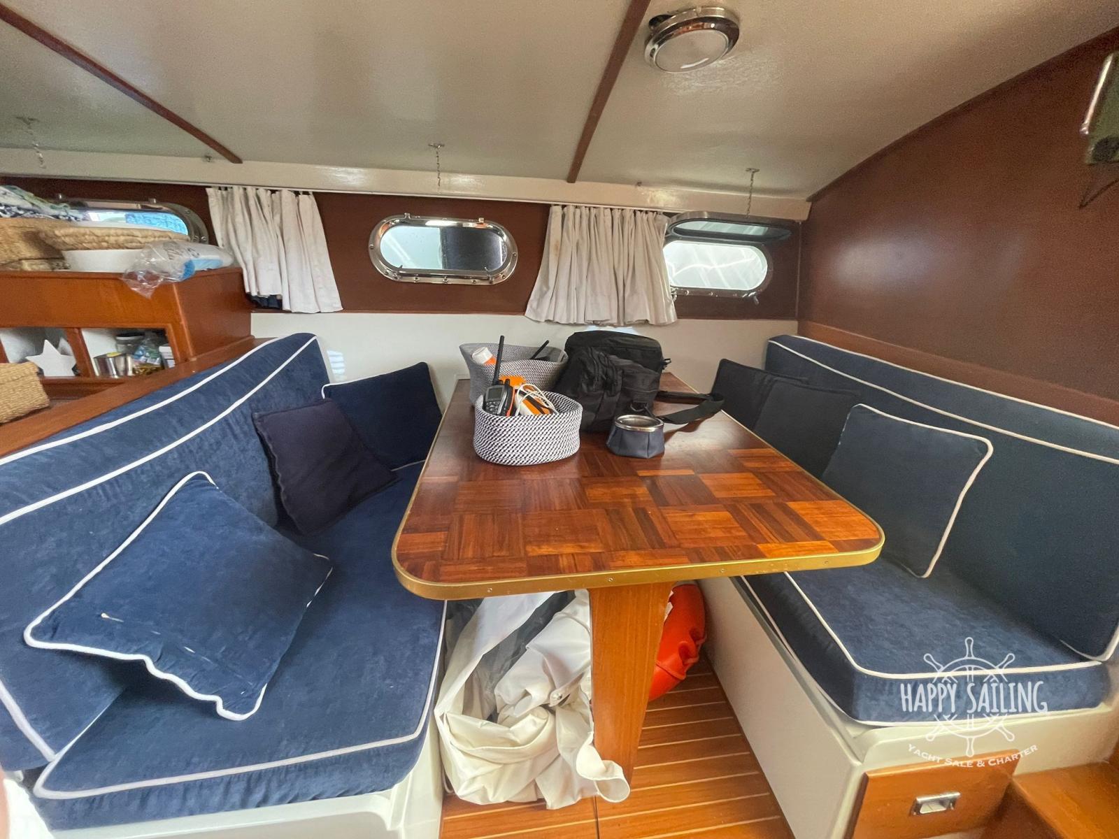 En entrant dans le bateau, il y a, sur la gauche, la salle de bain avec hublot avec lavabo, toilettes électriques et douche. Plus loin, dans la dinette, il y a un canapé double avec une table à manger en bois à droite et un long canapé qui peut être utilisé comme lit à gauche