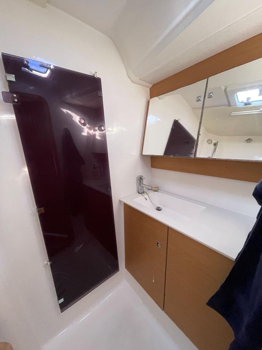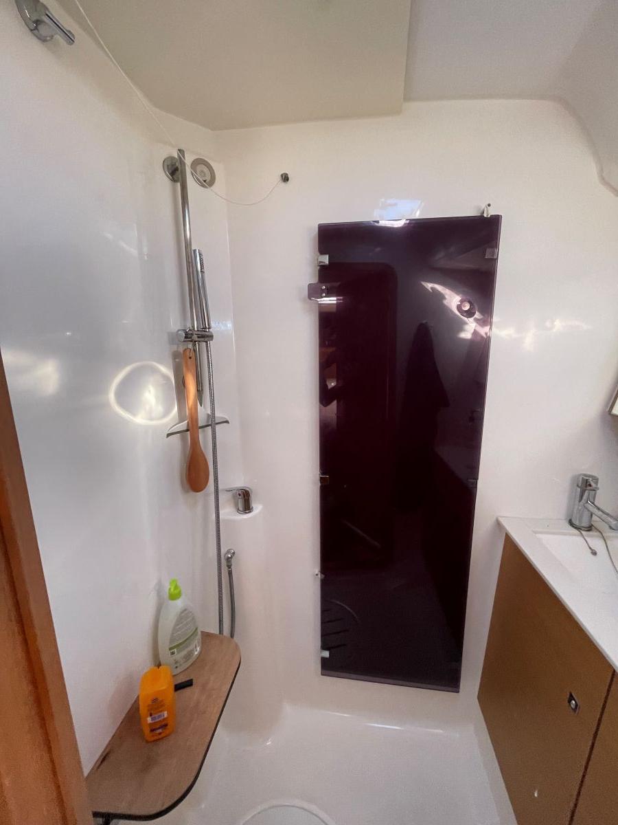3 Cabines doubles & 3 Salles de bain (3 wc - 1 électrique dans la cabine avant + 2 wc manuels avec réservoir eaux noires 150l, lavabo, douches, eau chaude/froide sous pression).