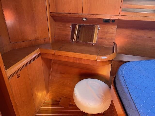 Cabine avant propriétaire avec rangement, coiffeuse, penderie et salle de bain indépendante avec WC électrique, lavabo, douche séparée, réservoir d'eaux noires, eau chaude/froide sous pression.