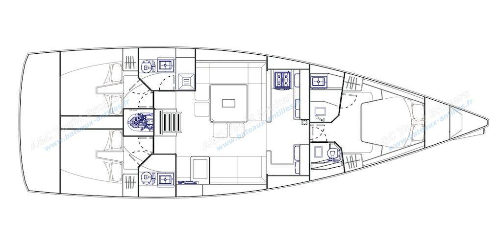 Version trois cabinesUne cabine avant double propriétaire avec une salle d’eau équipée de douche et d’un lavabo
