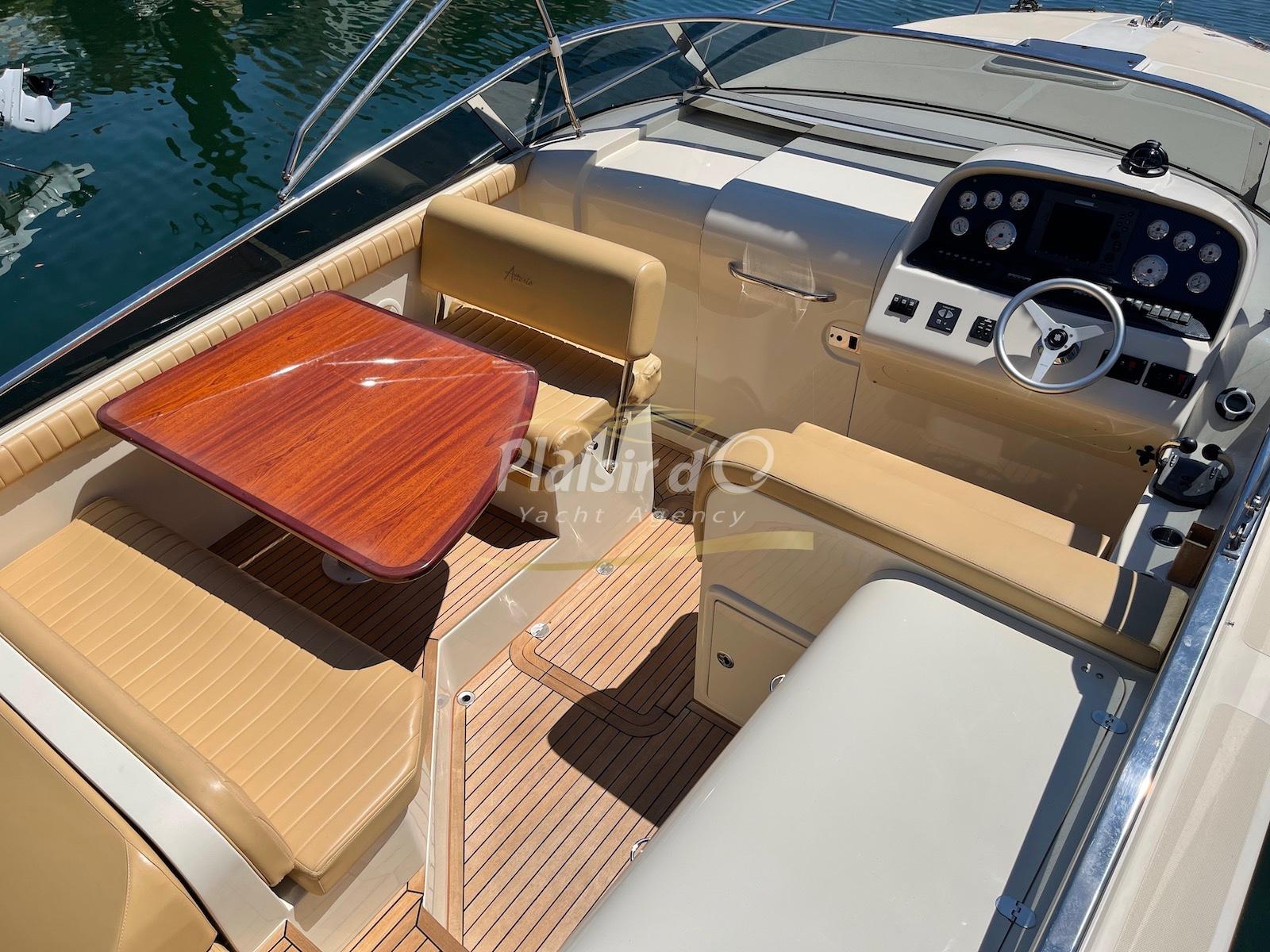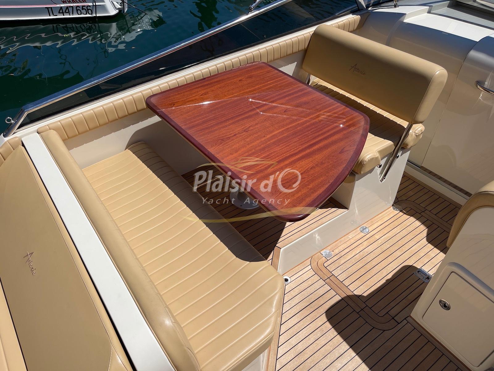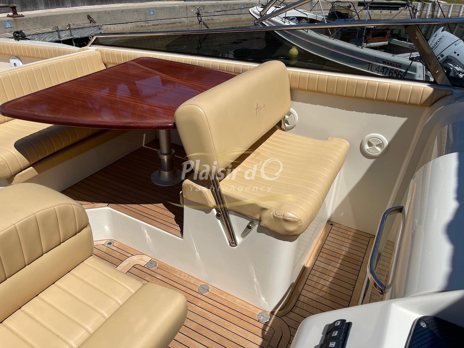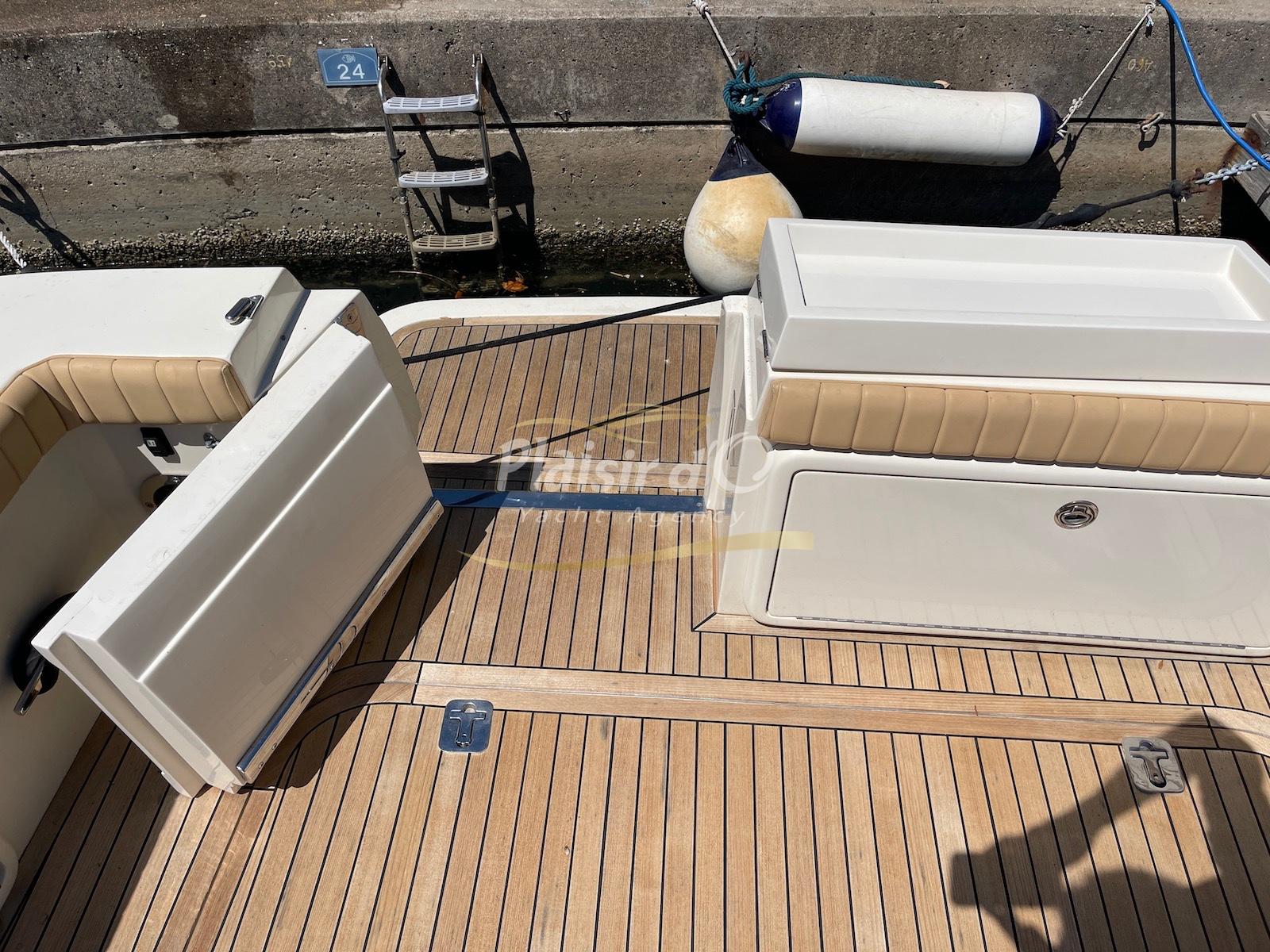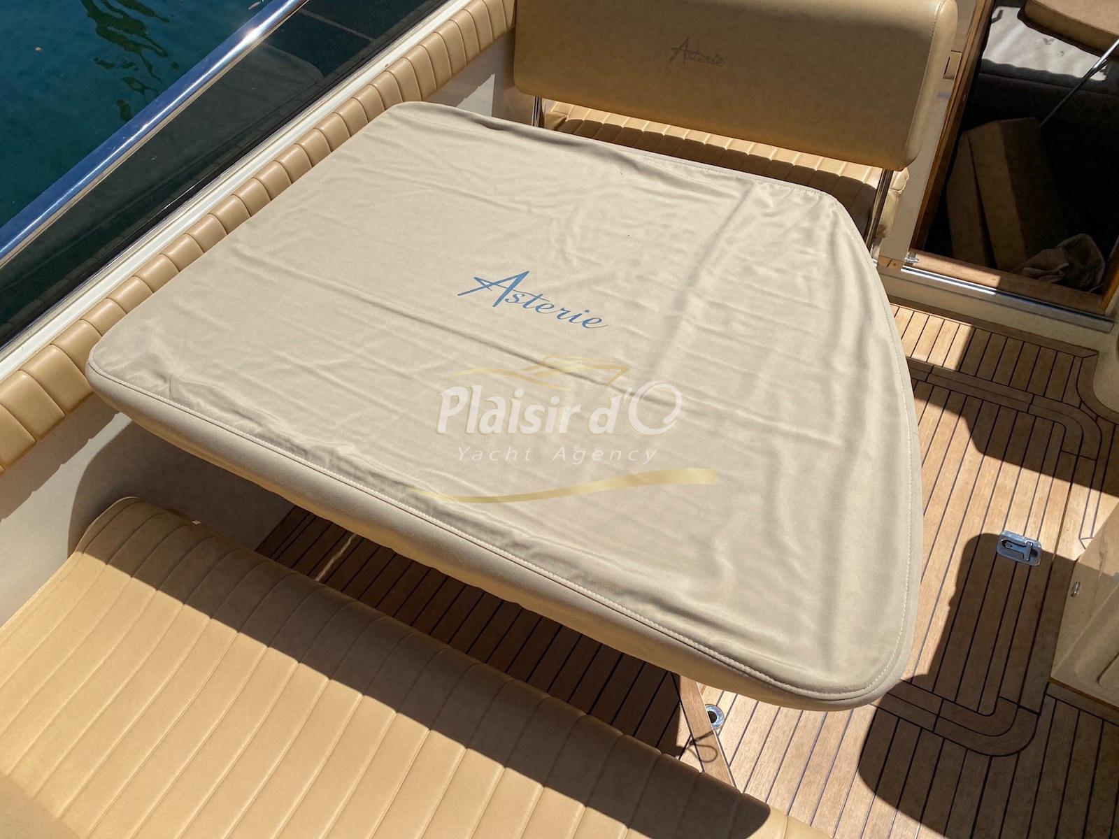La sellerie intérieur et extérieur sont dans un état proche du neuf, la table, le poste de pilotage et le cockpit sont protégés par un taud. Le bateau est stocké à terre 9 mois dans l’année.