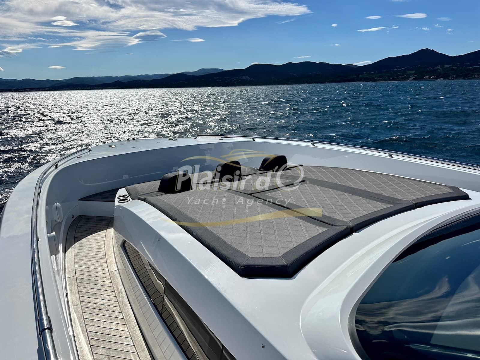 plan de pont très confortable, disposant de deux immenses bains de soleil, coin repas fixe et coin cuisine avec 2 immenses frigo et ice maker.