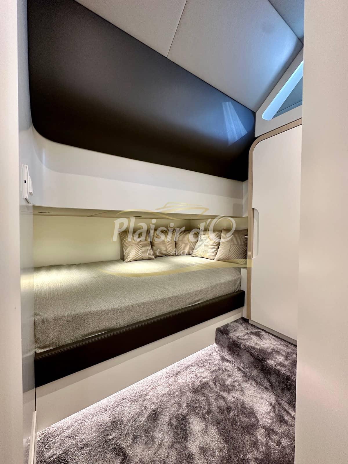 Dispose de 2 cabines et une spacieuse salle de bain permettant de voyager confortablement à 4.
