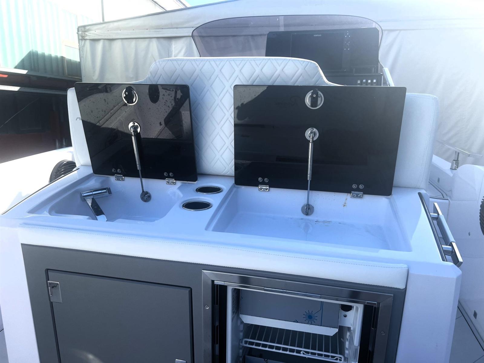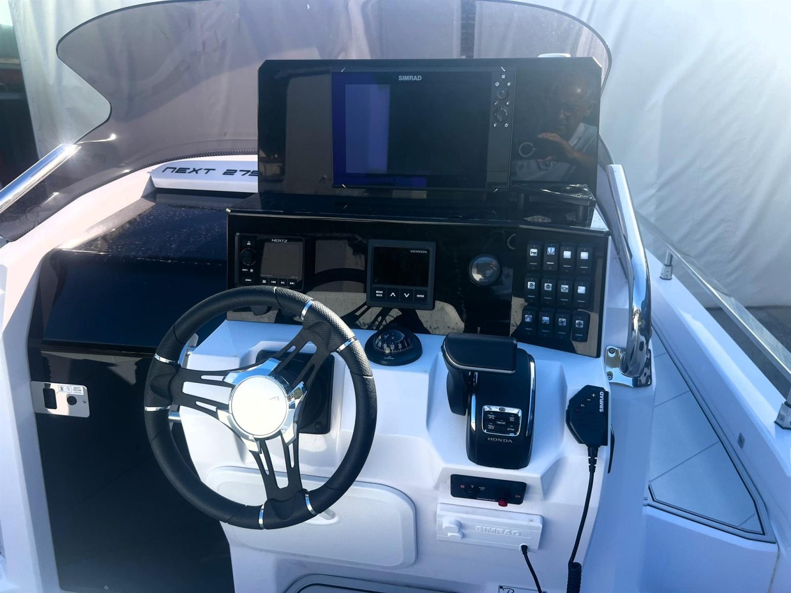 Le nouveau remorque RANIERI NEXT 275 LX, d’une grande élégance et d’une qualité de construction, bien équipé, idéal pour les sorties d’une journée sous le pont avec quatre lits et salle de bain séparée unité DEMO pré-équipée et PRÊTE À LA LIVRAISON avec l’équipement supplémentaire suivant : Couleur de pavois personnalisé, Sea Deck dans le cockpit, Couverture solaire avec poteaux en carbone, Sièges latéraux rabattables, Système de batterie supplémentaire, Deux batteries, circuit 220 V avec chargeur, système stéréo HERTZ avec 4 points d’accès, Pack électronique (GPS/VHF), Garmin, Poteau de vie avec évier, Garde-boue en acier inoxydable, Kit LED int/ext., Motorisation électronique haute performance HONDA 350 HP Blanc.