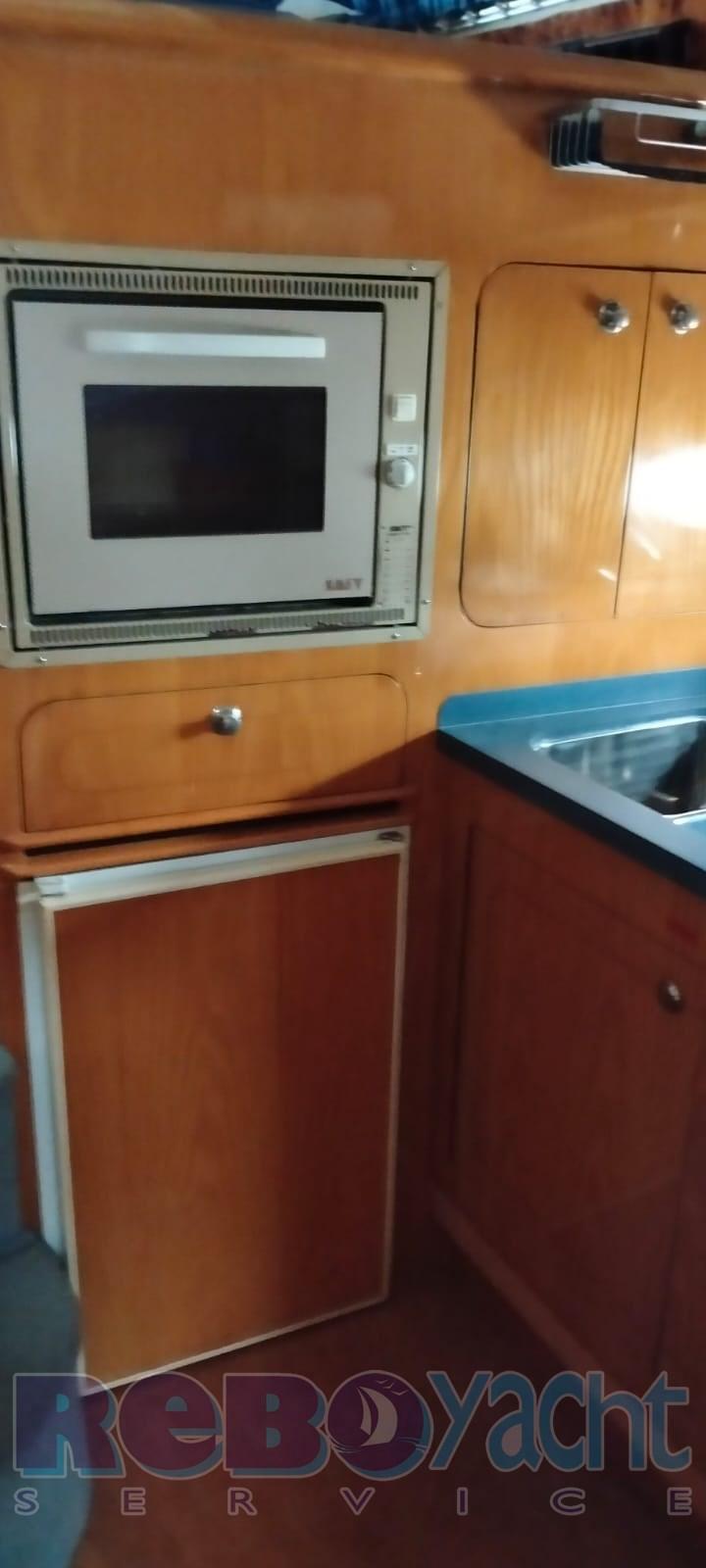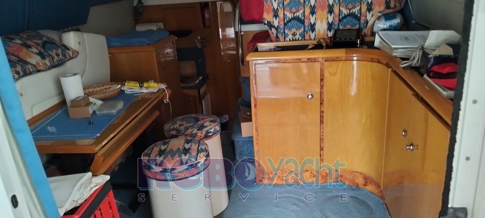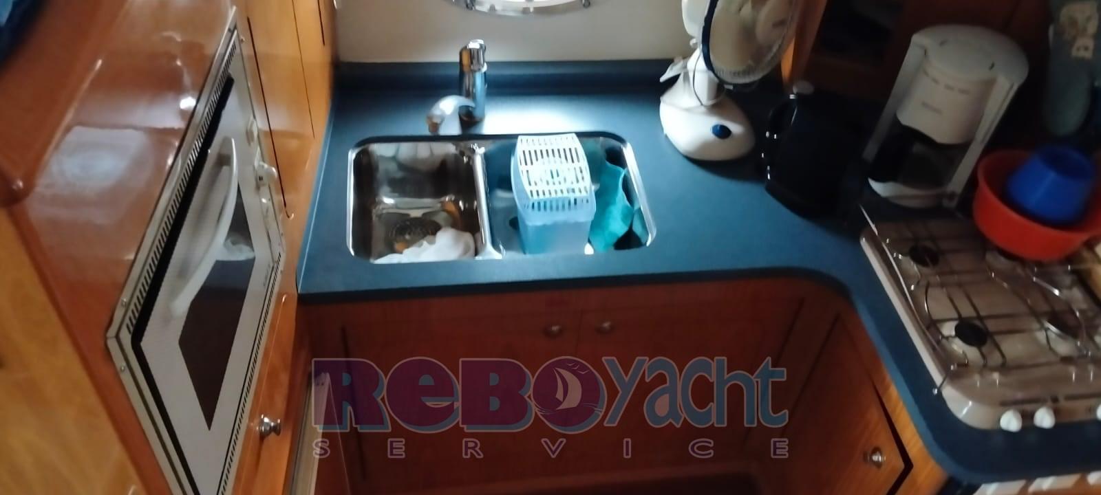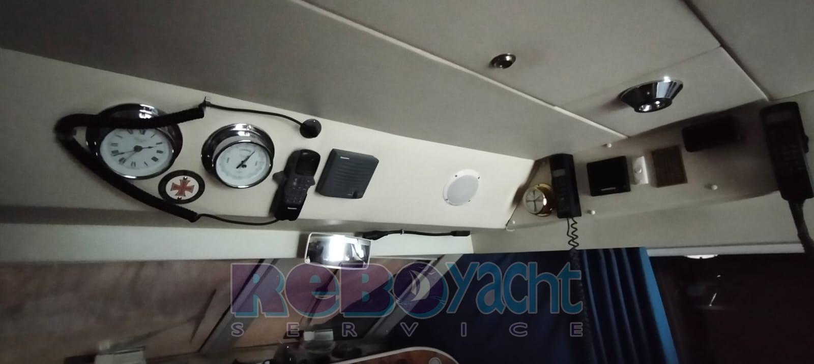 Eau sous pression, Douche de cockpit, Double barre à roue, Flaps hydrauliques, Bossoirs pour annexe, Passerelle, Cockpit en teck, Prise de quai, Guindeau électrique.