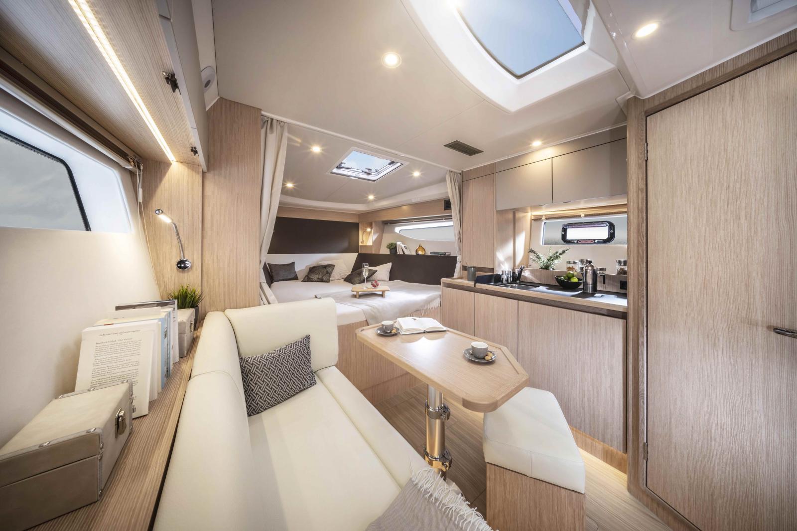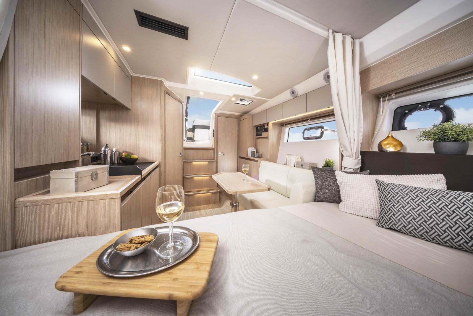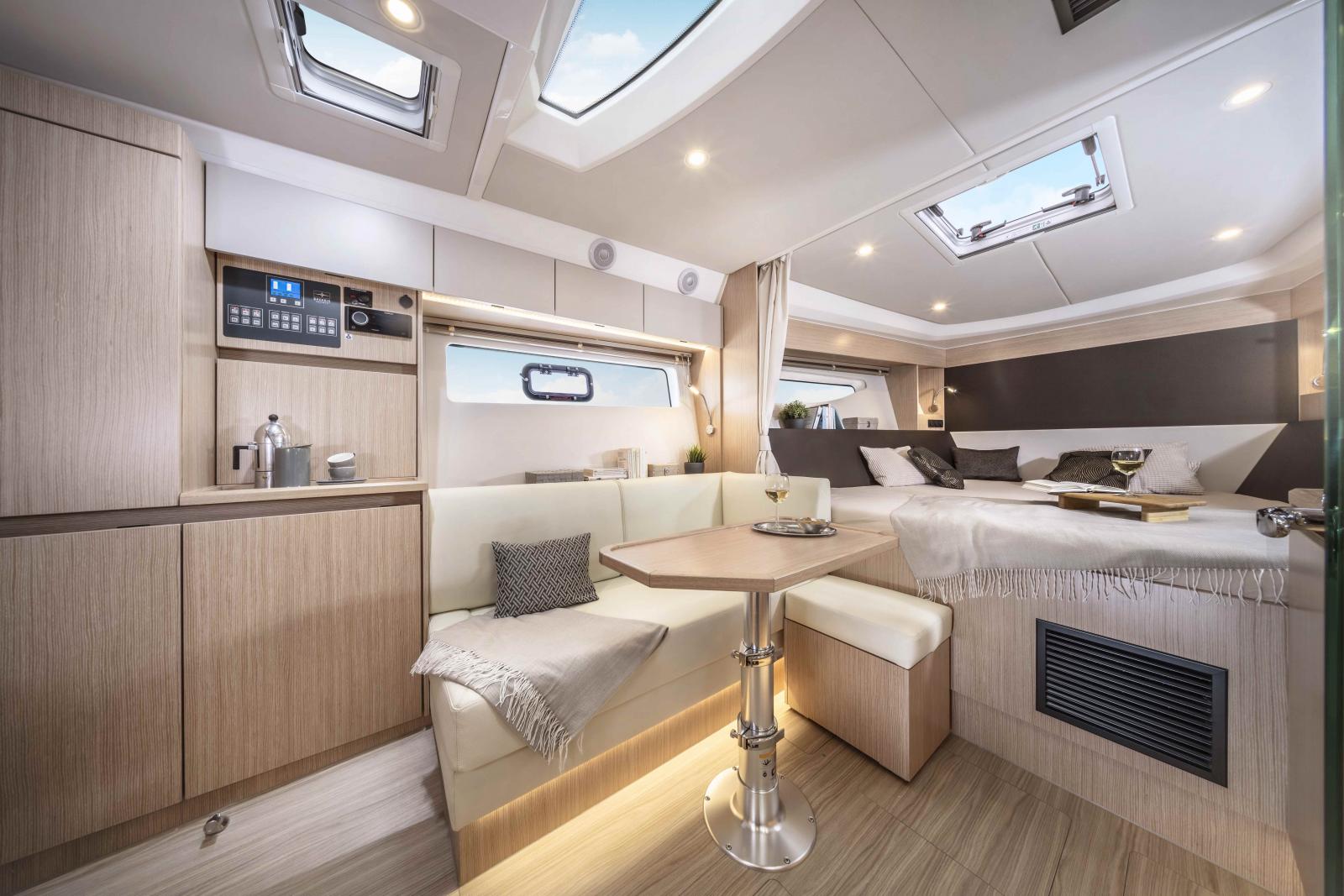 Un sentiment de liberté soufle sur cette vedette de 11 mètres HT. Vous profiterez de l'ombre sous le T-Top tout en ayant une vue à 360° sur la mer. A l'intérieur, une cabine, une mid cabine, un espace salon, une cuisine et une salle d'eau pourront vous accueillir le soir. Le chantier communiquera plsu sur cette unité à l'automne, et le présentera en Janvier 2025 à Dusseldorf.