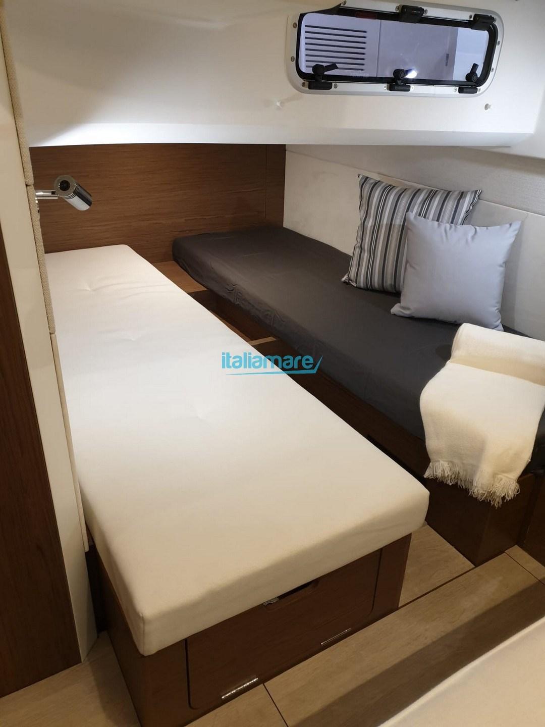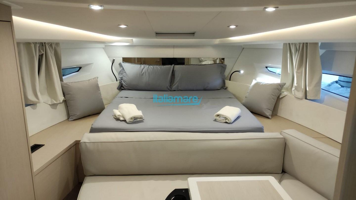 Les intérieurs, très lumineux, offrent deux cabines doubles, une cabine propriétaire à l’avant et une cabine invités au milieu du bateau et une salle de bain séparée.
