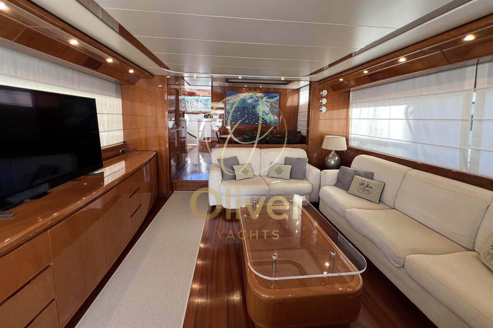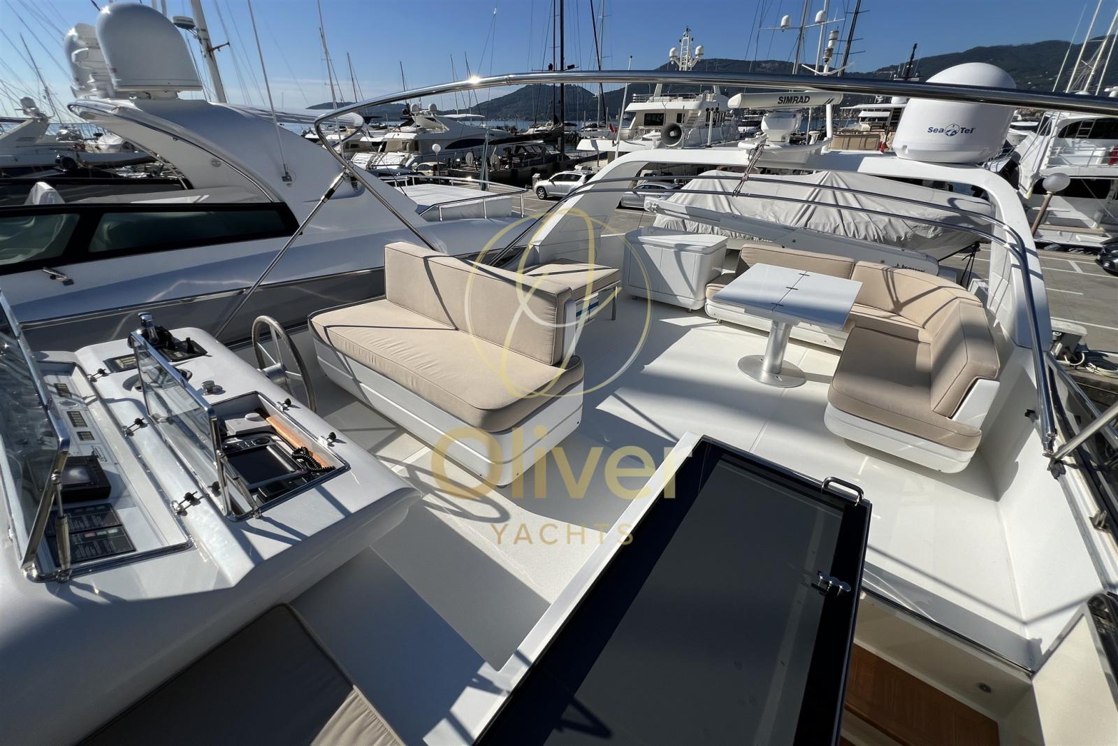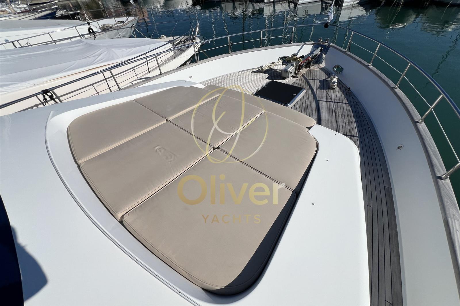 Parmi les points forts, on retrouve l’équipement embarqué : deux groupes électrogènes Kohler, la climatisation dans chaque chambre, un système audio de qualité et un système de divertissement qui comprend un grand écran Sony de 55 pouces. À l’extérieur, le pont en teck, les transats et le flybridge panoramique vous invitent à vivre la mer en toute détente, à la fois dans des moments d’intimité et de convivialité.