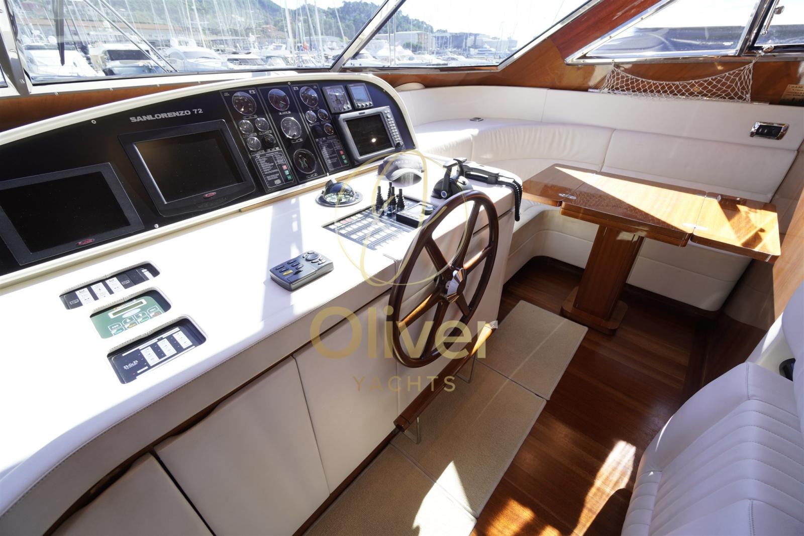 Indicateur d'angle de barre, Antenne radar, Compas (Riviera), Commande électrique (ZF), Ordinateur fixe de bord, Compteur de chaîne, Loch (Raymarine), Montre de bord, Moniteur (Raymarine), DSC VHF, GPS (Lorenz+Raymarine), Loch (Vdo+ Tridata Raymarine ST 60), Cartes et guides, Moniteur de consommation, Pilote automatique (Raymarine), Lecteur de cartes (Lorenz+Raymarine E 90 W fly), Plotter GPS, Panneau de commande, Radar (Simrad), Radio VHF (n. 2 Simrad RS 81), Siège copilote.