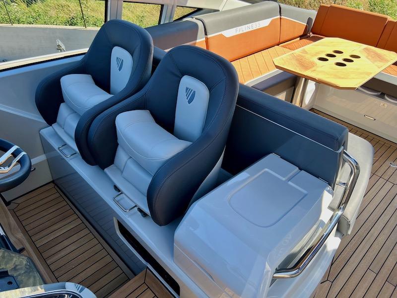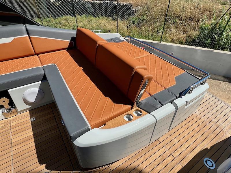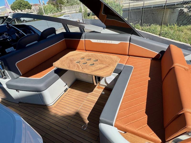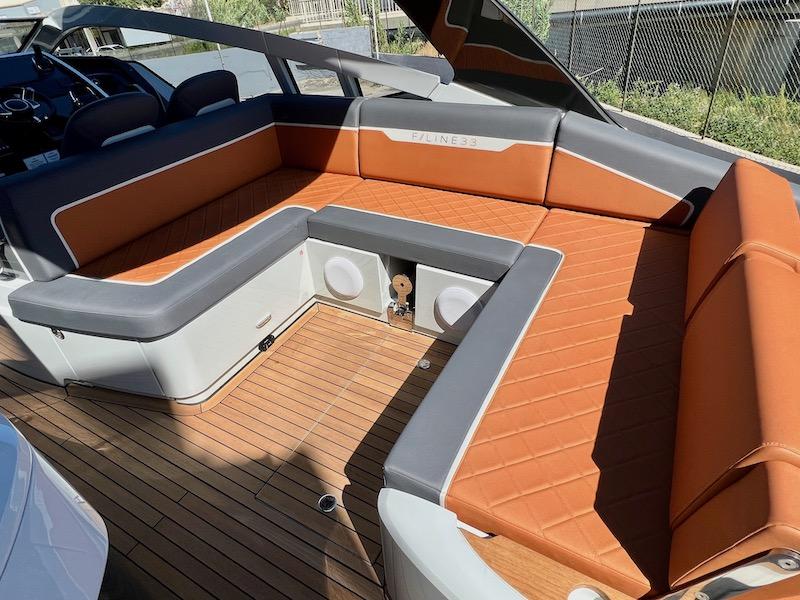 Éclairage d'ambiance extérieur sur le tableau arrière, les ponts latéraux et le badge F//line 33 illuminé à la proue