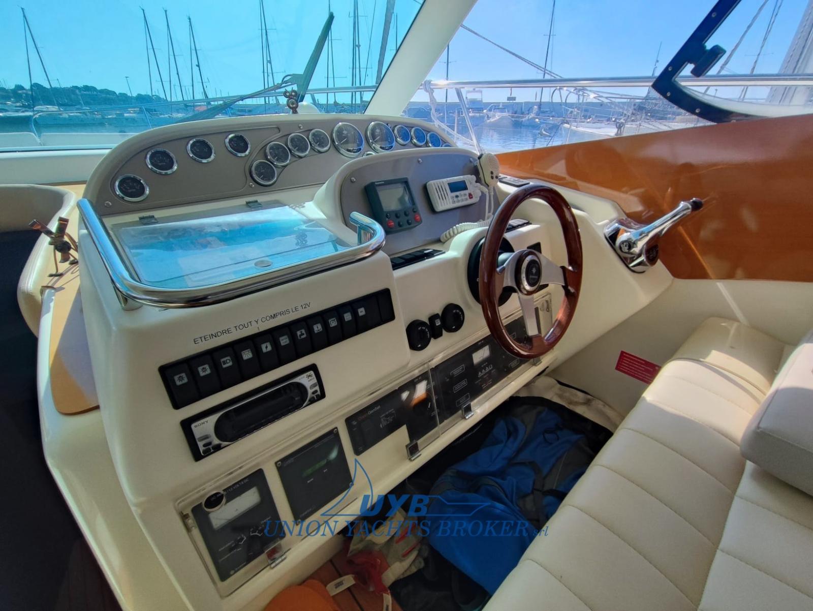 Alarme moteur, Alarme de pompe de cale, Eau sous pression, Douche de cockpit, Éclairage de courtoisie, Passerelle (idraulica), Plateforme arrière (strutturale teak), Pompe de cale manuelle, Porte latérale, Cockpit en teck, Prise de quai, Connexion eau sous pression à quai, Guindeau électrique, Echelle de bain, Corne, T-Top (Fly), 2 Winch électrique arrière.