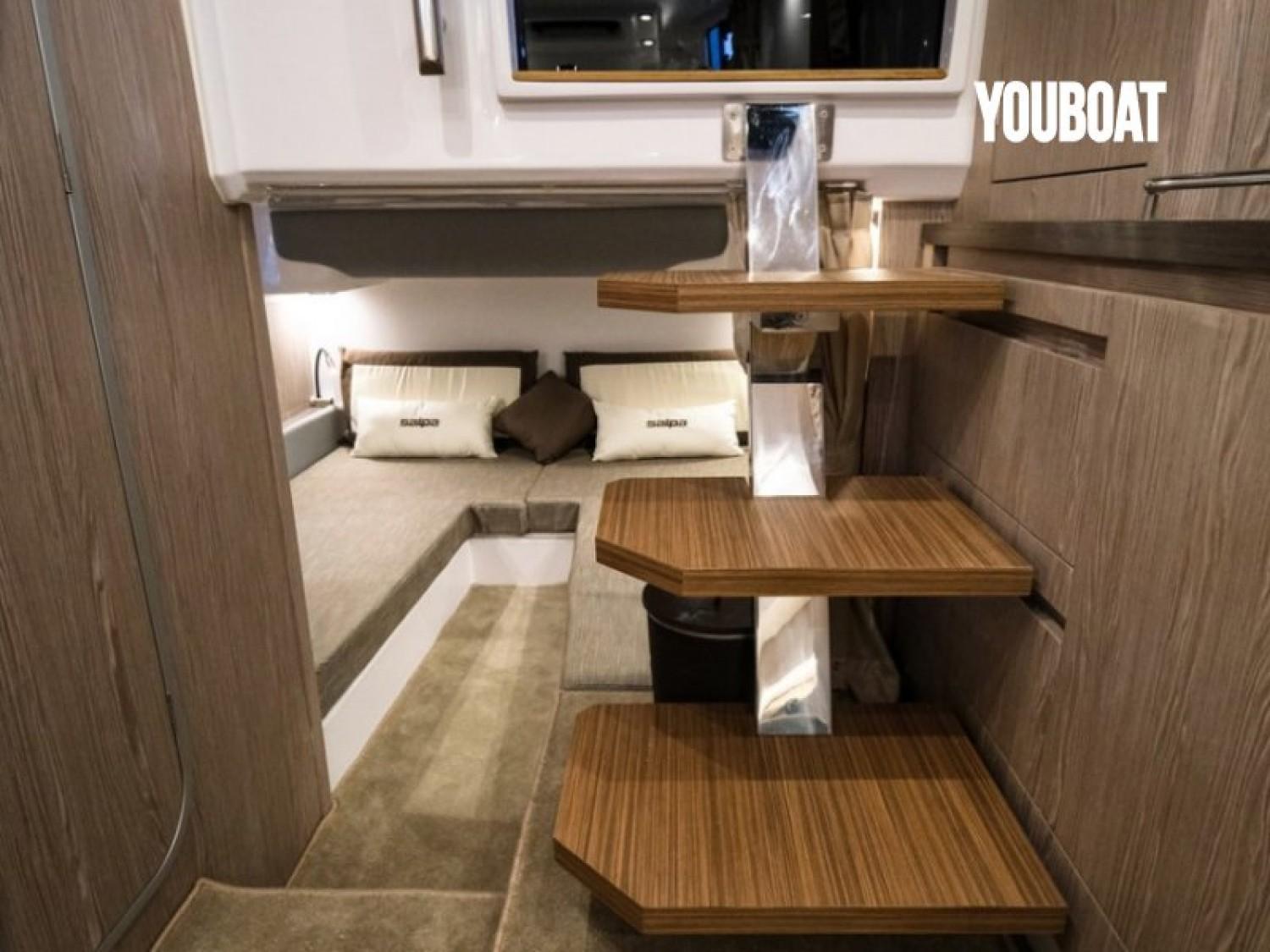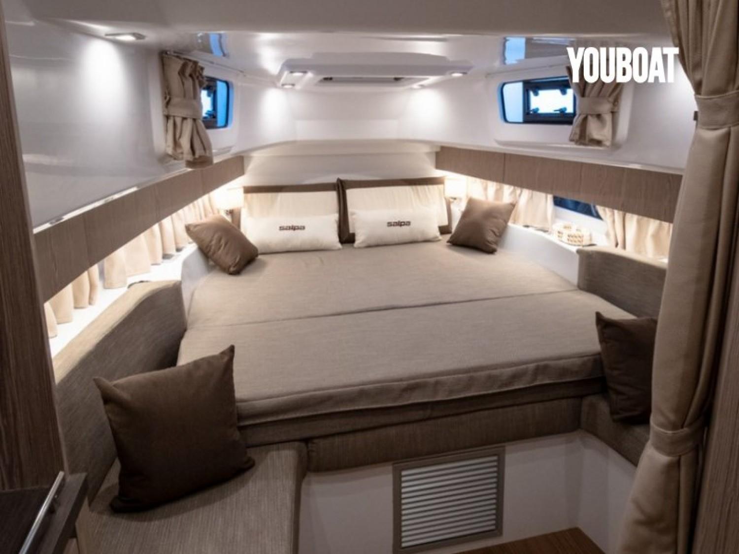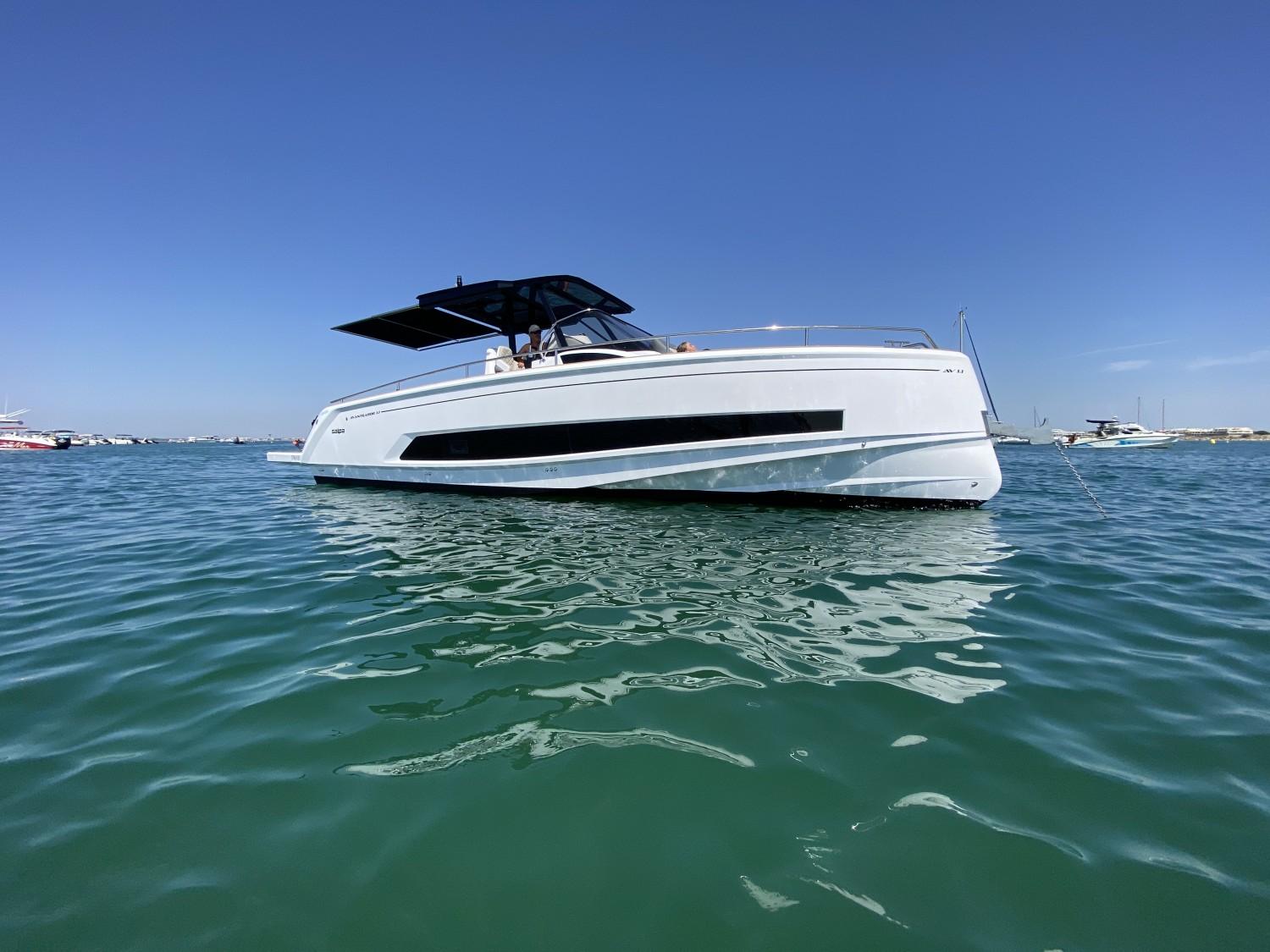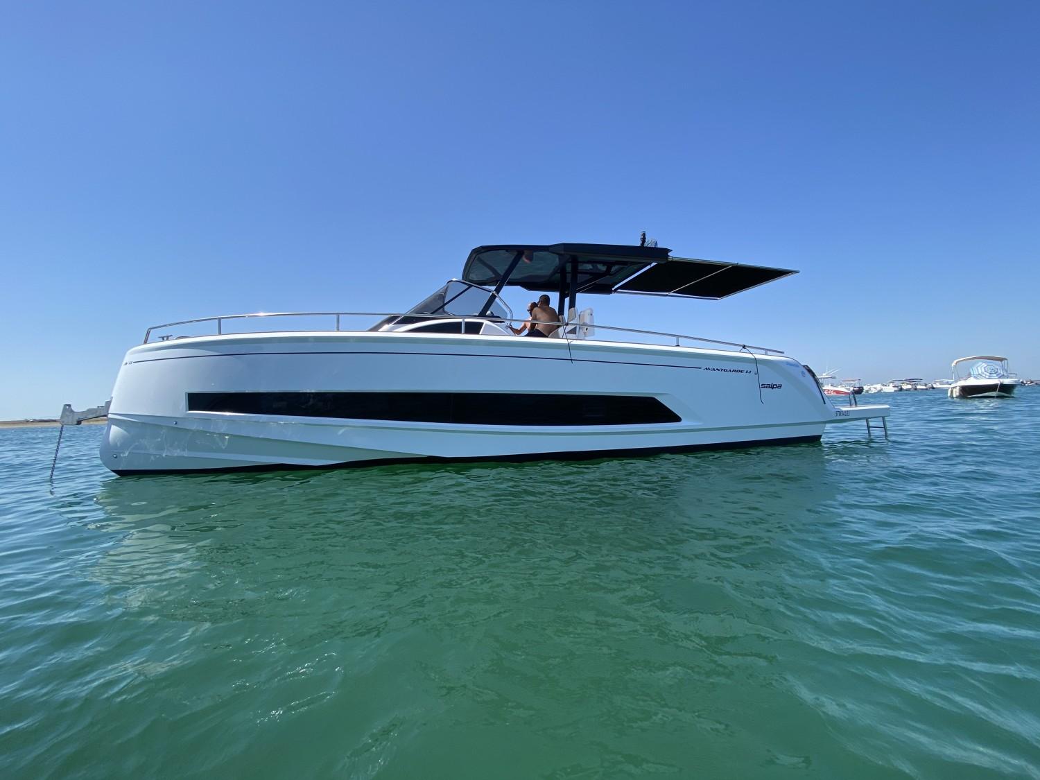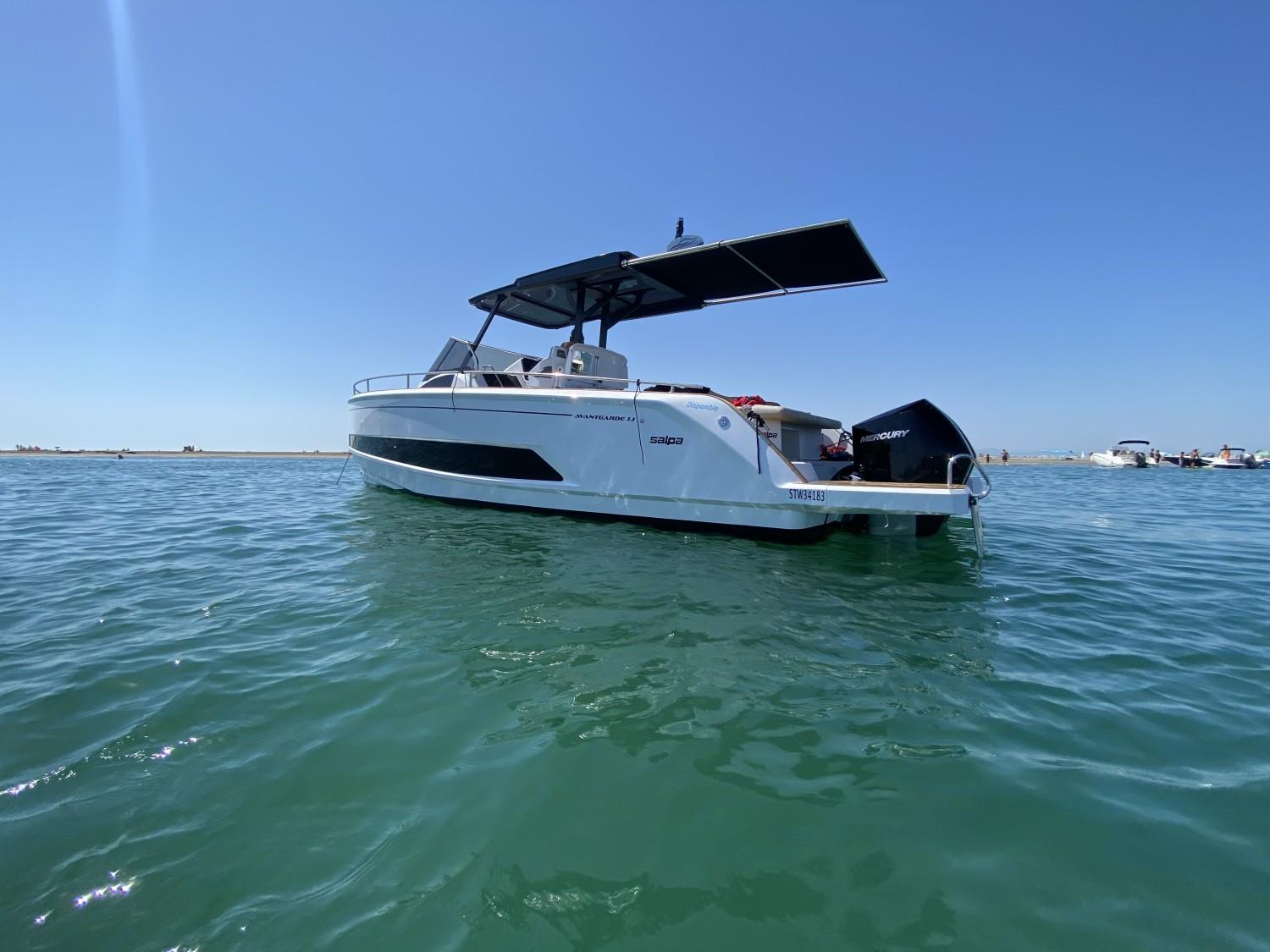 Euronautic Port Camargue, concessionnaire de la marque italienne SALPA dans le Gard, est heureux de vous présenter cette tout NOUVELLE VEDETTE AVANTGARDE 1.1 motorisée avec 2 MOTEURS MERCURY 300V8 à commande électrique et ActiveTrim.Ce bateau STOCK vous est présenté en CONCESSION sur la Zone technique N°1. Mesurant plus de 11 mètres, il peut accueillir 12 personnes à son bord. Vous pourrez y dormir à 4 adultes dans le plus grand confort. Il a été étudié pour rendre vos sorties agréables grâce à son immense carré arrière vous permettant d'y déjeuner à 8 et se transformant d'un coup d'interrupteur en un gigantesque bain de soleil. il possède également un grand bain de soleil façon transat à l'avant.Présentation VIDEOEssai PRESSE-----------------------OFFRE de LANCEMENT à 389 000€ prêt à naviguer ----------------------------------Equipement du bateau STOCK :- 4 couchages- Salle de bain avec douche séparée, WC électrique avec cuve à eau noire- GPS/Sondeur Garmin 12 pouces avec sonde tableau AR- FLAPS automatiques- Guindeau électrique, Mouillage complet, commandes TBD + AV- KIT Davier electrique télescopique- Eclairage 100% LED cockpit et cabine- Chargeur de batteries + installation 220V + cable de quai- Frigo Inox cockpit à ouverture latérale 90 litres- Plan de cuisson Gaz- Installation Boiler (eau chaude 220V)- Sellerie Spradling Silvertex- Propulseur d'étrave- Table de cockpit électrique- TTOP aluminium noir & Plexiglas Sureshade (remplace Roll Bar)- Tente electrique telescopique pour version TTOP- Teck synthétique INTEGRAL Le prix comprend toutes les options citées ci-dessus, la préparation de carène, le transport du chantier à Port Camargue, l'ensemble des formalités administratives et la prise en main du bateau clé en main !!!N'hésitez pas à nous contacter pour plus de renseignement sur le financement en LOA, un devis personnalisé ou un rendez vous pour une visite...Bateau semi-rigide similaire à: FJORD, PARDO, SAXDOR, INVICTUS, FAIRLINE, AXOPAR, JEANNEAU, BENETEAU, RANIERI, RIO, SESSA, GALEON, PARKER, SEALINENos secteurs: Port Camargue, Grau du Roi, Grande Motte, Carnon, Palavas, CAP d’Agde, Nîmes, Montpellier, Arle, Ales