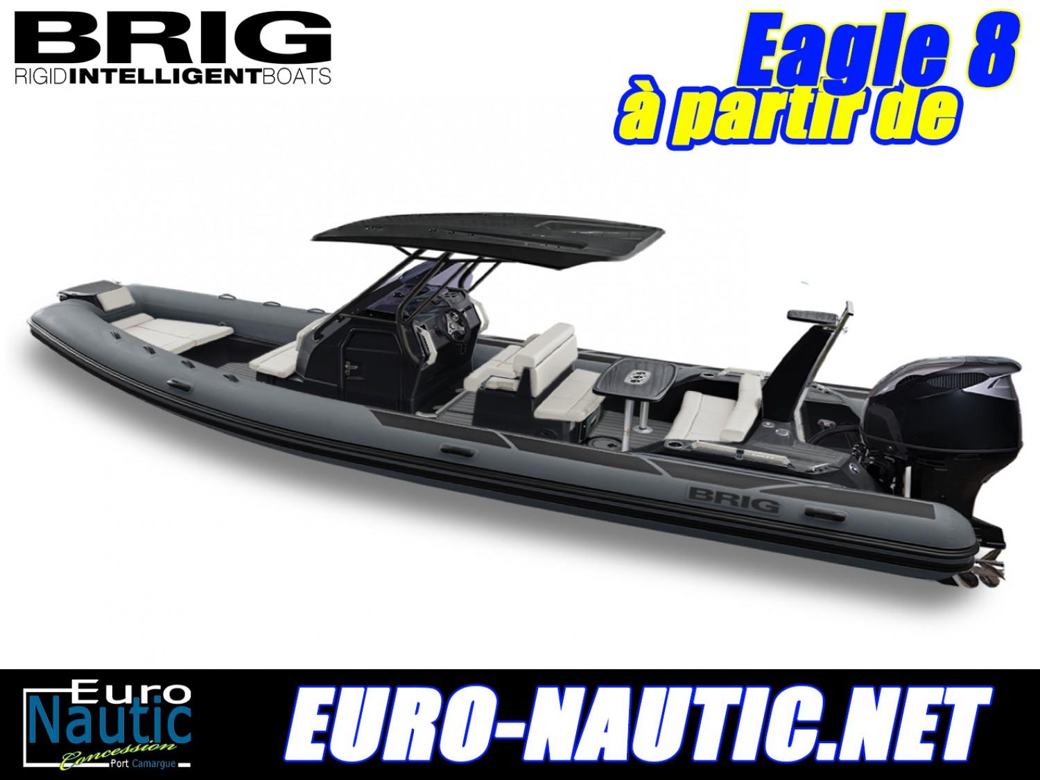 Euronautic est heureux de vous présenter le BRIG Eagle 8 avec ses lignes racées et son élégance incontestable, de la plage aux sports nautiques ce semi-rigide polyvalent est efficace même dans une mer mouvementée. ----------- Commandé avant fin 2023 et bénéficiez du PACK PROMO: !!! BRIG is BACK !!! -----------Ce PACK comprend un GPS-Sondeur GARMIN ECHOMAP™ UHD 72cv tactile avec sonde traversante, ainsi qu'une sono FUSION MS-RA60 avec 2 enceintes.Nos PACKs prêt à naviguer:En STANDARD avec un SUZUKI 250cv: 97900€En PREMIUM avec un SUZUKI 250AP: 109500€Devis personnalisé sur demande.PACK STANDARD BRIG: équipement au standard Hypalon avec moteur, armement côtier 6 personnes, clé en main prêt à naviguer, livraison Port Camargue.PACK PREMIUM BRIG: Bateau au standard, SEADEK, Guindeau électrique, douchette de pont, guindeau électrique, Bimini, Mât de Wake, Bain de soleil avant, Plates-formes arrière (avec échelle), cuisine, frigo, table et wc électrique avec cuve à eaux noires.- Equipement au STANDARD: Coque rigide/tube gonflable/strake/anneaux de remorquage et de levage EAGLE 8Hsettee arrière/coussins avant/kit d'entretien/manuelConsole de pilotage / 8 interrupteurs à fusibleSiège pilote combiné/bolster Eagle 8, Boussole marineRéservoir de carburant 340 litres + jauge / tuyau de remplissage extérieur du pont / tuyau pour Eagle 8Pompe de cale automatique, câblage, tuyauterie Eagle 8 (doublé)EAGLE 8 Marchepied avant avec feux de navigationPagaies 160 cmKit de direction hydraulique SEAFIRST MO 700HVolant D350 en cuirEagle 8 Plaque acrylique pour tableau de bord STANDART, non coupéeEAGLE 8 - 8 interrupteurs à fusiblePompe 7.5L- Options possibles:Prise de courant 12V avec fusibleKlaxon électriqueMât de ski pour Eagle 8Feu de navigation blanc 360° avec base 600 mm (pour mât de ski)Feu de navigation blanc 360° avec base 1000 mm (sans mât de ski)Kit douche à eau avec pompe électrique + Réservoir d'eau avec tuyau de remplissage Bain de soleilHousse globale sans T-topHousse de protection pour console, siège pilote et siège arrière de l'Eagle 8 SANS T-top.Housse pour console, siège pilote et siège arrière de l'Eagle 8 version T-topBimini pliable T-top (couleur au choix )Guindeau électrique avec chaine et ancre InoxToilettes électrique avec cuve à eaux noiresTableRéfrigérateur tiroirSoupape de surpression A6 (Maximum 5 pcs)Set SeaDek (couleur au choix ), revêtement de sol anti-dérapant et qui ne chauffe pasGlacière encastréePièces en Inox noiresLe prix comprend la livraison, la prise en main, l'immatriculation, les papiers et l'équipement de sécurité côtier obligatoire pour 6 personnes.Financez votre bateau neuf en LOAPlace de port possibleRemorque sur devis...N'hésitez pas à nous contacter pour discuter de votre projet.Bateau semi-rigide similaire à: Zodiac, Bombard, Zar, Capelli Tempest, BRIG, Tarpon, BWA, Sillinger, Valiant, BSC, 3D Tender, Ranieri, Quicksilver, Master, Sea hawkNos secteurs: Port Camargue, Grau du Roi, Grande Motte, Carnon, Palavas, CAP d’Agde, Nîmes, Montpellier, Arle, Ales