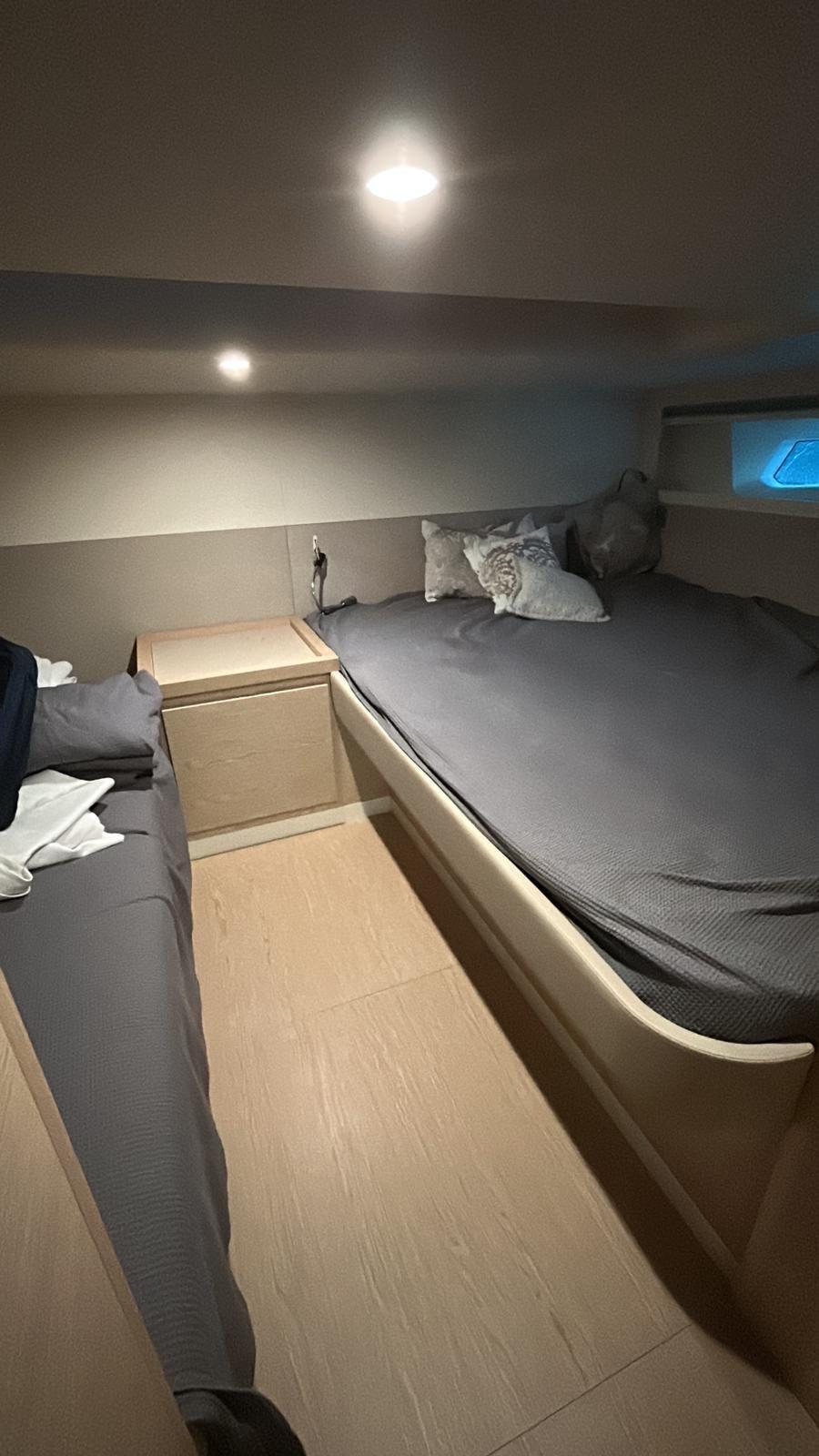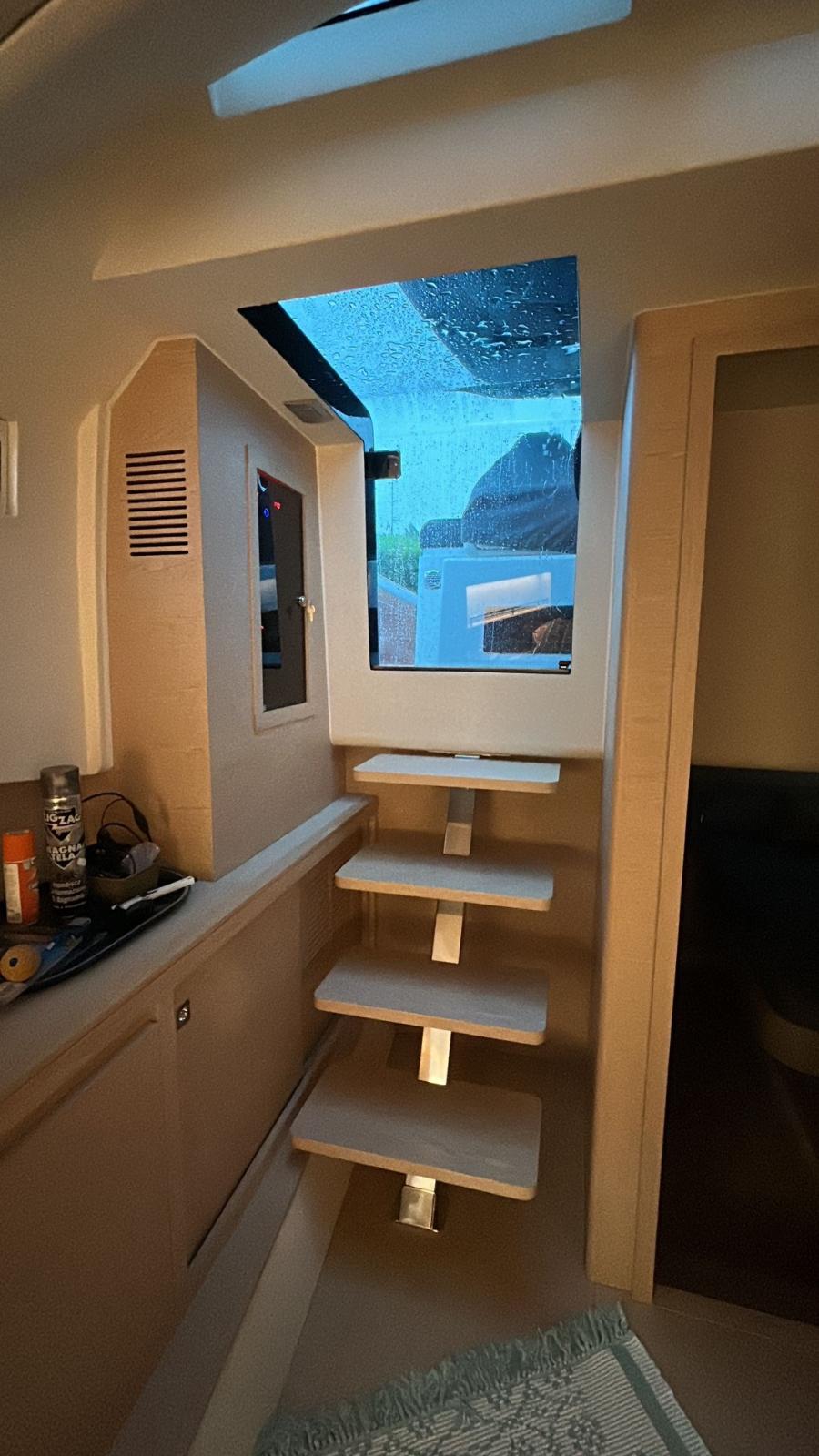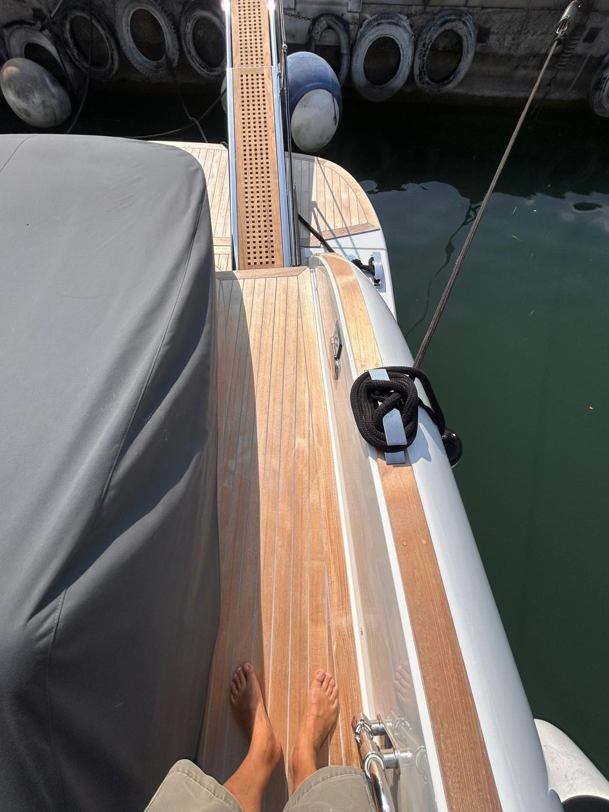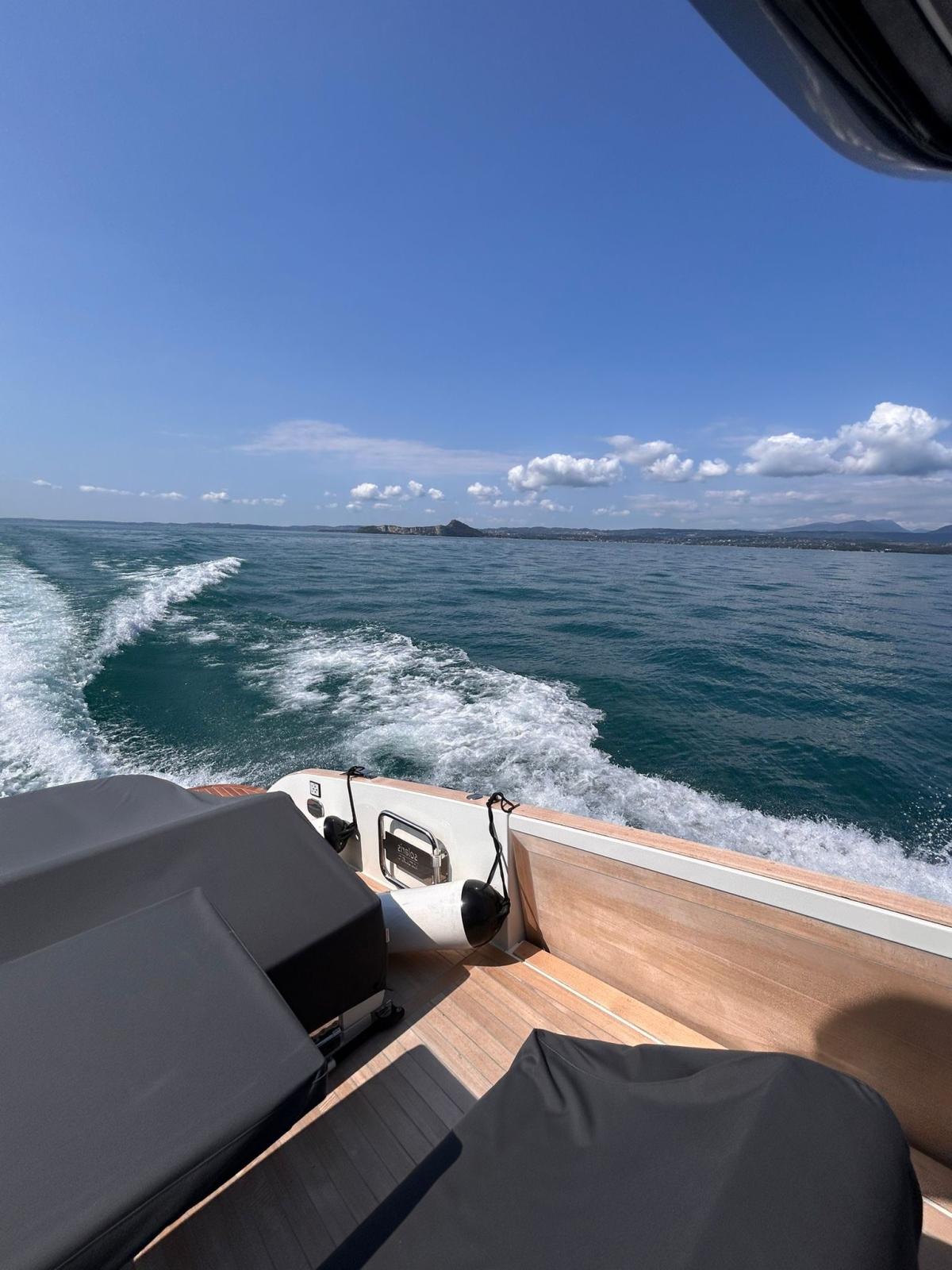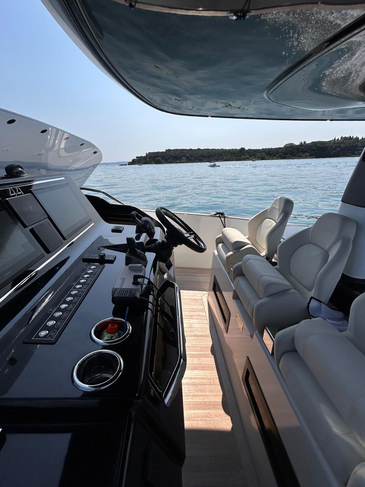 Lave-vaisselle et machine à glaçons dans le cockpit, couvercle total de l’armoire de cuisine, pare-brise et couvercle total de la console, antifouling, ligne de flottaison noire, terrasses latérales hydrauliques avec insert en teck, bain de soleil arrière avec garage en dessous et ouverture électrique, porte-gobelets de bain de soleil à l’arrière et à l’avant (n.4), porte-gobelets du siège du conducteur (n.2), hublot ouvrant à l’avant, N. 2 taquets arrière, Cabine principale arrière complète avec vitrage de coque, Cloison de séparation avec porte pour les deux cabines, Kit de luxe (compartiments latéraux avec finition en tissu - dessus mobile droit et dessus de chevet avec finition en éco-cuir - poignées mobiles en éco-cuir), Portes de poupe en acier inoxydable, Barre d’aile de coffre à l’avant en acier inoxydable, Miroir de tableau arrière en acier inoxydable, Système stéréo de cabine propriétaire avec Bluetooth, 2 haut-parleurs intérieurs et deux haut-parleurs supplémentaires pour l’espace extérieur T-Top, Pack d’éclairage de courtoisie, comprend : feux de passerelle externes, feux T-Top, feux de pont avant escamotables, éclairage de pont arrière arrière, N. 2 prises étanches 220 V dans le coffre arrière, pare-éclaboussures transparent pour le poste de pilotage, Pack couverture (le pack comprend : housse de console, table, siège en PP, bain de soleil en PP, bain de soleil PR, sièges pilote), auvent de poupe foncé, antifouling noir, tissus extérieurs de couleur crème glacée.