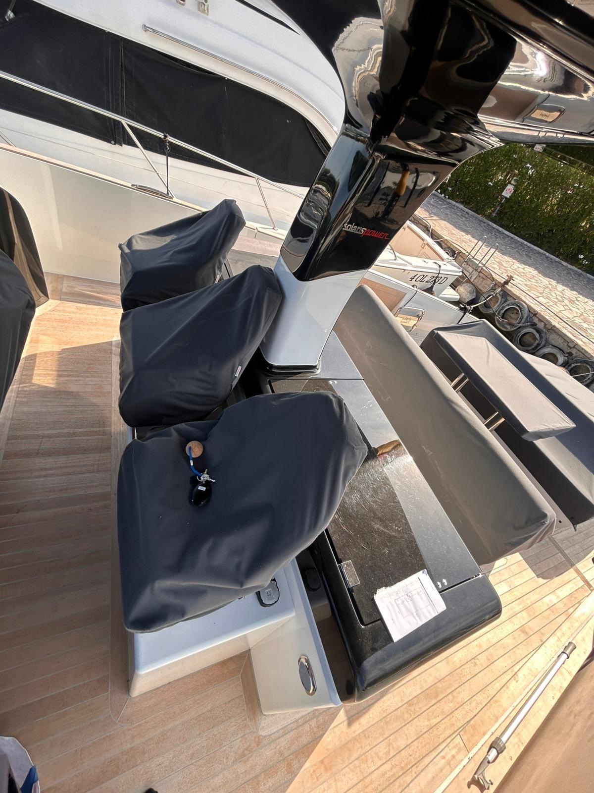 Alarme moteur, Alarme de pompe de cale, Ancre (inox 16 kg con snodo), Auto Dynamic Trim Interceptor, Eau sous pression, Batteries (servizi (500Ah)), Taquets pliants, Passavant en teck (con commento grigio chiaro), Douche de cockpit, Hard top, Extincteur(s) fixe(s), Lavabo dans le cockpit (cucina), Éclairage de courtoisie, Passerelle (idraulica telescopica), Plateforme arrière (Spiaggetta di poppa lunga con sistema idraulico sali e scendi compresa scaletta di discesa automatica), Porte latérale, Cockpit en teck (con commento grigio chiaro), Prise de quai, Guindeau électrique, Echelle de bain, Stabilisateurs (Quick MC2 x 10 Gyro), table de cockpit (allungabile in teak), Corne.