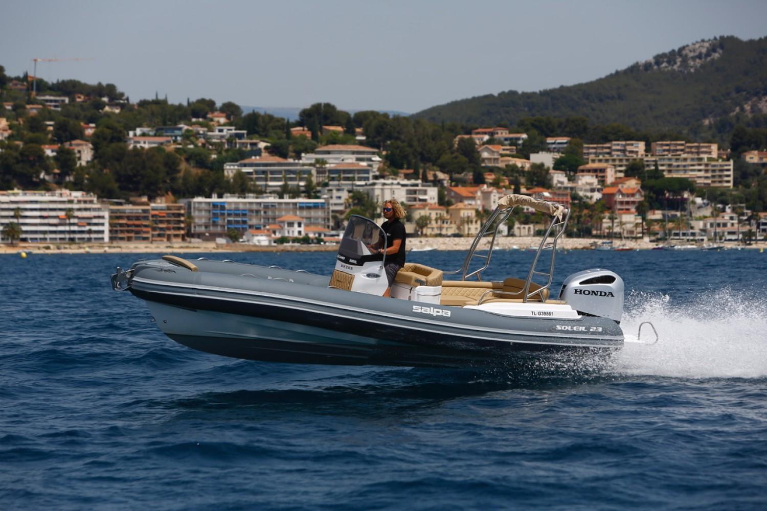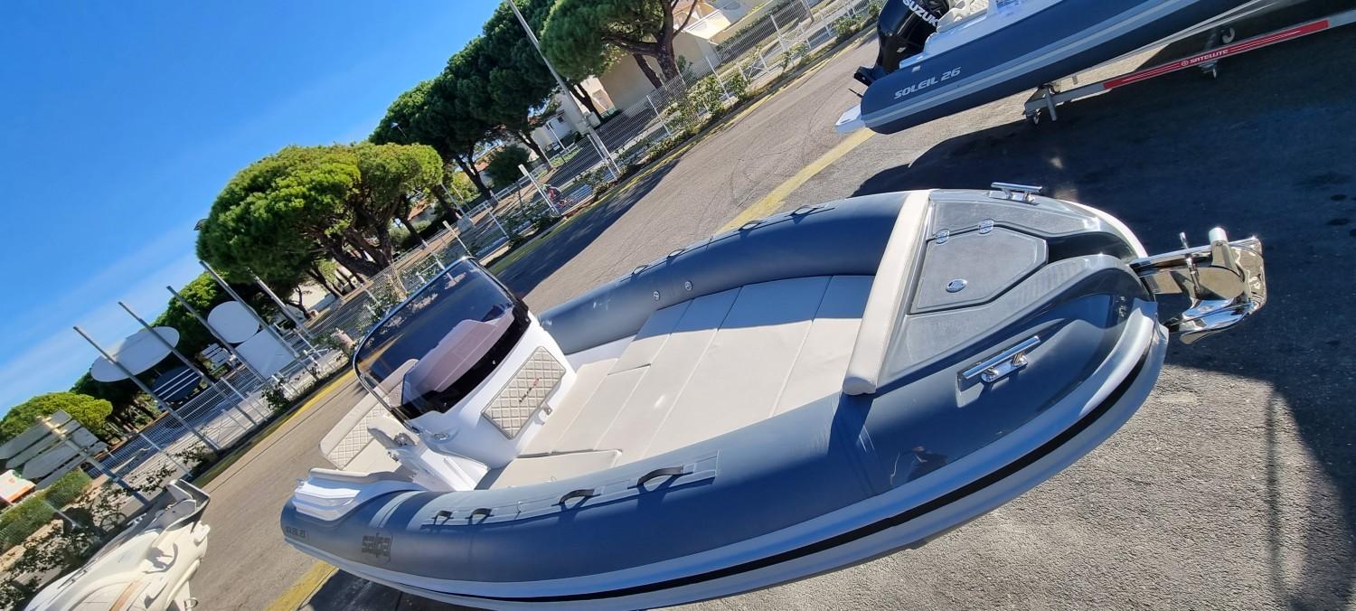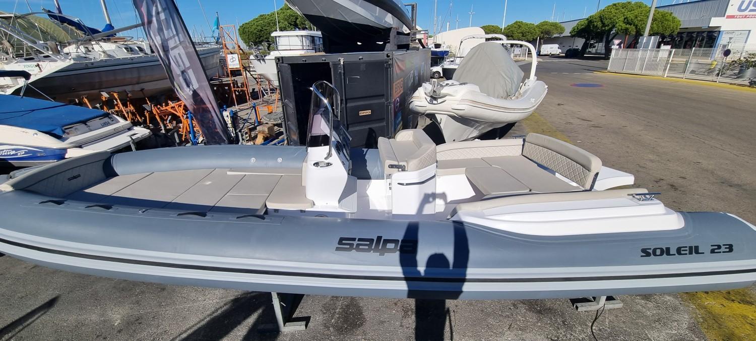 EuroNautic NOUVEAU CONCESSIONNAIRE de la très réputé marque de semi-rigide Italien SALPA, vous propose ce SOLEIL 23 en STOCK dans notre concession situé sur la Zone technique N° 1 de Port Camargue.Il vous est proposé au tarif de 84 500€ au lieu de 93821€. Le prix inclue toutes les options citées ci dessous, un Moteur SUZUKI 200APX Blanc (PAS DE TAXE) avec commande électrique et trim automatique, les formalités administratives ainsi que la prise en main du bateau à Port Camargue Possibilité de le mettre en GESTION - LOCATION dans notre base de Port Camargue, vous êtes propriétaire de votre bateau tout en limitant les frais. Contactez nous pour toutes informations.Longueur : 7,30m hors tout (homologué 6,80m donc pas de TAXE)Largeur : 2,80 (2,54m dégonflé)Catégorie : BCapacité : 14 personnes Flotteur HYPALON ORCA Carbon 1670 D60cmCarène simple Step en V évolutif 28°Réservoir carburant 205 litresEQUIPEMENT STANDARD DU BATEAU :- Gelcoat carène et pont blanc - Plages de bain arrière avec échelle télescopique et main courante inox ·- Sellerie complète avec bain de soleil avant - Pompe de cale automatique - Meuble de cuisine - Réservoir à carburant inox 205 litres - Console de pilotage avec tableau de bord, pare·brise, volant et direction hydraulique - Feux de navigation- Corne de brume - 4 taquets d’amarrage Inox - Installation électrique à disjoncteurs magnétothermiques - Davier inox. OPTIONS DU MODELE STOCK :- Flotteurs Hypalon ORCA, 1670, diamètre 60 cm en Impression Fabric Military grey- Sellerie Spradling Silvertex Macadamia - Plages arrières rallongées - Guindeau électriqueavec mouillage complet et ancre INOX - Compas magnétique- Kit complément de bain de soleil AR + Table- Installation évier avec eau sous pression sur meuble de cuisine - Installation douchette arrière avec réservoir 70 litres - Kit mat de ski amovible- Roll bar inox rabattable + taud de soleil Sunbrella GRIS - Taud de protection console et poste de pilotage.Comme toute la gamme SOLEIL, son espace espace à bord est tout simplement fabuleux, un gigantesque bain de soleil sera vous faire passer des partis incroyable de bronzage, mais aussi banquette arrière sera se transformer en second bain de soleil. Les rangement ne sont pas en reste, un soute avant large et profonde pourra accueillir une glacière, un parasol, des sacs de plage... Un deuxième très grand coffre est situé sous la banquette arrière.Du coté des performances, ce SALPA Soleil 23 ne nécessitera pas une puissance démesurée comme son grand frère le 26, sa carène au V profond et son STEP en fond un bateau très agréable et réactif, 150cv est recommandé ce qui lui permet d'atteindre 37 Noeuds et 49 noeuds avec une 250cv.Fiche produitEssai pressePour tout DEVIS personnalisé, n'hésitez pas à nous consulter, Financement LOA sur étude, remorque possible...Bateau semi-rigide similaire à: Zodiac, Bombard, Zar, Capelli Tempest, BRIG, Tarpon, BWA, Sillinger, Valiant, BSC, 3D Tender, Ranieri, Quicksilver, Master, Sea hawkNos secteurs: Port Camargue, Grau du Roi, Grande Motte, Carnon, Palavas, CAP d’Agde, Nîmes, Montpellier, Arle, Ales