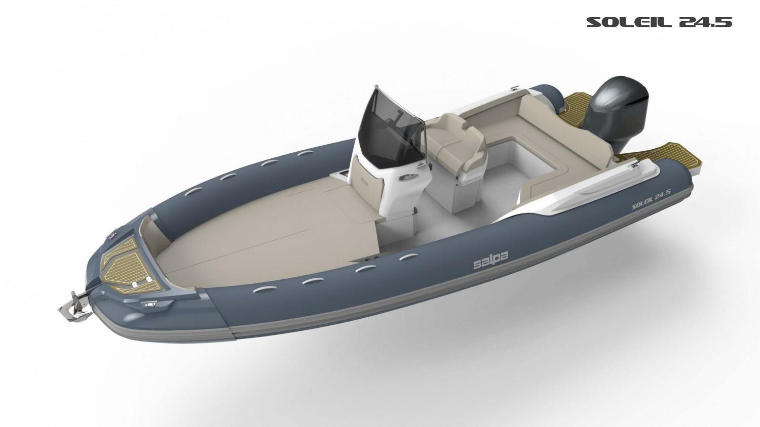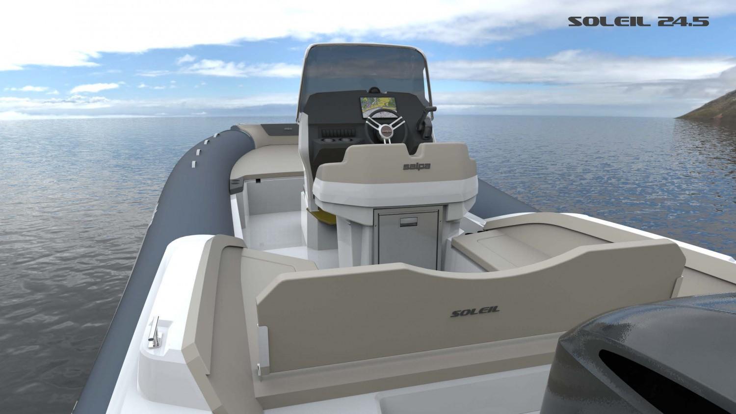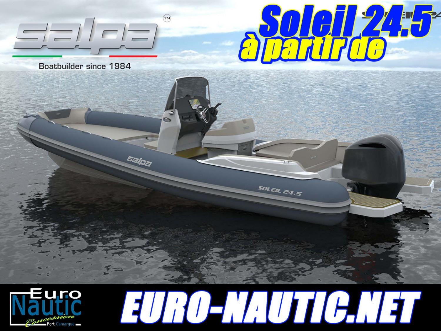 Euronautic PORT CAMARGUE est très heureux de vous présenter le tout NOUVEAU SALPA Soleil 24.5 , un semi-rigide de 7,80m avec une longueur de coque de 6,99m, donc pas de TAXE !!! Et pourtant il a tout d'un très grand...Comme à son habitude, la gamma SOLEIL propre un immense bain de soleil avant avec une grand coffre dessous, mais aussi un carré arrière avec table transformable en un second gigantesque bain de soleil.Un poste de pilotage très ergonomique et une assise cachant un évier, où il est possible d'y installer un frigidaire.Du coté des performances, ce SALPA Soleil 24.5 ne nécessitera pas une puissance démesurée, sa carène au V profond et son STEP en fond un bateau très agréable et réactif, 200/225cv est recommandé ce qui lui permet d'atteindre les 40 Noeuds.Il est de possible de le motoriser de façon très sportive avec un 350cv, attention les performances !!!Equipements au STANDARD:•Gelcoat carène et pont blanc•Plages de bain arrière avec échelle télescopique et main courante inox•Sellerie complète avec bain de soleil avant•Pompe de cale automatique•Meuble de cuisine •Réservoir à carburant inox 280 litres•Console de pilotage avec tableau de bord, pare·brise, volant et direction hydraulique•Feux de navigation•Corne de brume •4 taquets d’amarrage Inox •Installation électrique à disjoncteurs magnétothermiques •Davier inox•Douchette de pont , evier et réservoir d'eau (50l.) Equipements en OPTION:•Guindeau électrique, Mouillage complet, ancre & jonction inox•Implantation double batterie (sans batteries)•Frigo Inox cockpit à tiroir 40L•Frigo Inox cockpit à ouverture latérale 40L•Plan de cuisson Gaz•Gonfleur électrique 12V•Combine GPS/Sondeur Garmin 6 pouces avec sonde tableau AR•Pack stéréo marine FUSION + kit BT + 2 HP extérieurs étanches•VHF fixe GARMIN AIS/DSC avec antenne•Chargeur de batteries + installation 220V + cable de quai•Kit complément de bain de soleil AR + Table•Bimini sur arceaux inox avec jambes de force•Roll bar INOX + taud de soleil Sunbrella•Projecteur LED sur Roll bar•Taud de protection console et poste de pilotage•Taud de protection intégral•Gelcoat coque BLACK, MILITARY GREY•Teck synthétique •Sellerie Spradling Silvertex Macadamia ou Champagne •Mat de ski nautique amovibleFiche produitEssai presseVIDEOPour tout DEVIS personnalisé, n'hésitez pas à nous consulter, Financement LOA sur étude, remorque possible...Bateau semi-rigide similaire à: Zodiac, Bombard, Zar, Capelli Tempest, BRIG, Tarpon, BWA, Sillinger, Valiant, BSC, 3D Tender, Ranieri, Quicksilver, Master, Sea hawkNos secteurs: Port Camargue, Grau du Roi, Grande Motte, Carnon, Palavas, CAP d’Agde, Nîmes, Montpellier, Arle, Ales