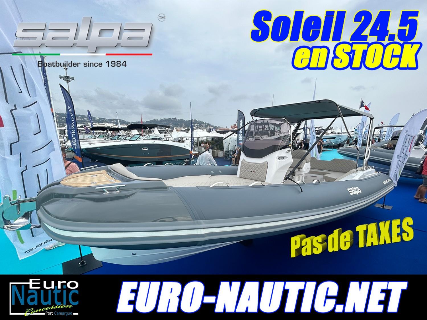 Euronautic PORT CAMARGUE est très heureux de vous présenter le tout NOUVEAU SALPA Soleil 24.5 , un semi-rigide de 7,80m avec une longueur de coque de 6,99m, donc pas de TAXE !!! Et pourtant il a tout d'un très grand...----------------- OFFRE LANCEMENT SALPA Soleil 24.5 en STOCK: 99500€ au lieu de 112009€ -----------------avec le très sobre et performant SUZUKI 200cv à commande électrique et trim automatiqueéquipement du model STOCK:•Gelcoat carène et pont blanc•Sellerie complète avec bain de soleil avant SILVERTEX couleur MACADAMIA•Plages de bain arrière avec échelle télescopique et main courante inox•Pompe de cale automatique•Meuble de cuisine •Réservoir à carburant inox 280 litres•Console de pilotage avec tableau de bord, pare·brise, volant et direction hydraulique•Feux de navigation•Corne de brume •4 taquets d’amarrage Inox •Installation électrique à disjoncteurs magnétothermiques •Davier inox•Douchette de pont , evier et réservoir d'eau (50l.)•Guindeau électrique, Mouillage complet, ancre & jonction inox•Implantation double batteries•Kit complément de bain de soleil AR + Table•Roll bar INOX + taud de soleil Sunbrella•Teck synthétique complet BIONDO joint BLANCOptions possibles:•Combine GPS/Sondeur •Pack stéréo marine FUSION + kit BT + 2 HP extérieurs étanches•VHF fixe GARMIN AIS/DSC avec antenne•Frigo Inox cockpit à tiroir 40L•Frigo Inox cockpit à ouverture latérale 40L•Plan de cuisson Gaz•Taud de protection console et poste de pilotageComme à son habitude, la gamma SOLEIL propre un immense bain de soleil avant avec une grand coffre dessous, mais aussi un carré arrière avec table transformable en un second gigantesque bain de soleil.Un poste de pilotage très ergonomique et une assise cachant un évier, où il est possible d'y installer un frigidaire.Du coté des performances, ce SALPA Soleil 24.5 ne nécessitera pas une puissance démesurée, sa carène au V profond et son STEP en fond un bateau très agréable et réactif, 200/225cv est recommandé ce qui lui permet d'atteindre les 40 Noeuds.Il est de possible de le motoriser de façon très sportive avec un 350cv, attention les performances !!!Fiche produitEssai presseVIDEOPour tout DEVIS personnalisé, n'hésitez pas à nous consulter, Financement LOA sur étude, remorque possible...Bateau semi-rigide similaire à: Zodiac, Bombard, Zar, Capelli Tempest, BRIG, Tarpon, BWA, Sillinger, Valiant, BSC, 3D Tender, Ranieri, Quicksilver, Master, Sea hawkNos secteurs: Port Camargue, Grau du Roi, Grande Motte, Carnon, Palavas, CAP d’Agde, Nîmes, Montpellier, Arle, Ales