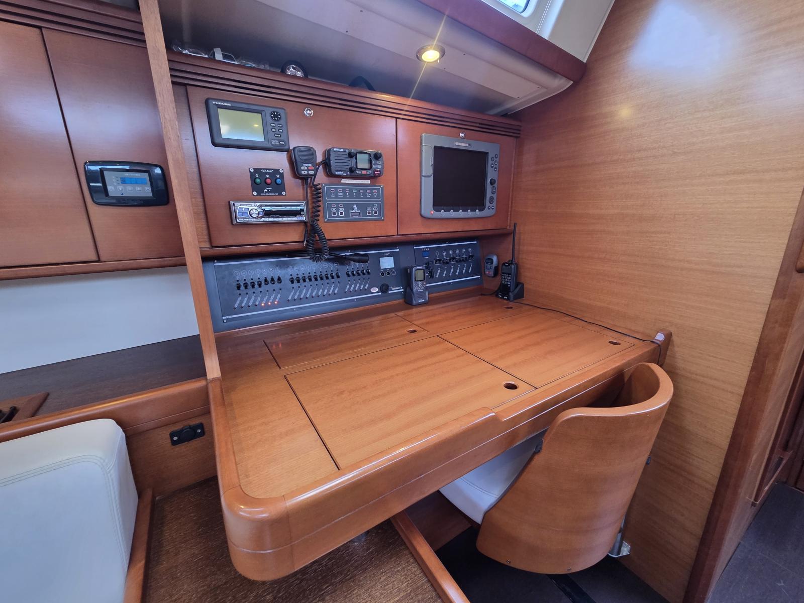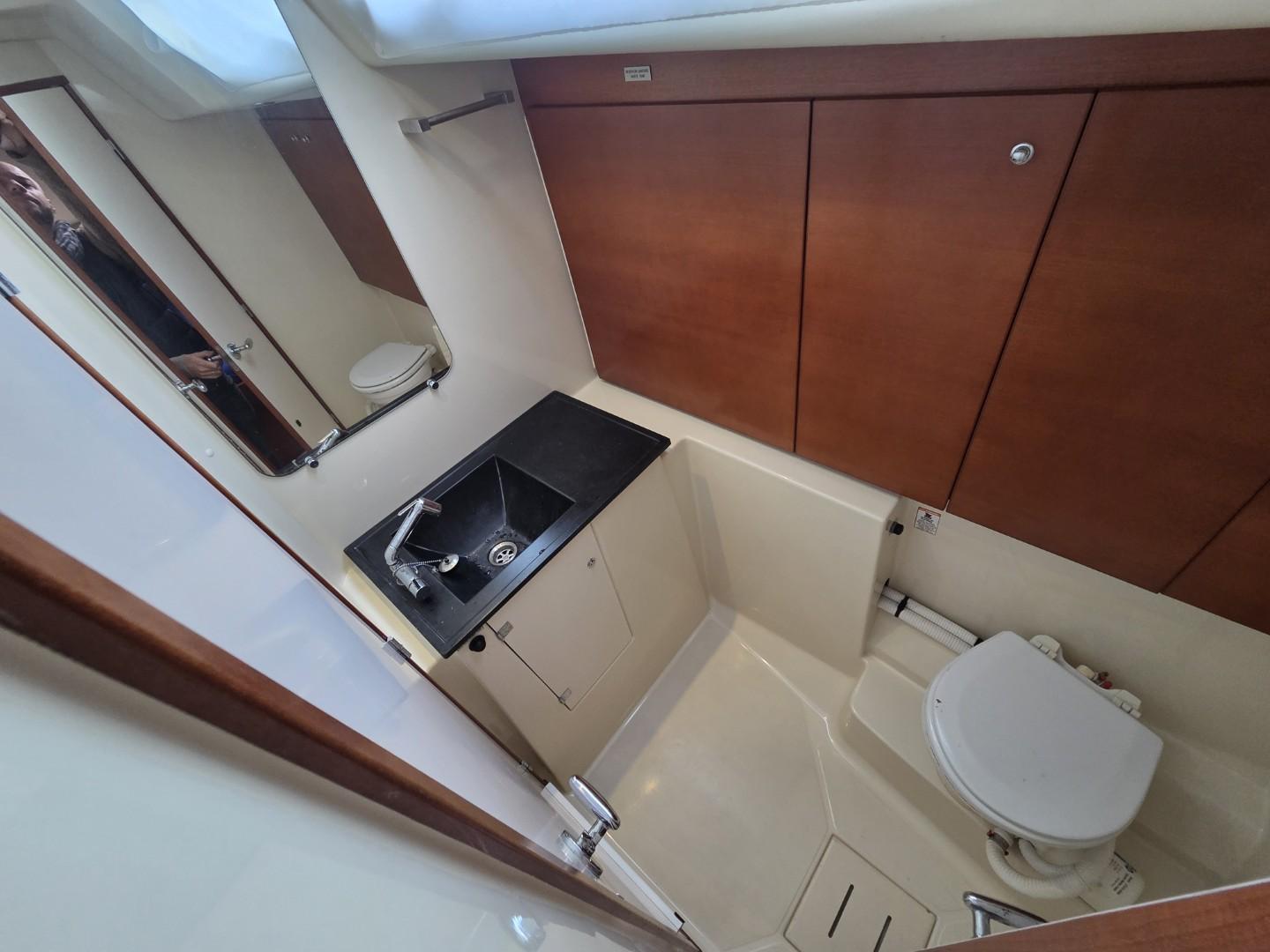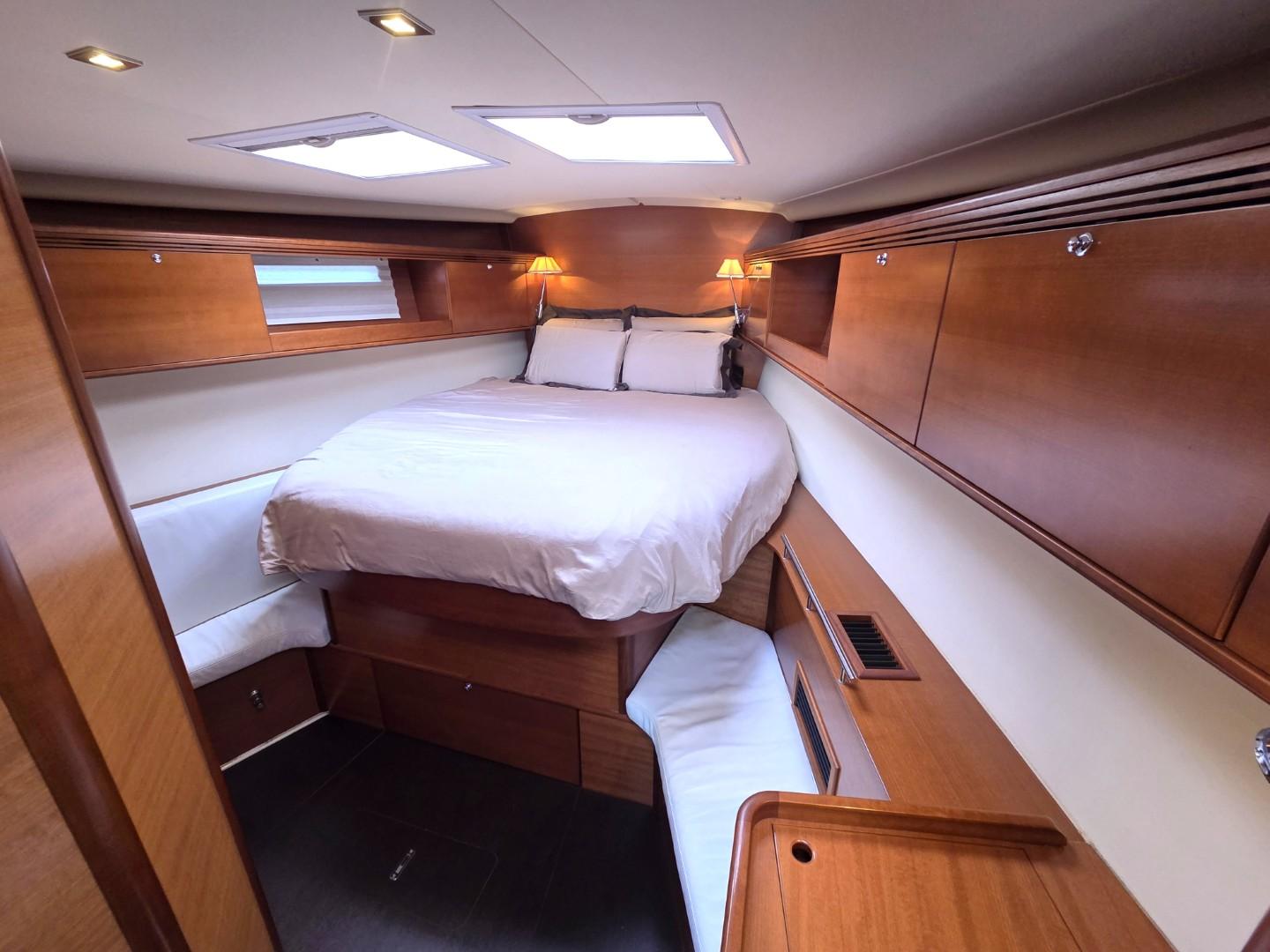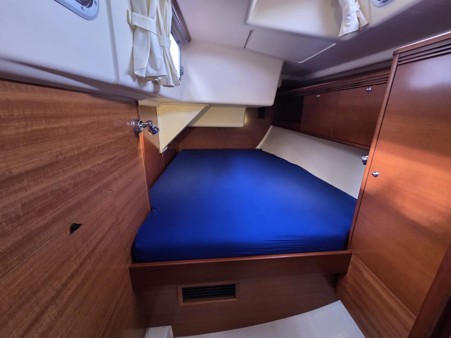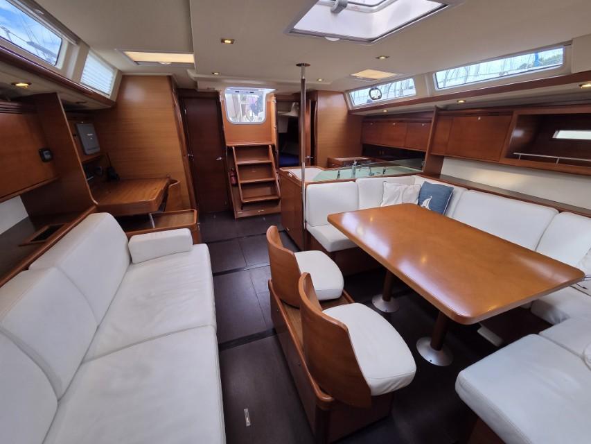 Les aménagements intérieurs de ce Dufour 485 Grand Large offrent un équilibre parfait entre confort, fonctionnalité et élégance contemporaine. La version trois cabines propose une spacieuse cabine armateur à l’avant, véritable suite privée avec lit central, nombreux rangements et salle d’eau attenante avec douche séparée. À l’arrière, deux cabines doubles accueillent les invités dans un confort optimal, accompagnées d’une seconde salle d’eau accessible depuis le carré. Le carré lumineux bénéficie d’un vaste espace de vie avec cuisine en L parfaitement équipée, table à cartes ergonomique et grande table à manger entourée de banquettes en vis à vis. L’ensemble est sublimé par une finition en bois wengé qui confère une atmosphère chaleureuse et raffinée à bord.