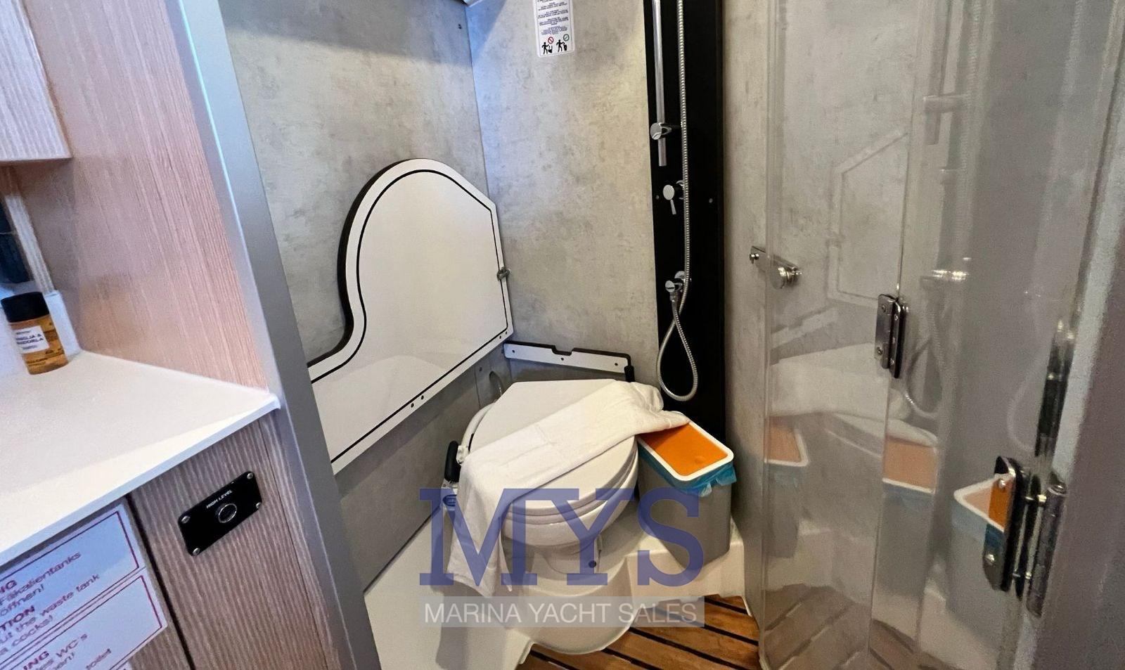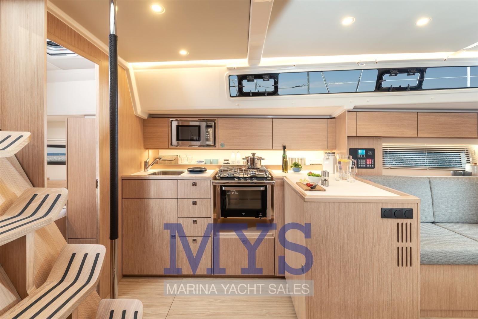 Alarme moteur, Alarme de pompe de cale, Eau sous pression, Douche de cockpit, Double barre à roue, Éclairage de courtoisie, Plateforme arrière, Pompe de cale automatique, Pompe de cale manuelle, Porte latérale, Cockpit en teck, Prise de quai, Guindeau électrique, Gréement monotoron, Echelle de bain, table de cockpit.