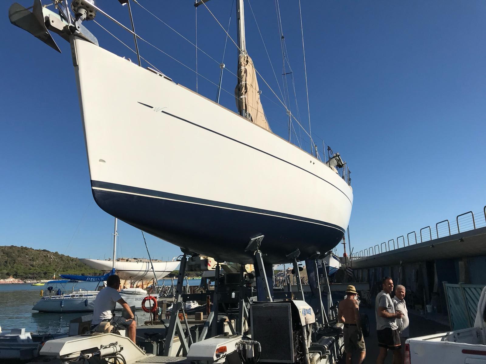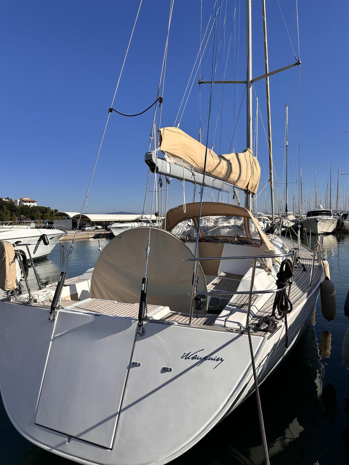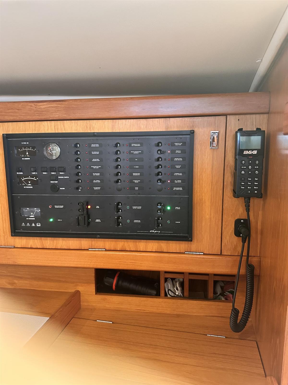Ancre (Delta con 75 m catena nuova), Eau sous pression, Radeau de sauvetage (scadenza 2028), 3 Batteries (2 service, 1 motore tot 360 amp/h 2025), Passavant en teck, Douche de cockpit, Passerelle (Carbonio con teak), Pompe de cale automatique, Pont en teck, Porte latérale, Cockpit en teck, Prise de quai, Onduleur, Guindeau électrique, Gréement Rod (Nuovo 2026), Echelle de bain, table de cockpit (In teak pieghevole), Filières avec sortie latèrale, 6 Winch (Andersen), Windex.