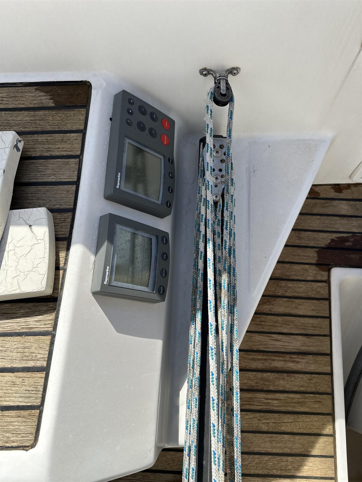 Indicateur d'angle de barre, Sondeur pêche (Autohelm ST 60), Pilote automatique (Autohelm 7000), Plotter GPS (Nuovo 2025 Axiom 9 Rayamrine), Radio VHF (B&G doppia postazione AIS attivo nuovo 2025), Anémomètre/Girouette (Autohelm ST 60).