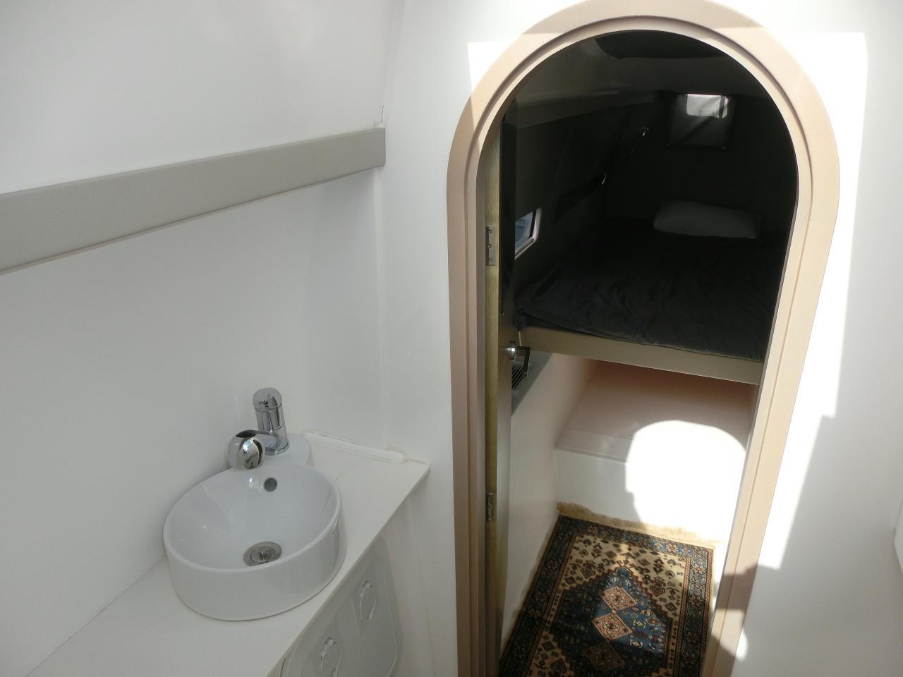 Deux cabines doubles dans les flotteurs ave lavabo, WC électrique à l’eau douce et douche.
