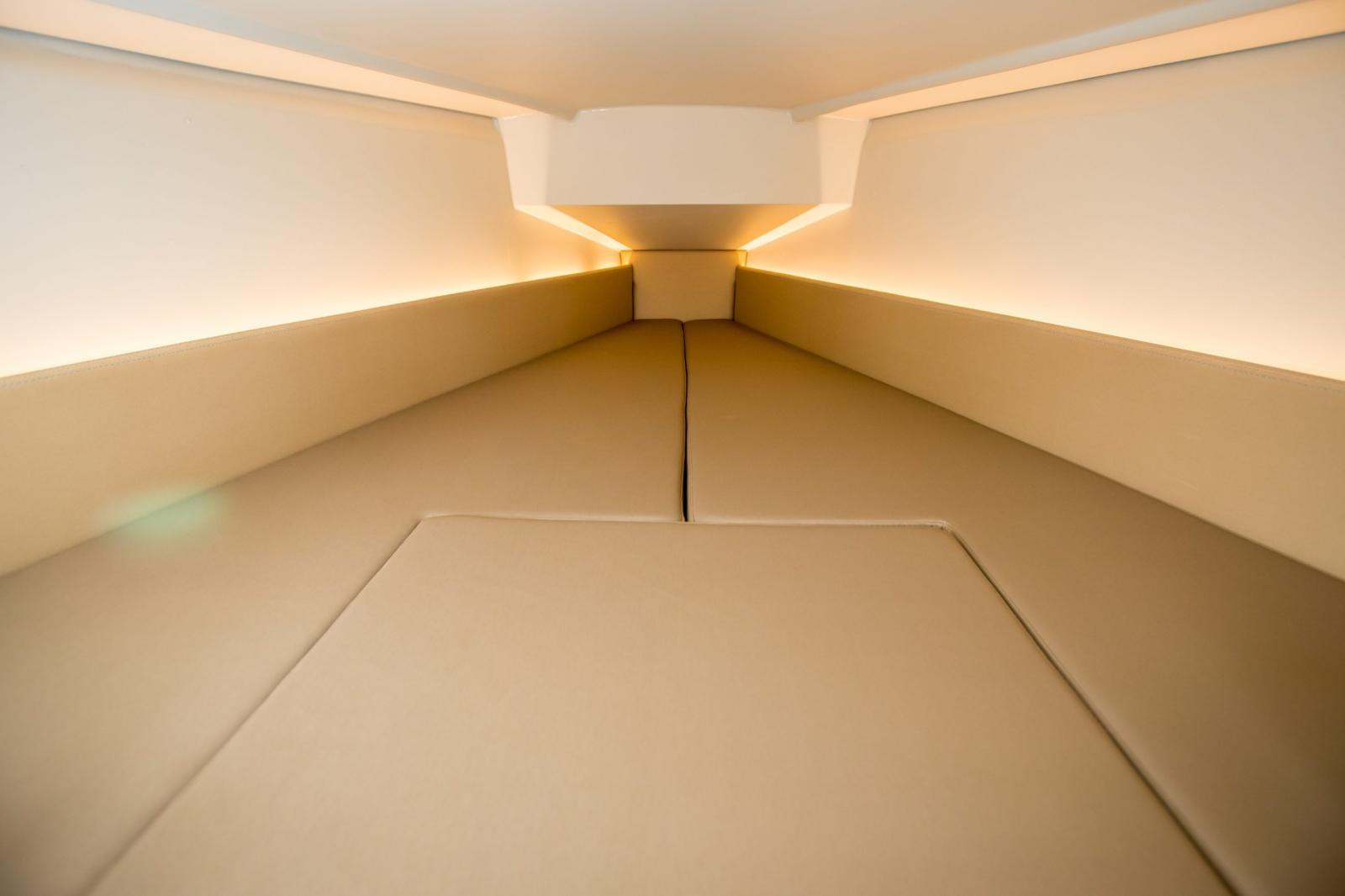 Couchette en V à l'avant (2,20 mètres x 1,65 mètres à hauteur d'épaule).