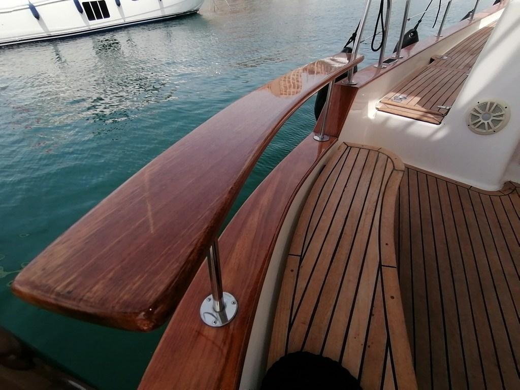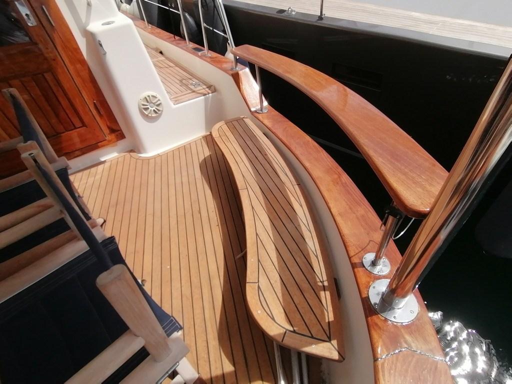 Alarme de pompe de cale, Eau sous pression, Passavant en teck, Couleur spéciale (Blue hull), Douche de cockpit, Double barre à roue, Extincteur(s) fixe(s), Moteur hors-bord pour annexe, Défenses, Passerelle, Pont en teck, Cockpit en teck, Guindeau électrique, Echelle de bain, table de cockpit, Annexe, Pont en teck, Winch électrique arrière.