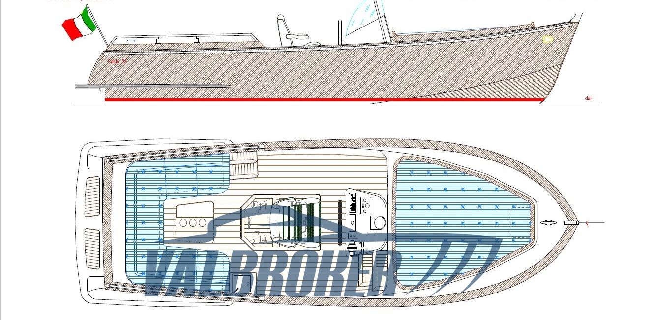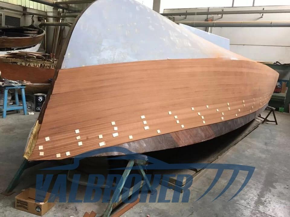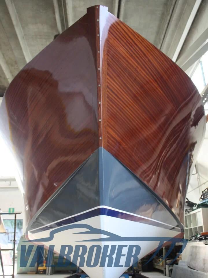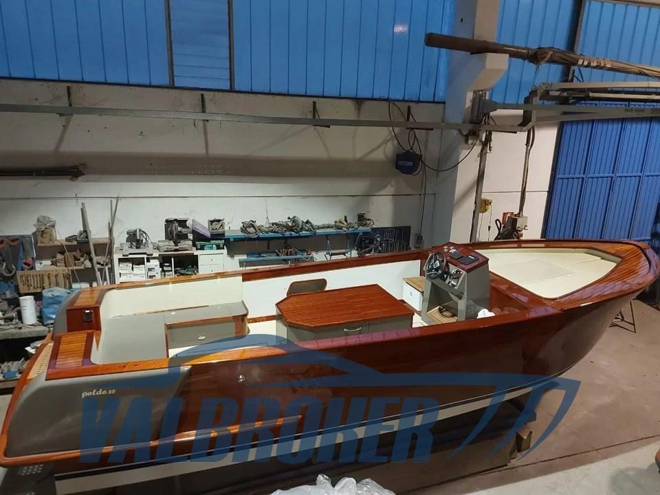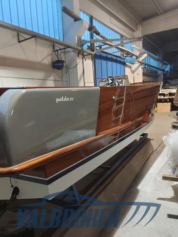 BATEAU NEUF. Poldo 23, le bateau du 70e anniversaire, construit en acajou, chêne et iroko. Équipé d’un moteur diesel in-bord et d’une transmission par axe. Le grand bain de soleil à l’avant, le poste de pilotage avec strapontin pour la conduite debout, le compartiment moteur central, les sièges arrière avec le canapé en forme de « U » et enfin la plate-forme de bain avec grille en teck. Les coussins du bain de soleil avant cachent un grand coffre pour le rangement des gilets de sauvetage et du matériel, qui peut devenir une couchette d’urgence si nécessaire. On y accède par deux marches sur les côtés du tableau de bord. La console est équipée d’instruments de navigation classiques, notamment le tachymètre, le niveau de carburant, la pression d’huile, le compteur d’entretien numérique. Deux batteries de 80 Ah fournissent chacune de l’énergie pour le moteur et les services.