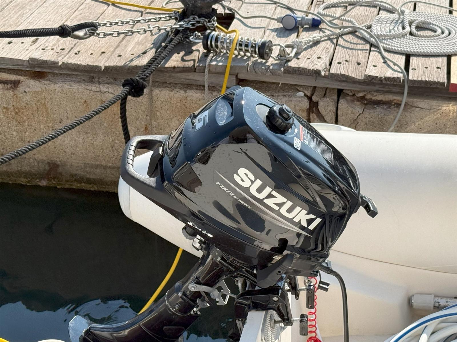Alarme moteur, Alarme de pompe de cale, Alternateur, Ancre (con catena inox + ancora di rispetto), Eau sous pression, 7 Batteries (AGM servizi 2025), Chargeur de batterie (2025), Câble d’alimentation à quai, Filères, Filière, Douche de cockpit, Double barre à roue, Phare de poursuite, Fixation de l’ancre, Flaps hydrauliques, Extincteur(s) fixe(s), Indicateurs de flaps, Lavage de chaine, Lavabo dans le cockpit (Sul FLY), Éclairage de courtoisie, Moniteur de batterie, Moteur hors-bord pour annexe (Suzuki 6 hp), 10 Défenses (8 standard + 2 tondi), Passerelle, Plateforme arrière, Pompe de Vidange du Réservoir d’Eaux Usées, Pompe de cale automatique, Pompe de cale manuelle, Porte latérale, Prise de quai, Connexion eau sous pression à quai, Onduleur, Répétiteur électronique, Rollbar, Guindeau électrique (2025), Echelle de bain, Selles pour Annexe, table de cockpit, Annexe, Filières avec sortie latèrale, Corne, Winch électrique arrière, Winch électrique avant.