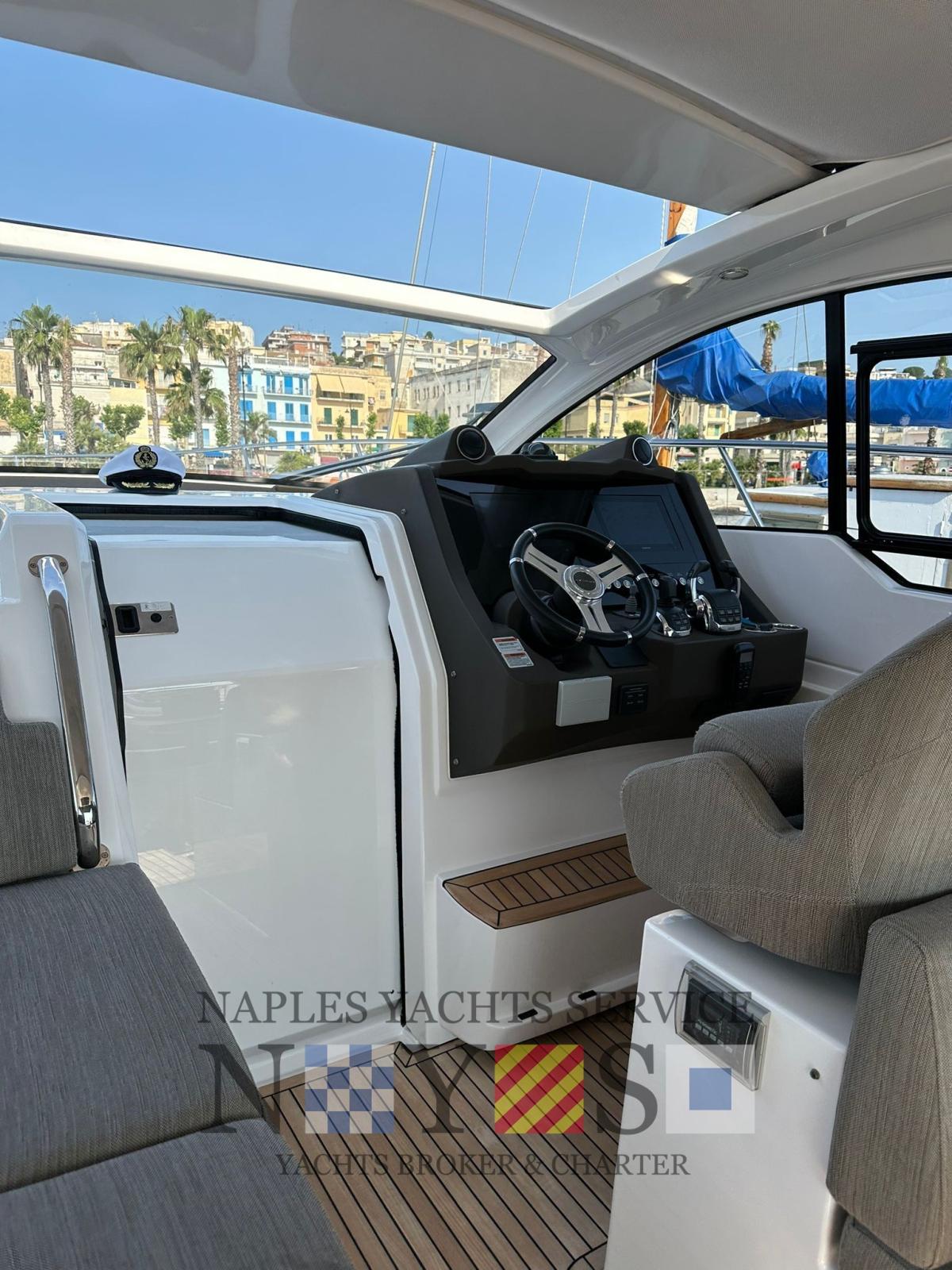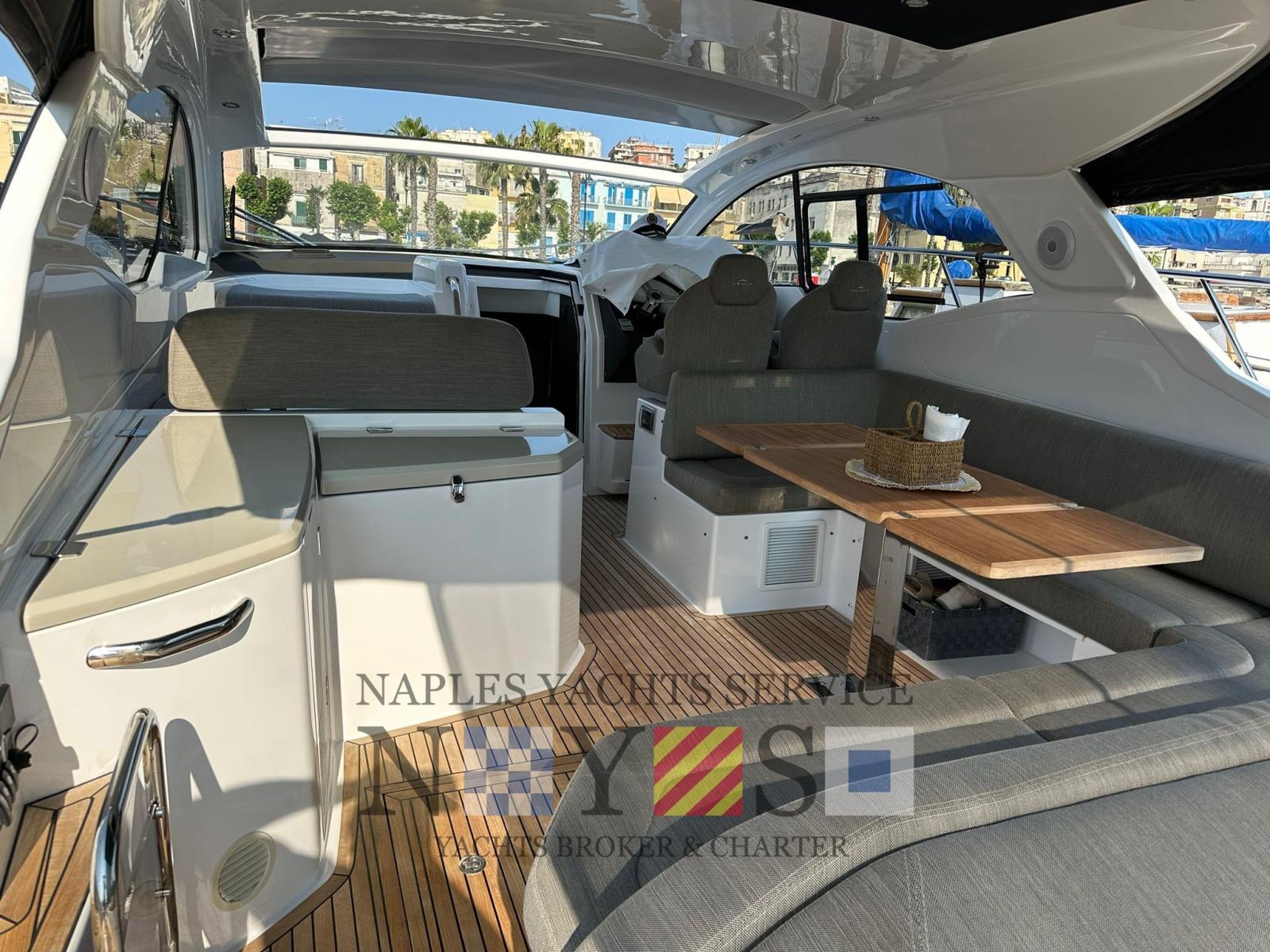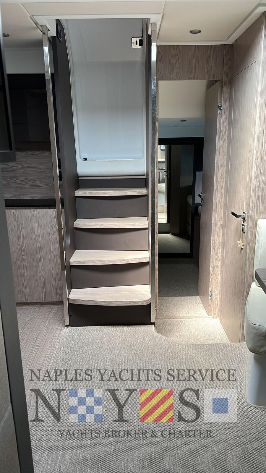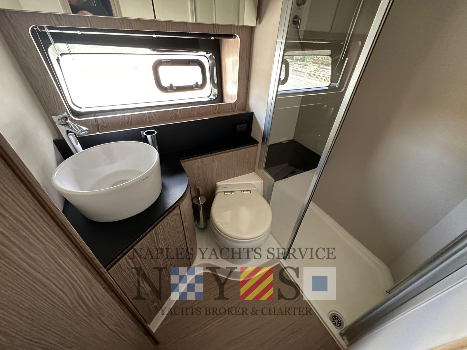 Alarme gaz, Alarme moteur, Alarme de pompe de cale, Auto Dynamic Trim Interceptor (VOLVO PENTA), Eau sous pression, Trim hydraulique, Douche de cockpit, Éclairage de courtoisie, Onduleur, Guindeau électrique, Stabilisateurs (Seakeeper 4 con batteria litio dedicata), table de cockpit, T-Top.