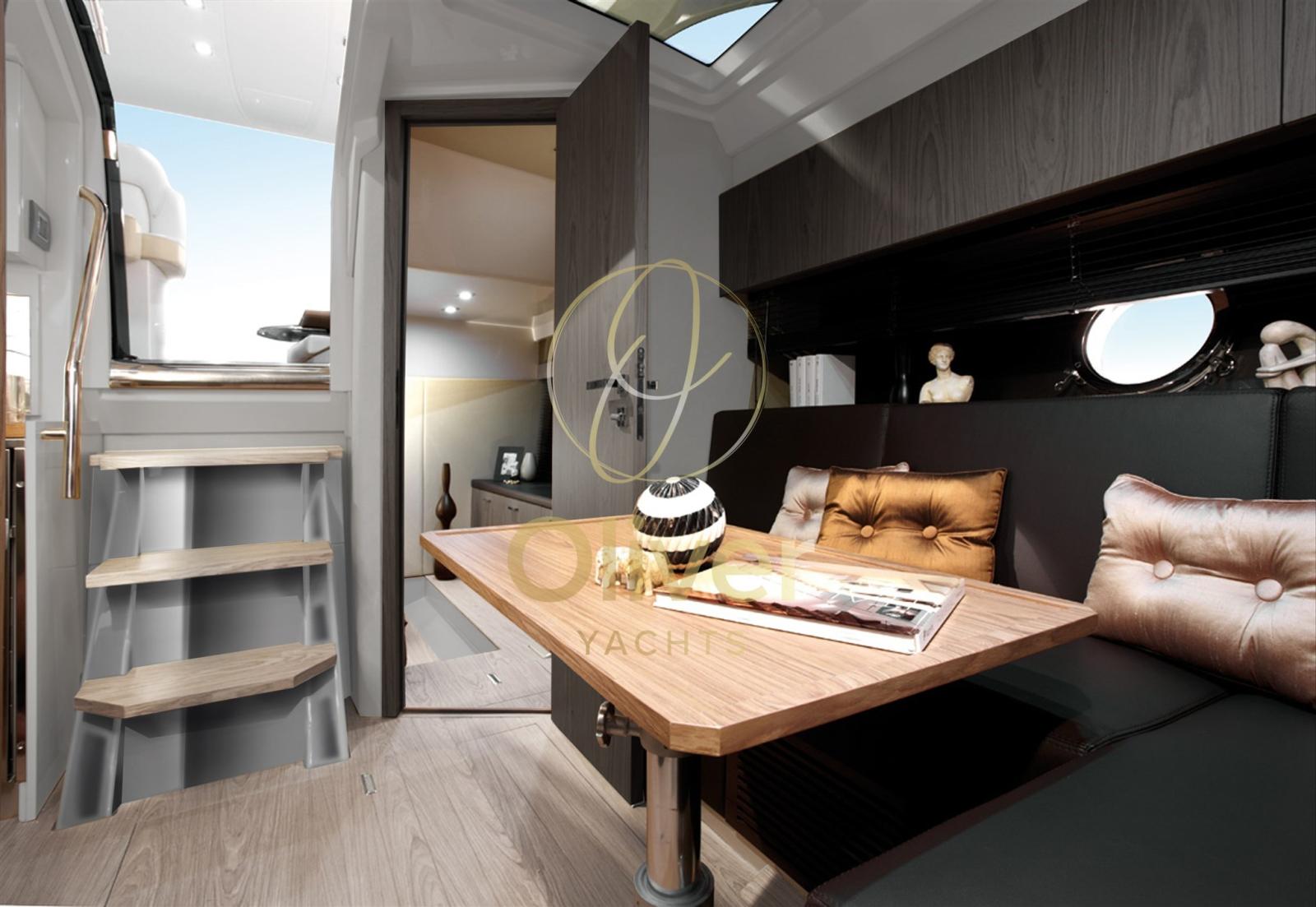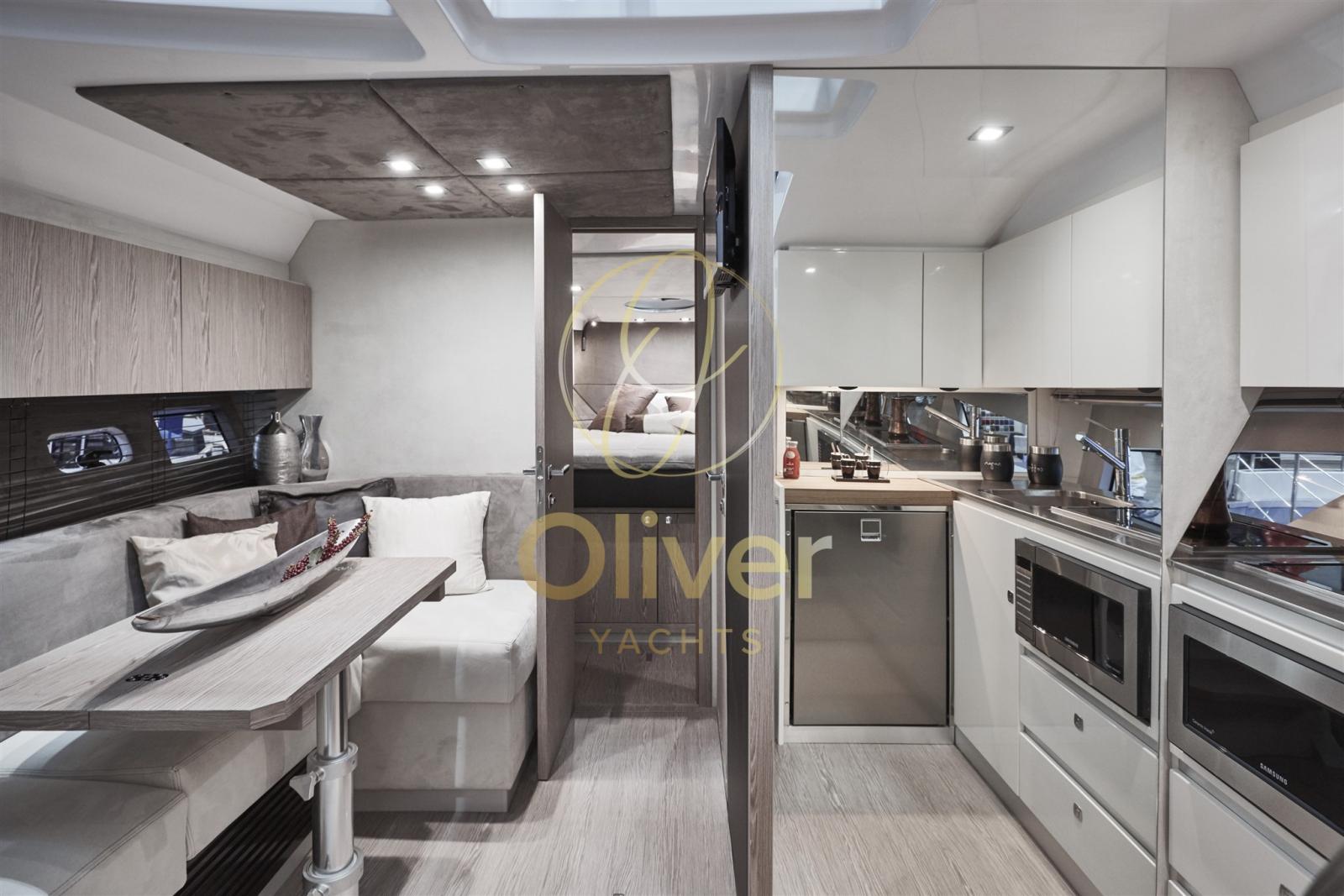 La dînette et la cuisine intérieure sont conçues pour offrir confort et fonctionnalité : grands canapés, table conviviale convertible, cuisine équipée d’une plaque de cuisson, d’un évier, d’un réfrigérateur et de compartiments de rangement. À l’extérieur, dans la zone du cockpit, un bar complet soutient les déjeuners et les apéritifs en plein air sans sacrifices. Tout est fini en bois précieux, en acier satiné et en tissus de qualité.